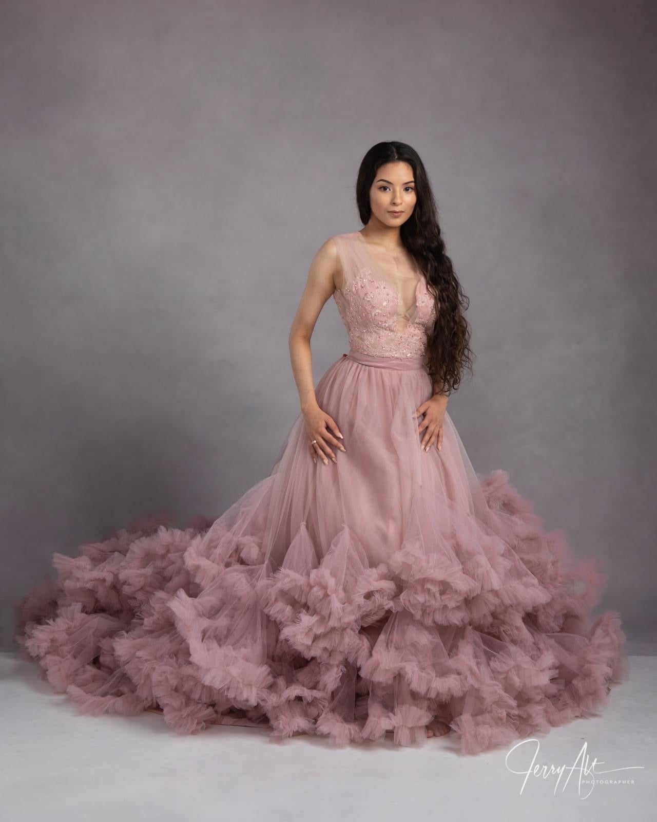 Alina Ruffle Skirt features 12 layers of tulle with layers of fun ruffles draped all the way around this adult skirt features a stunning train and more layers than the children's version. Ready for a portrait session or a walk down the aisle.