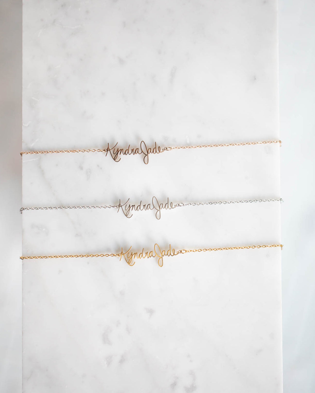 Kyndra jade signature necklace. Stainless steel chain lead and nickel free. Chain is 9" long. available in 3 finishes.