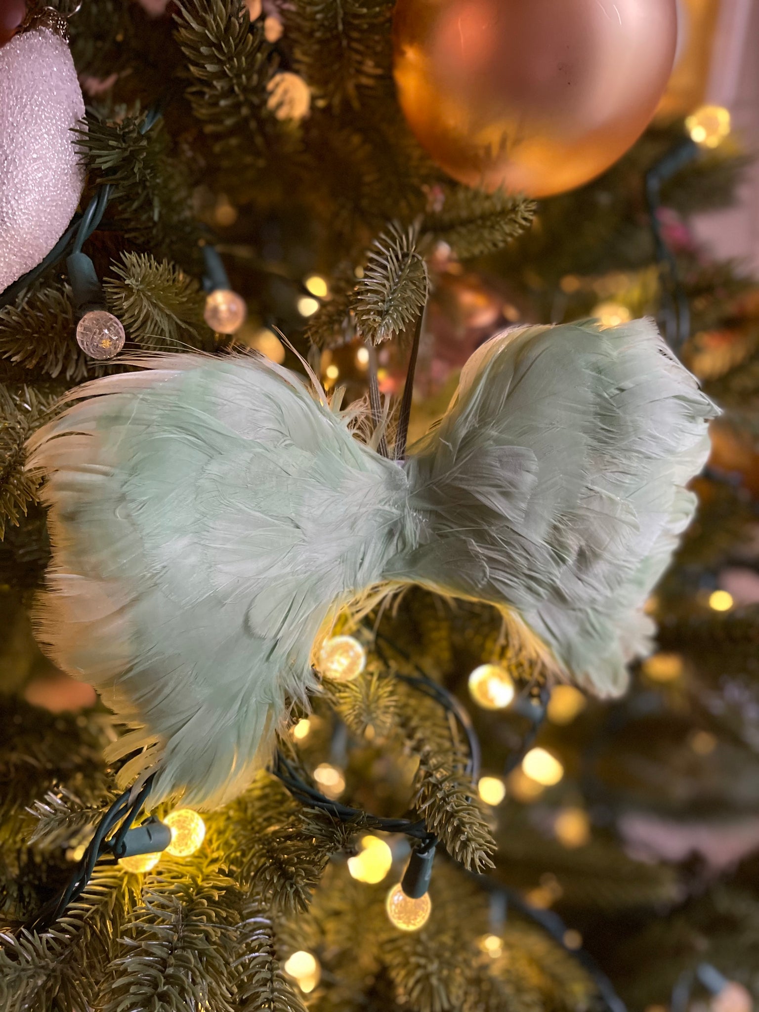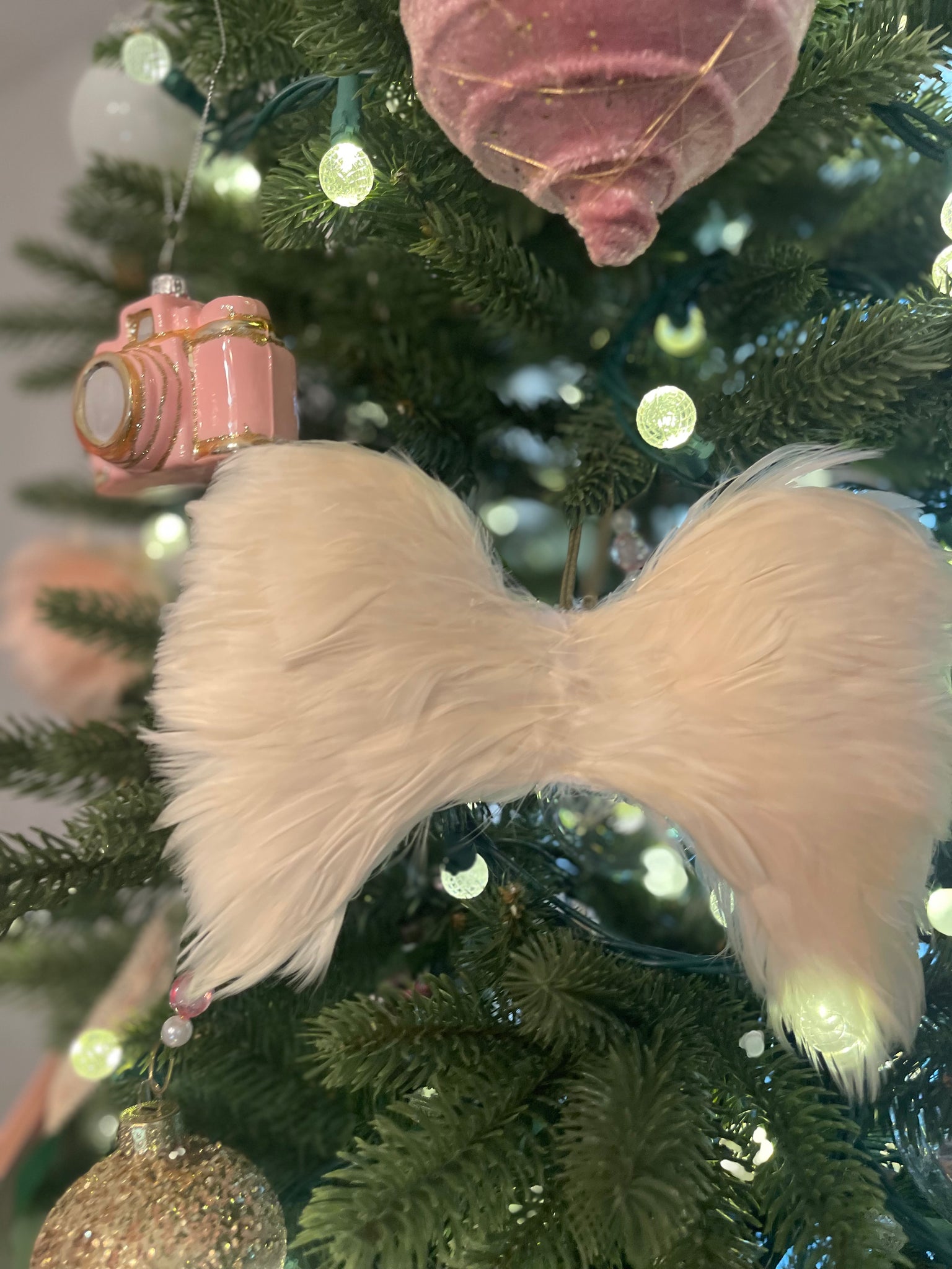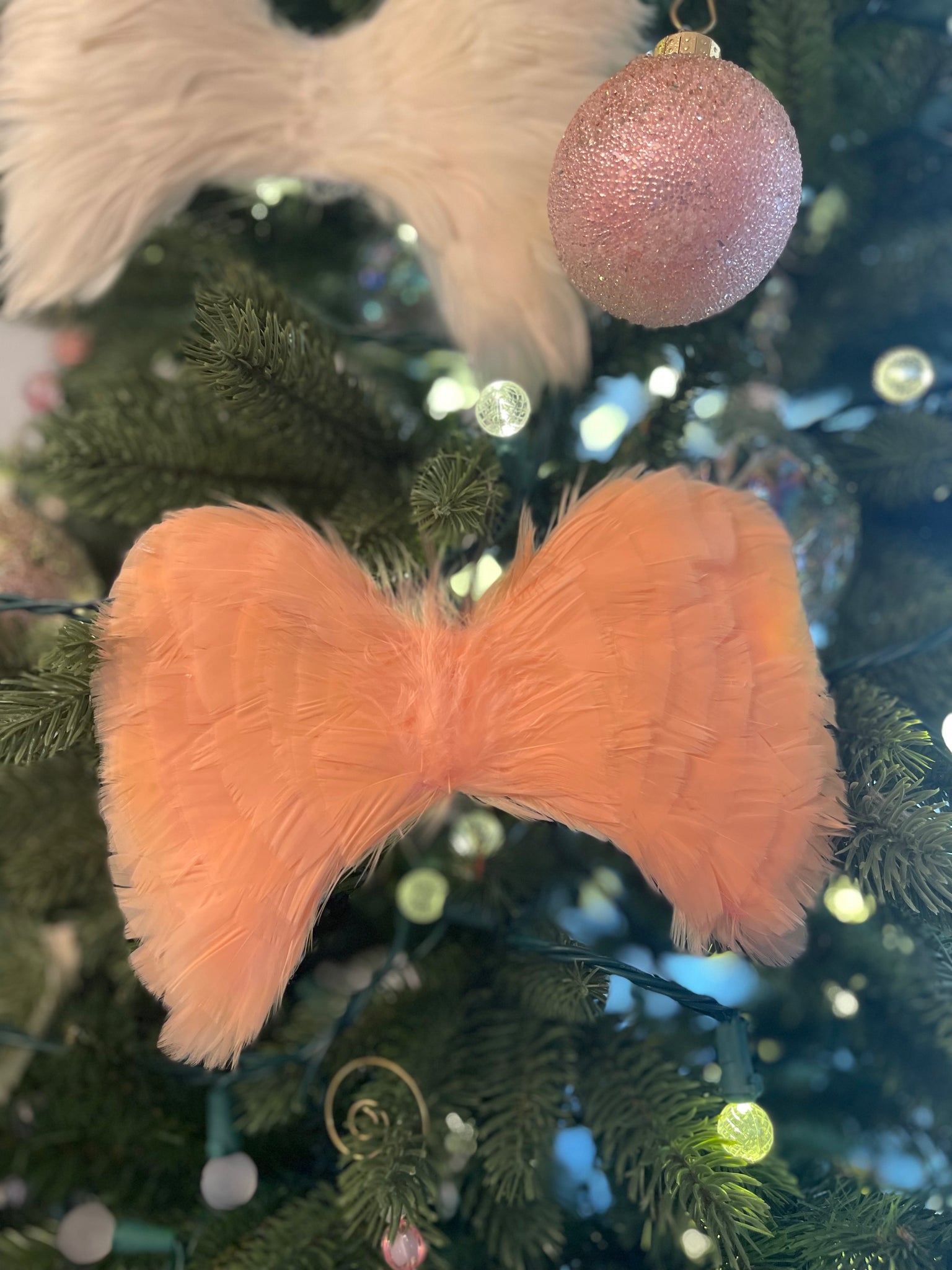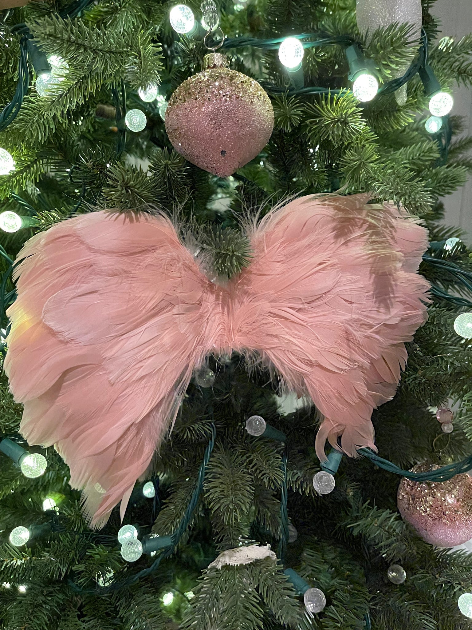 Kyndra Jade handmade angel wing ornaments. A handmade ornament that will make a statement on any tree. Ornaments have a rose gold charm with 2024. If you need a custom year please let us know.