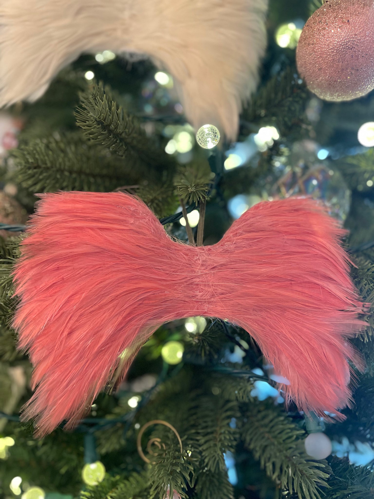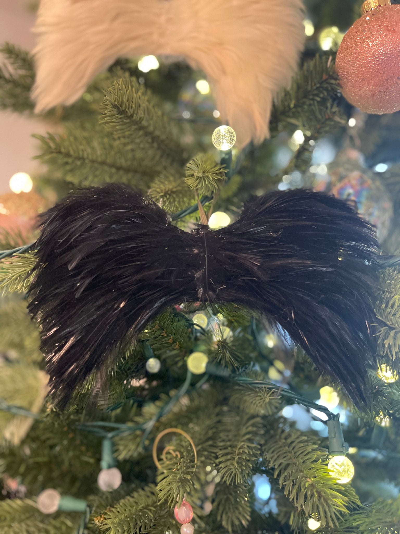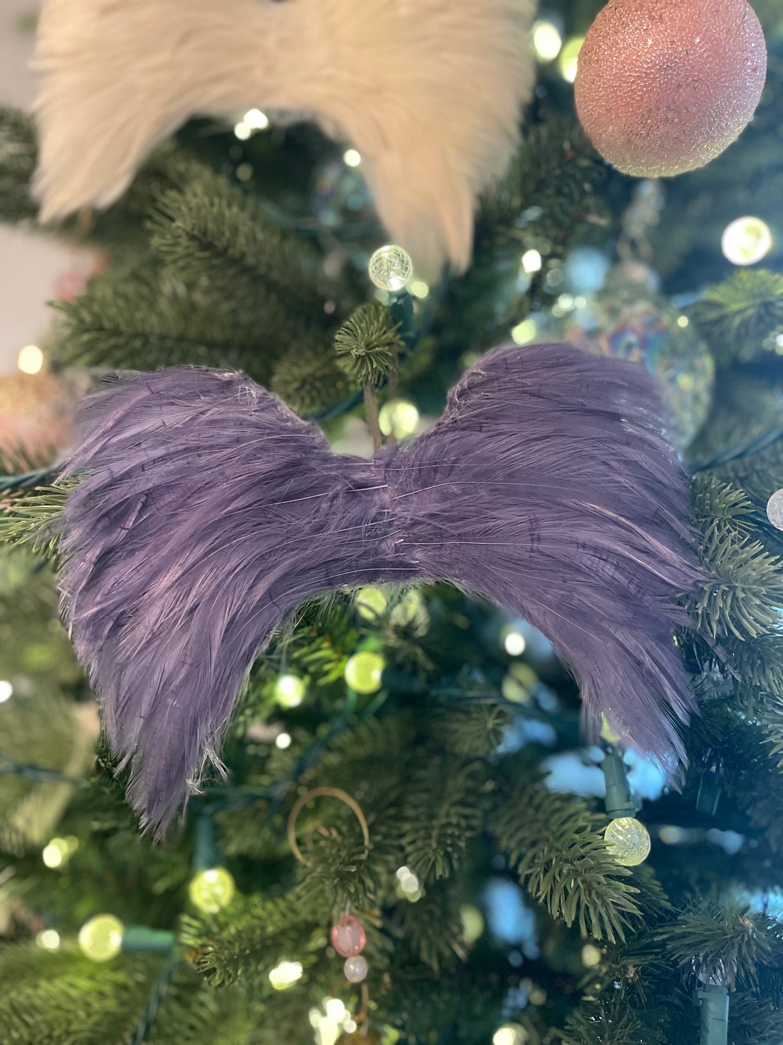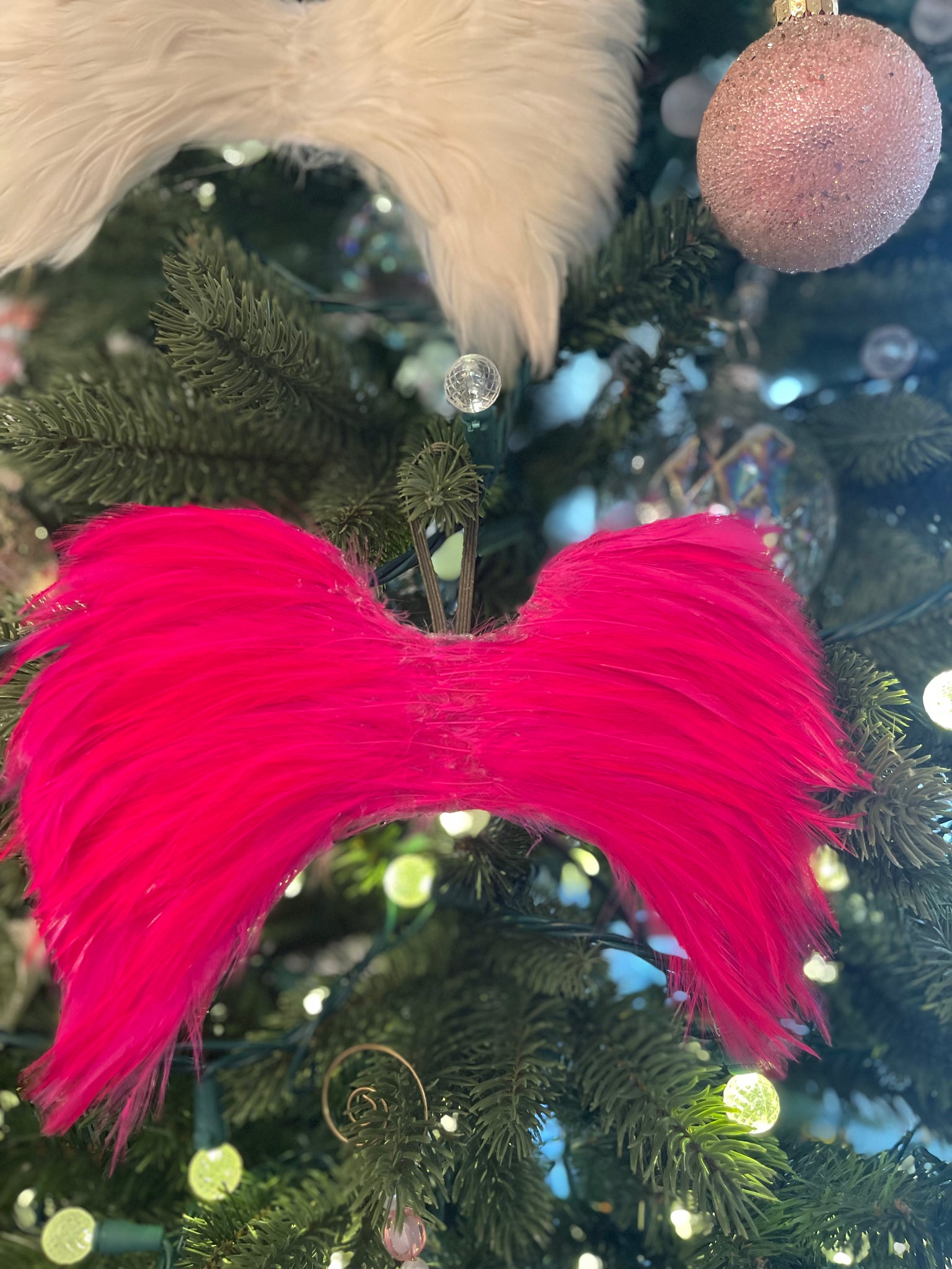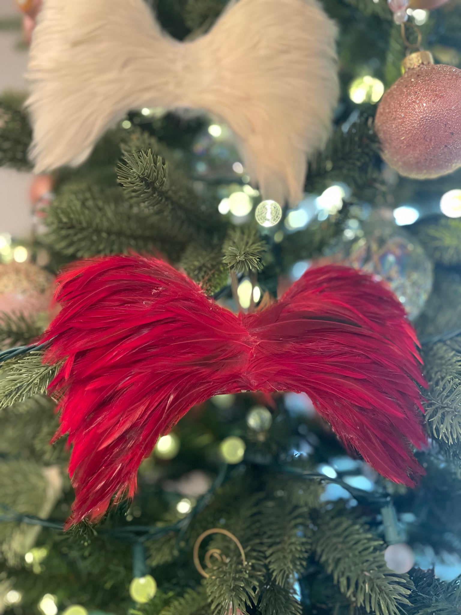 Kyndra Jade handmade angel wing ornaments. A handmade ornament that will make a statement on any tree. Ready to Ship and custom color options available. Please allow 3 business days to process ready to ship orders. 2 weeks to process custom color options. After placing custom order we will email to confirm color options available for this style ornament. No two alike in their handmade nature. The Hillary ornament new style in 2023 similar to the Estelle with a new tiny feather in many new colors.