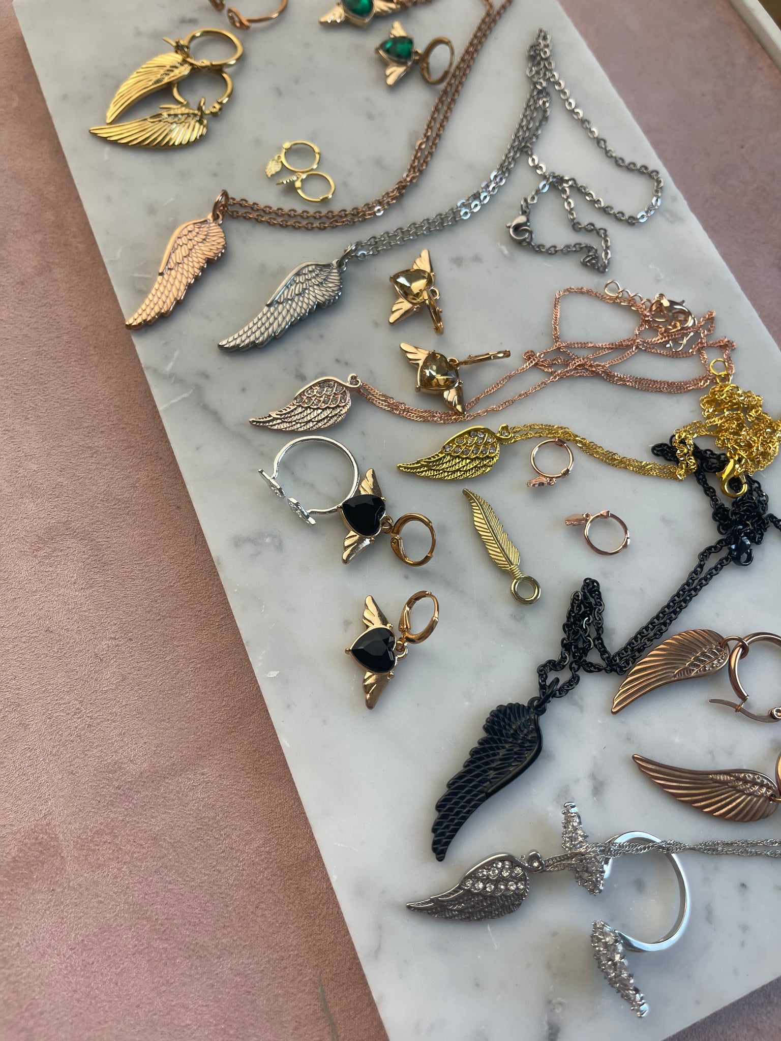 Grab bag jewelry from our never released angel wing jewelry. Stainless steel with gold playing. This 3 piece grab bag will have a necklace, earrings and ring. Will be a mix of gold, silver, rose gold or black. All Sales Final no exchanges