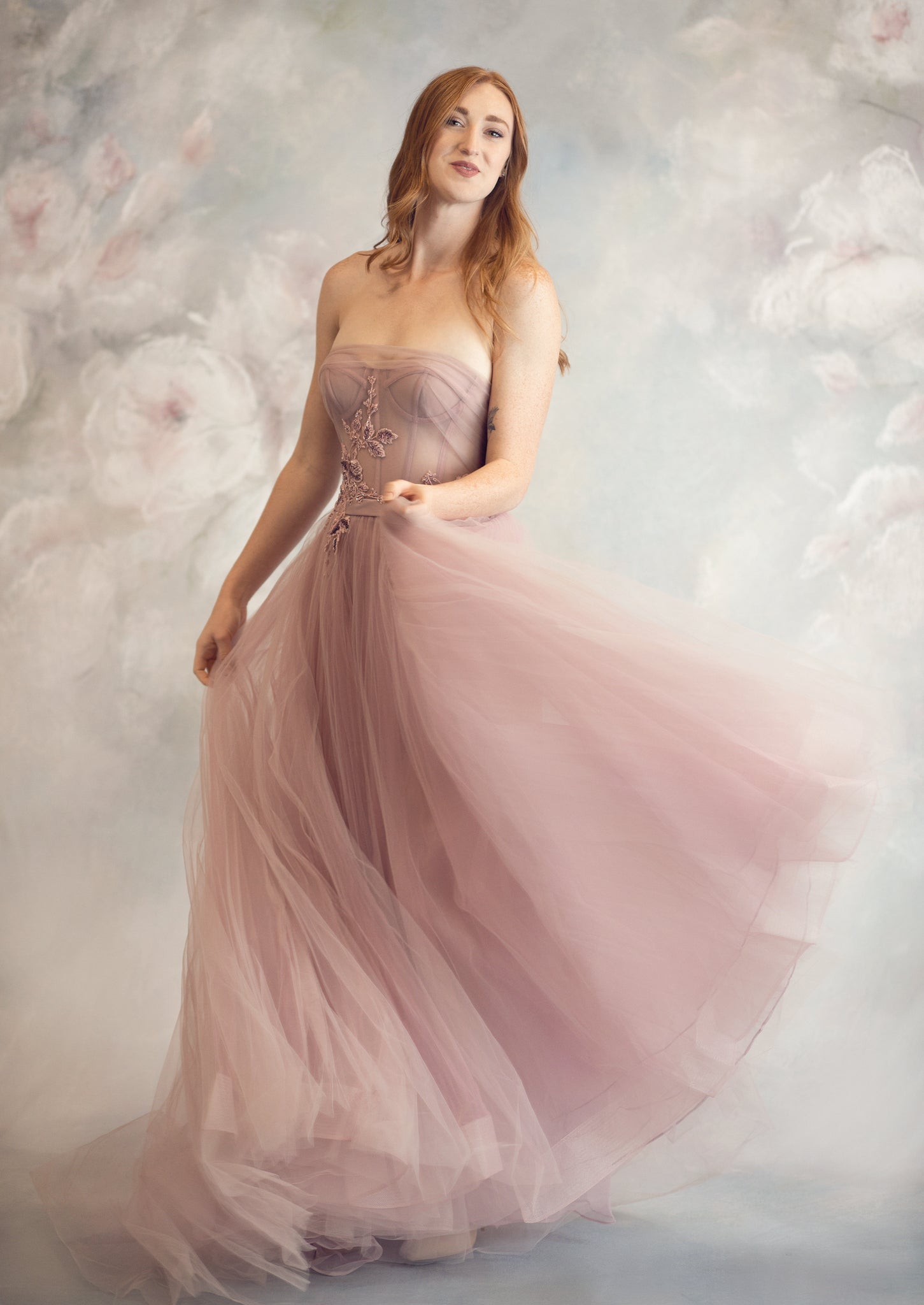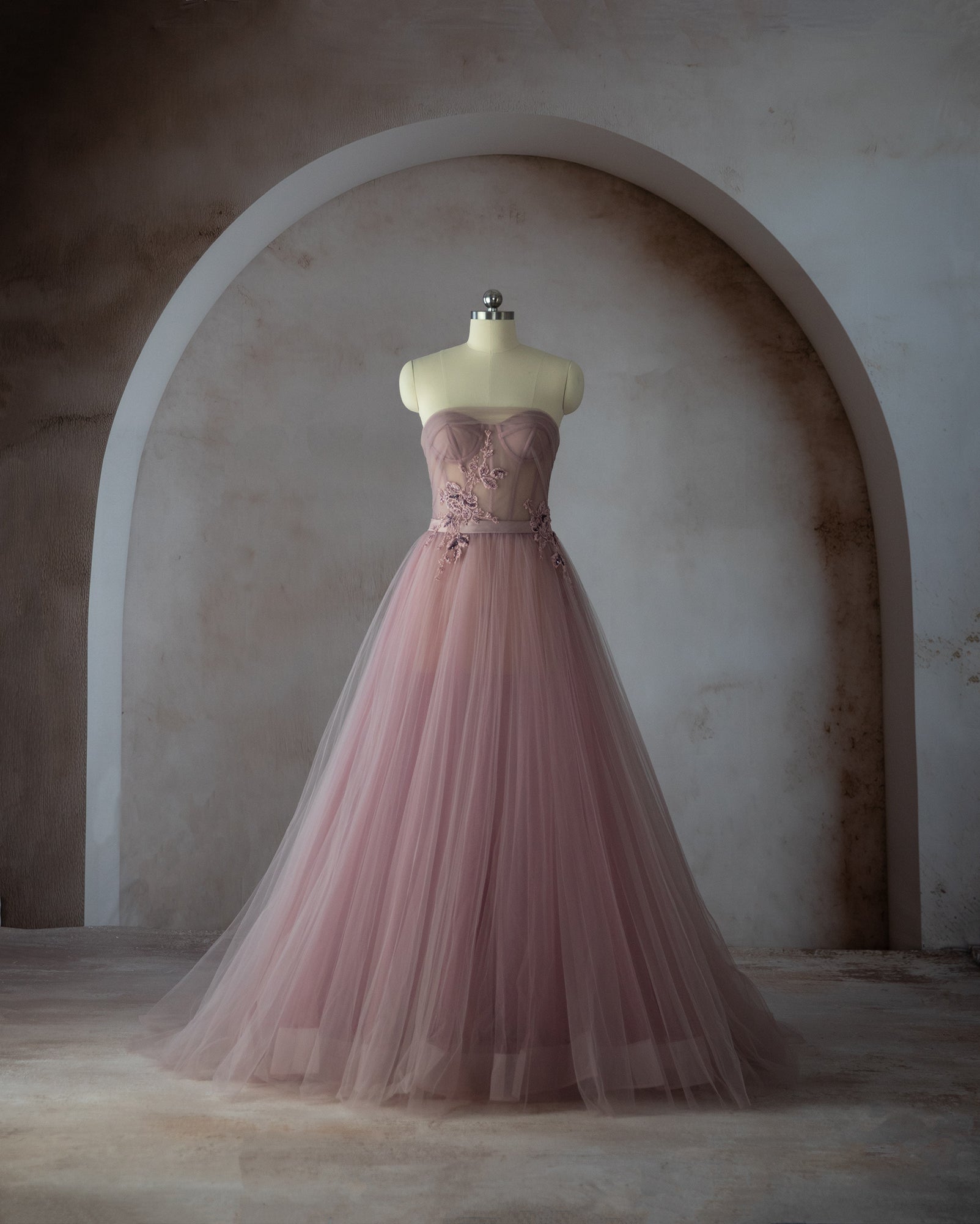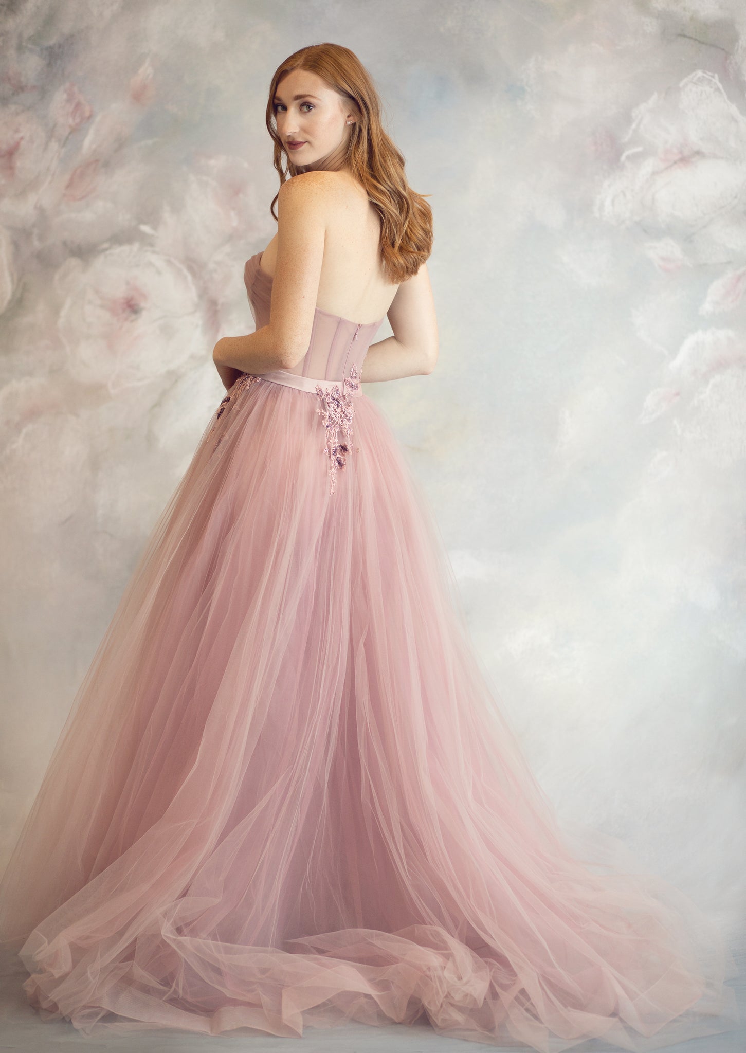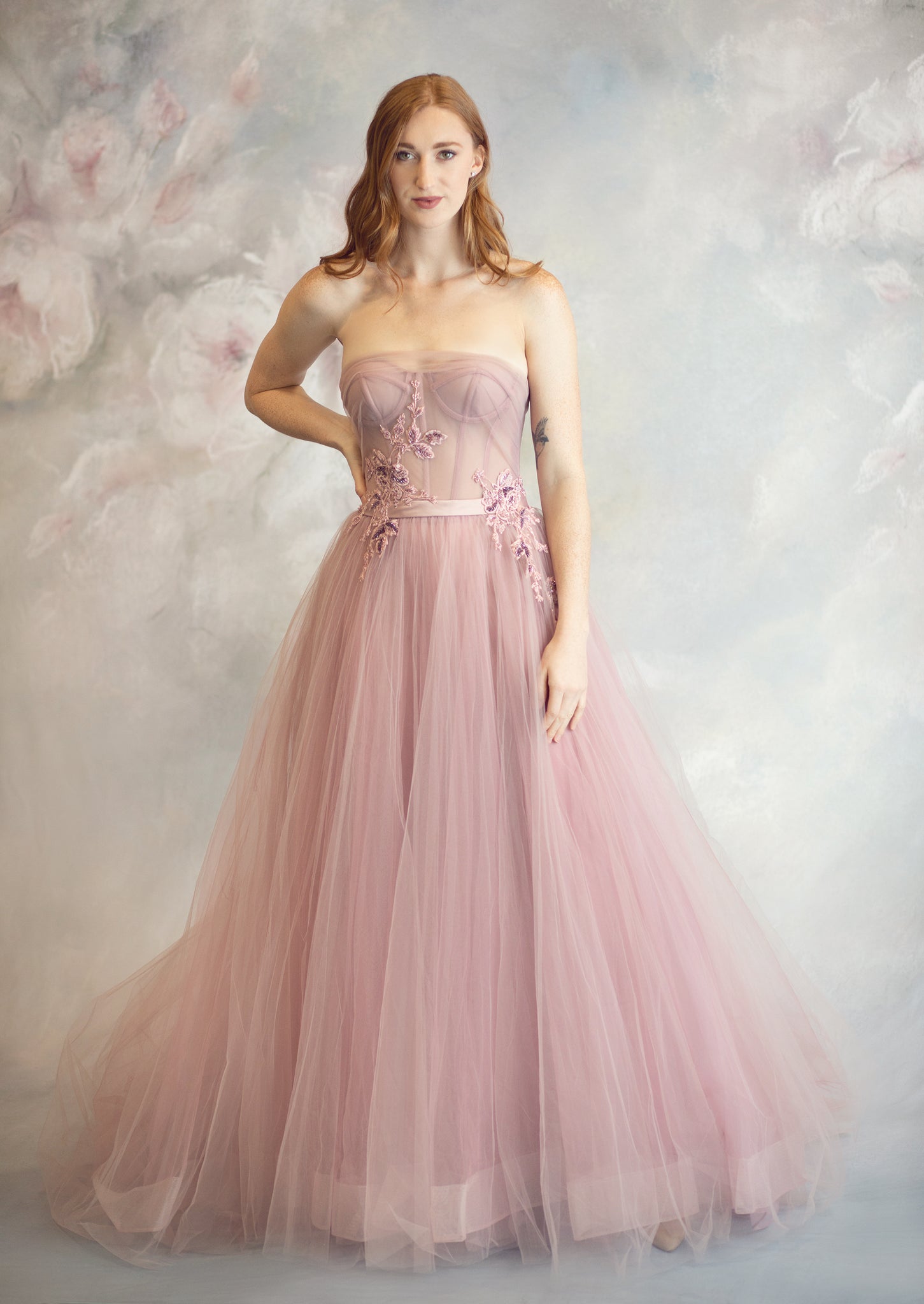 The Monica Gown is a custom made to order gown. Mauve gown with mauve embroidery belt and beaded embroidery. Padded bra top features an invisible zipper.