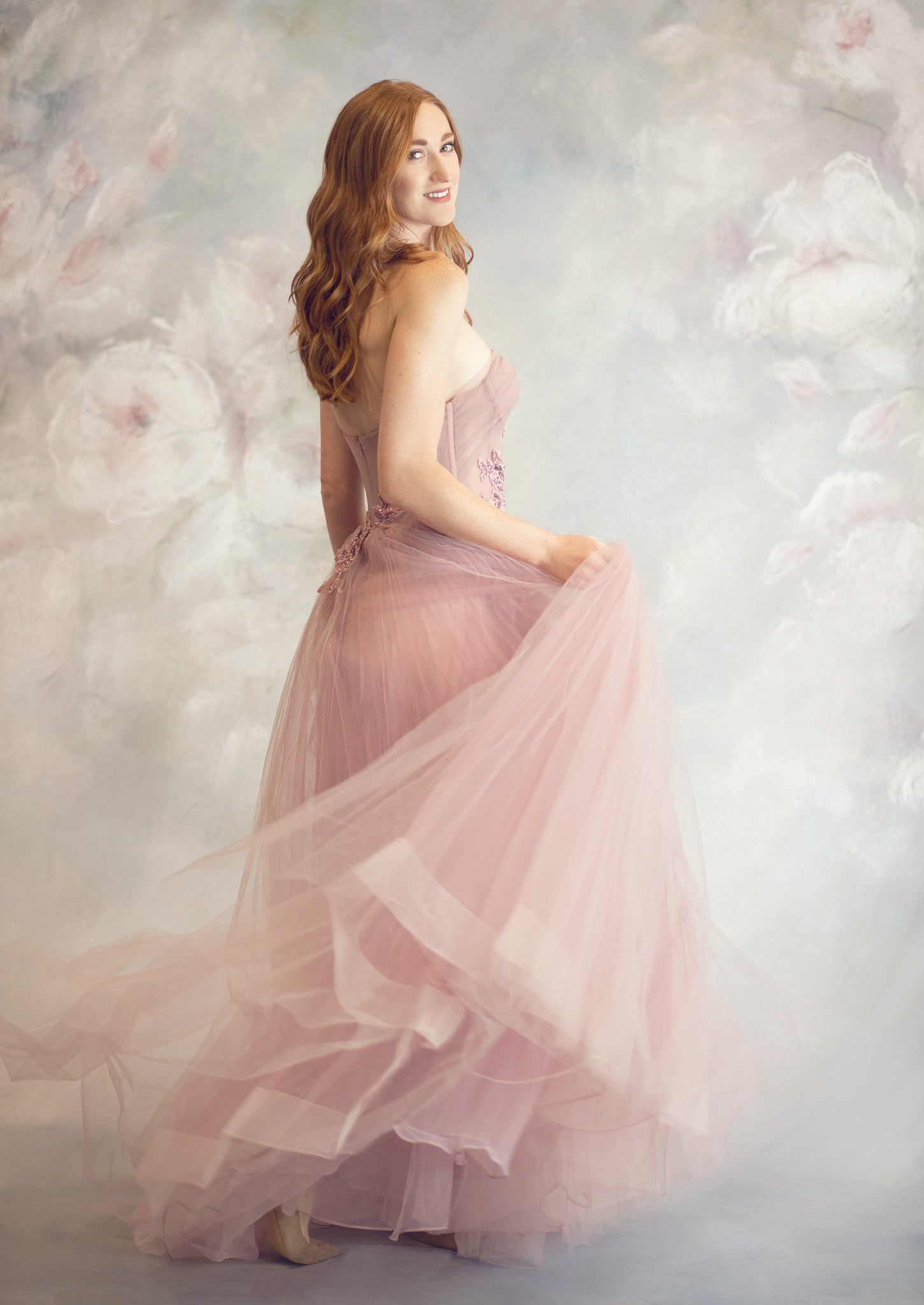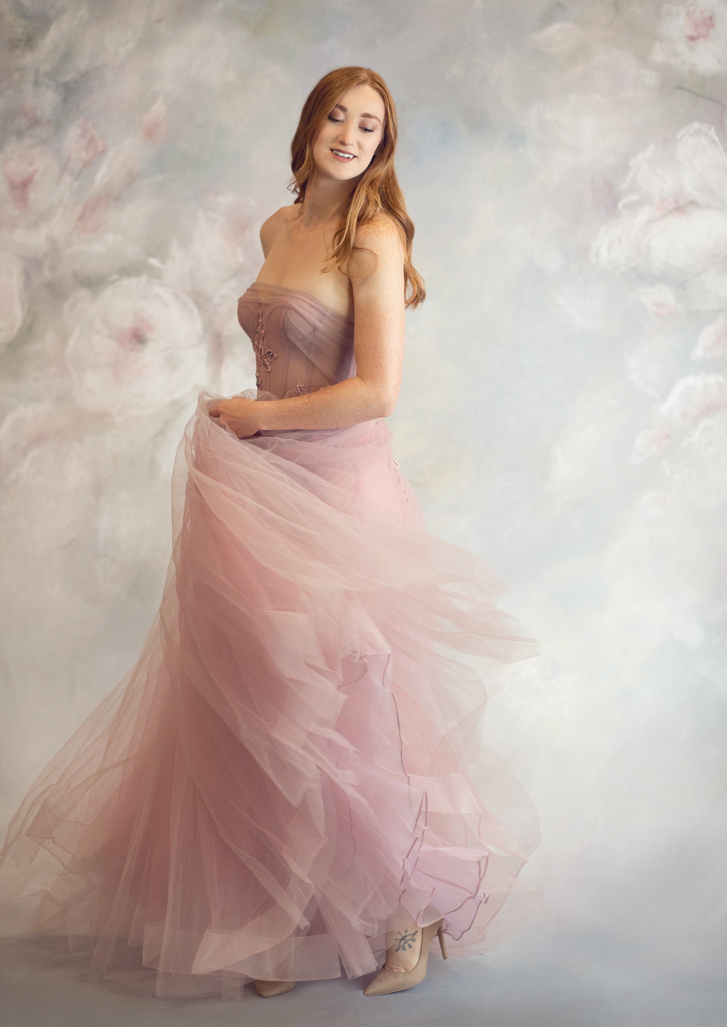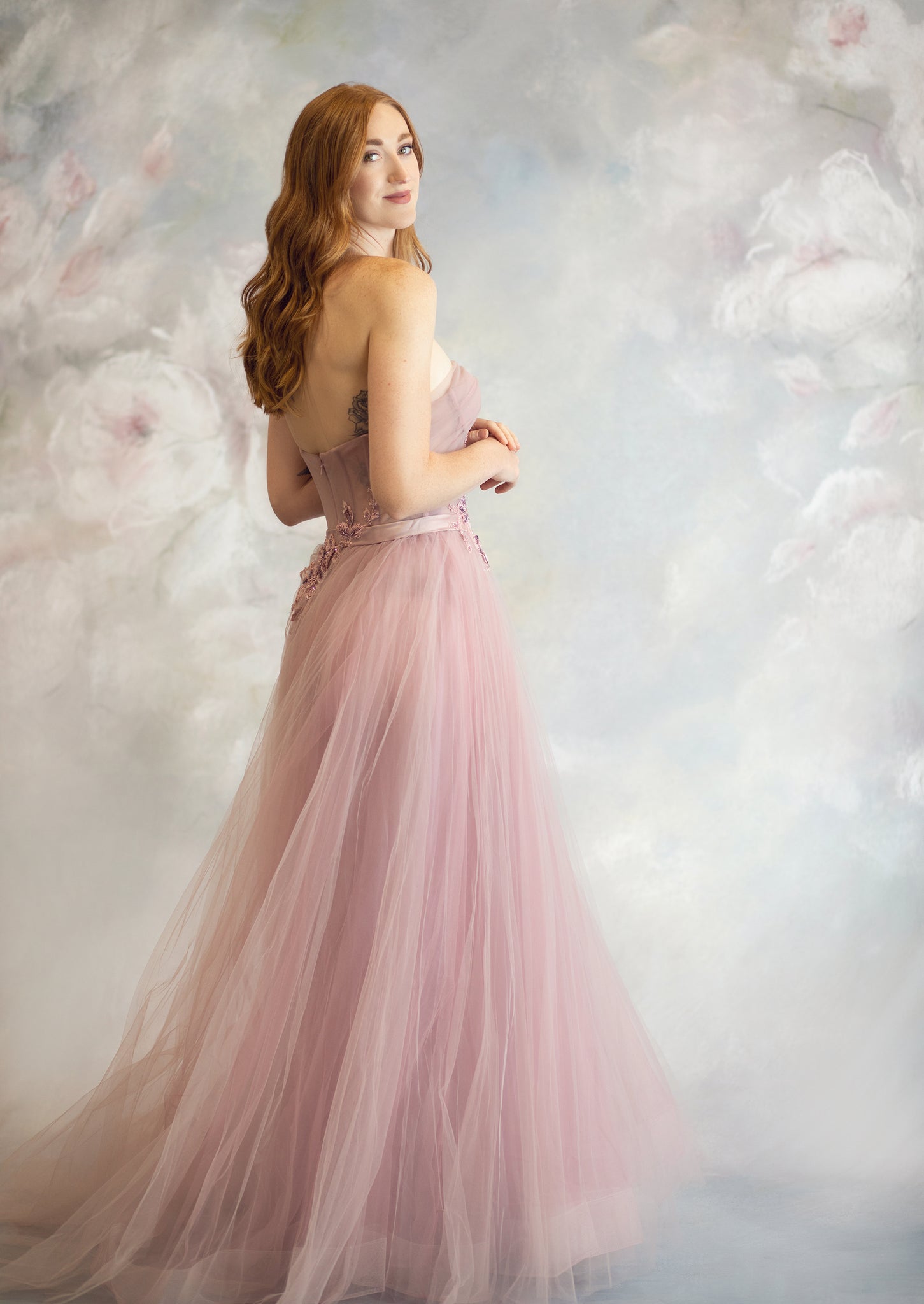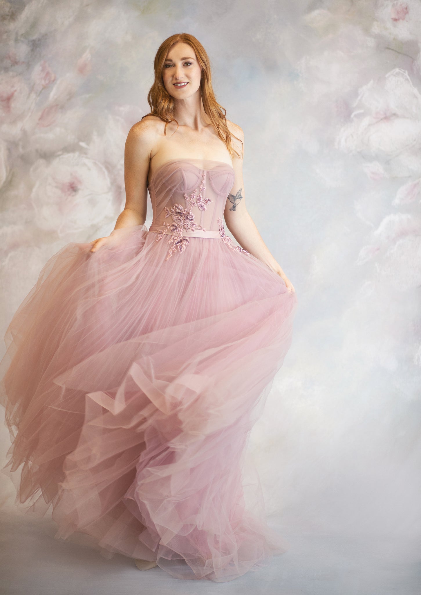 The Monica Gown is a custom made to order gown. Mauve gown with mauve embroidery belt and beaded embroidery. Padded bra top features an invisible zipper.