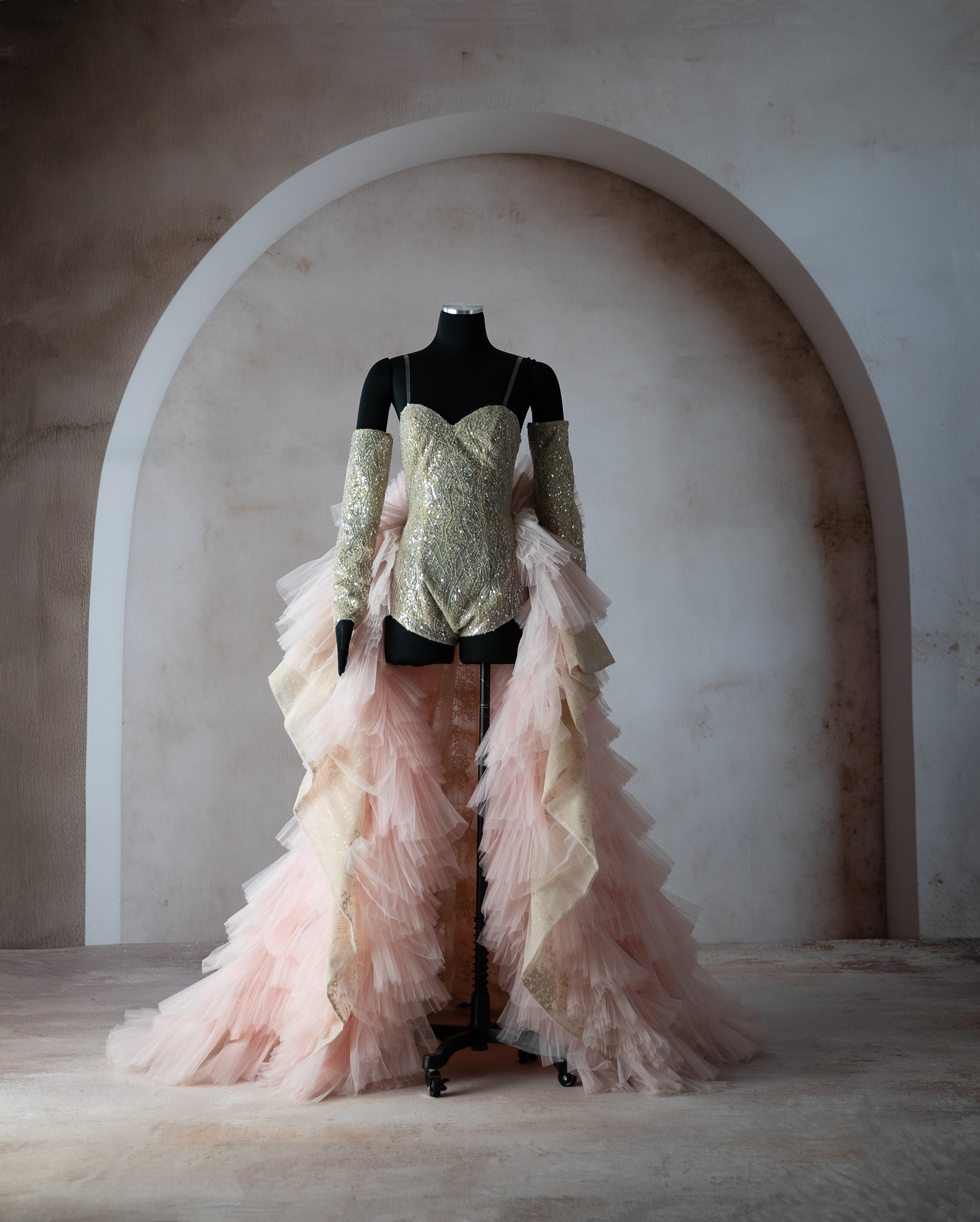 The Michelle Grace Gown is a custom made to order body suit with detachable sleeve and detachable train skirt.Tiers of light pink tulle ruffles, gold and champagne glitter, sequins and tulle. Zipper closure back.