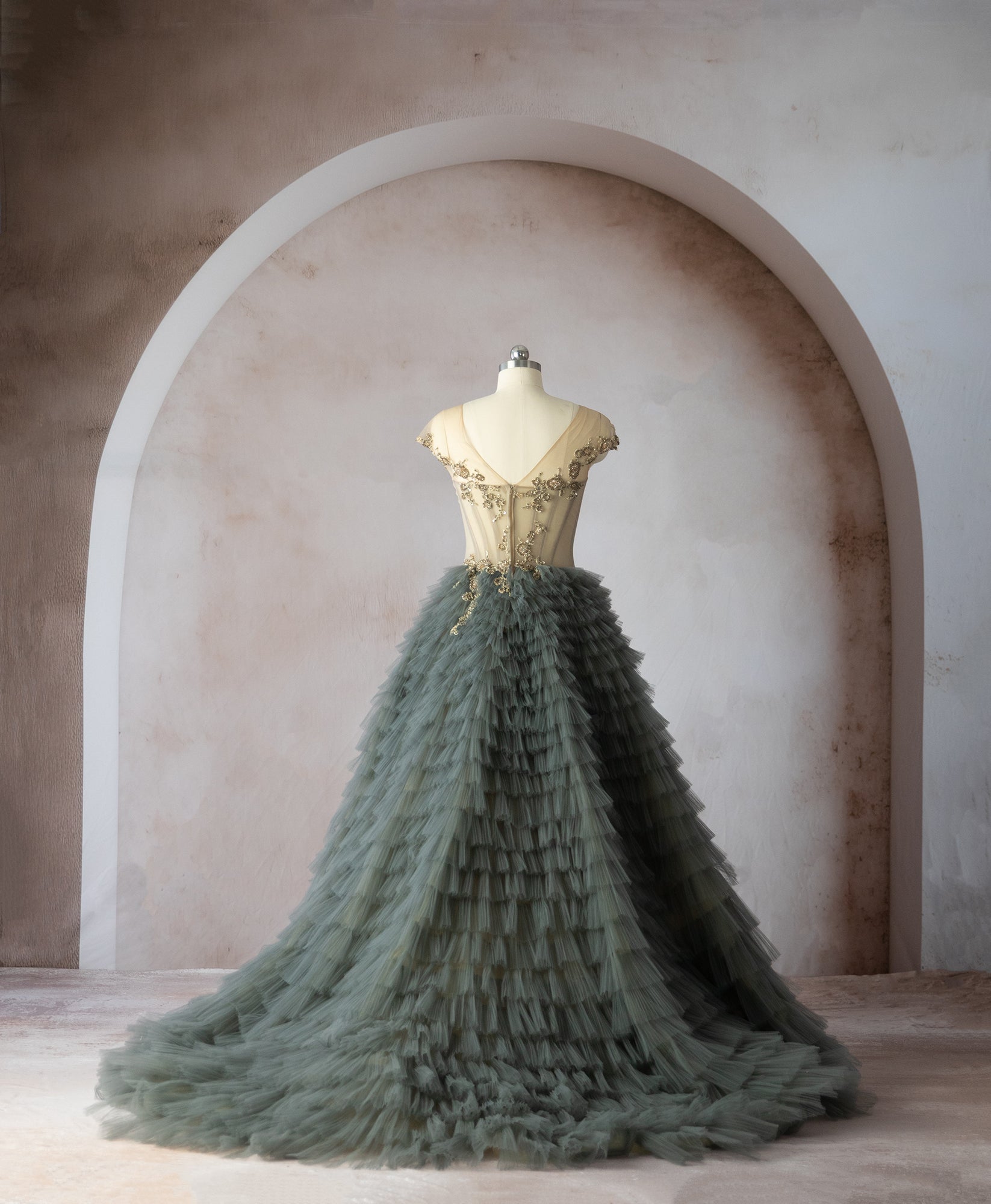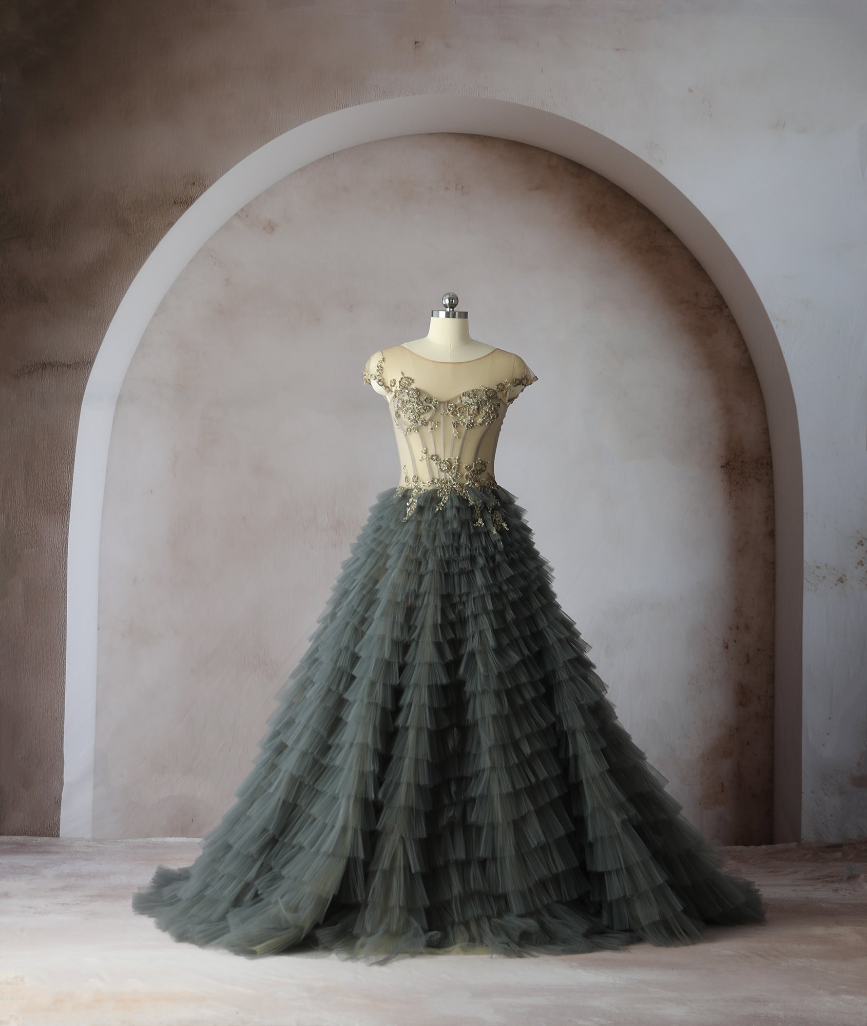 The Aspen Gown is a custom made to order gown. Steele gray and gold tulle gown with gold sequin and beaded appliqué. tiers of ruffles with a lined skirt and invisible  zipper back. The cap sleeve detail adds a touch of modesty.