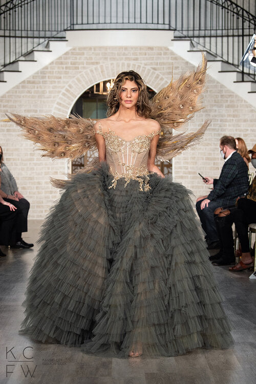The Aspen Gown is a custom made to order gown. Steele gray and gold tulle gown with gold sequin and beaded appliqué. tiers of ruffles with a lined skirt and invisible  zipper back. The cap sleeve detail adds...Read more