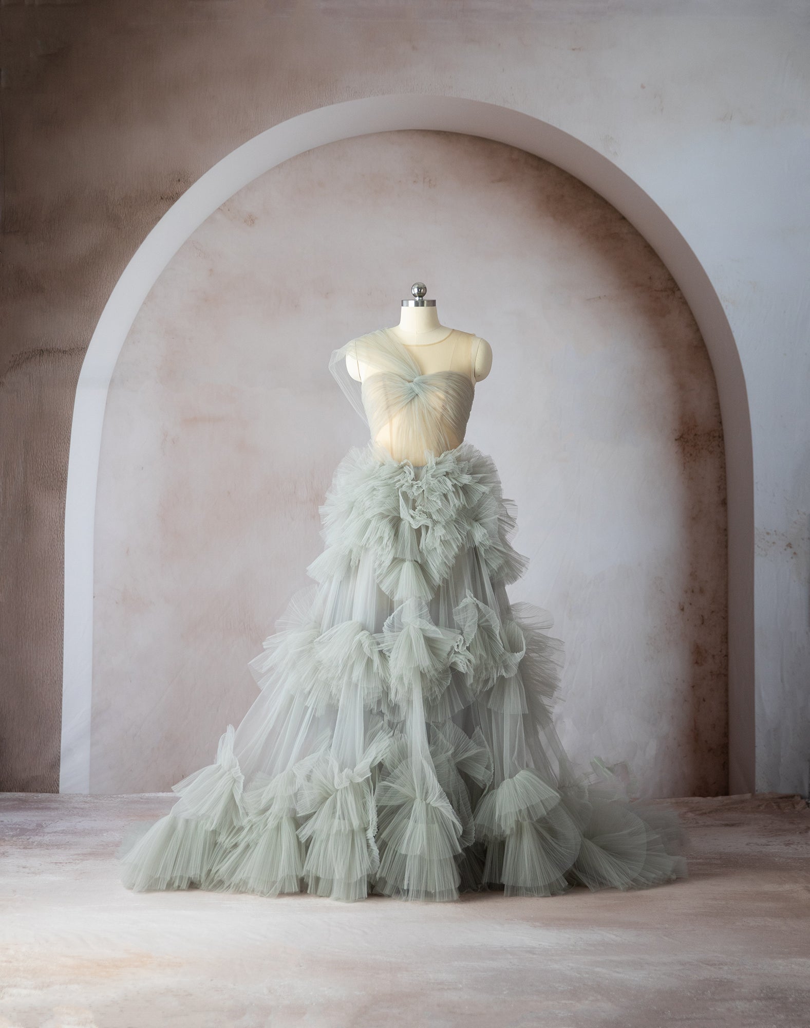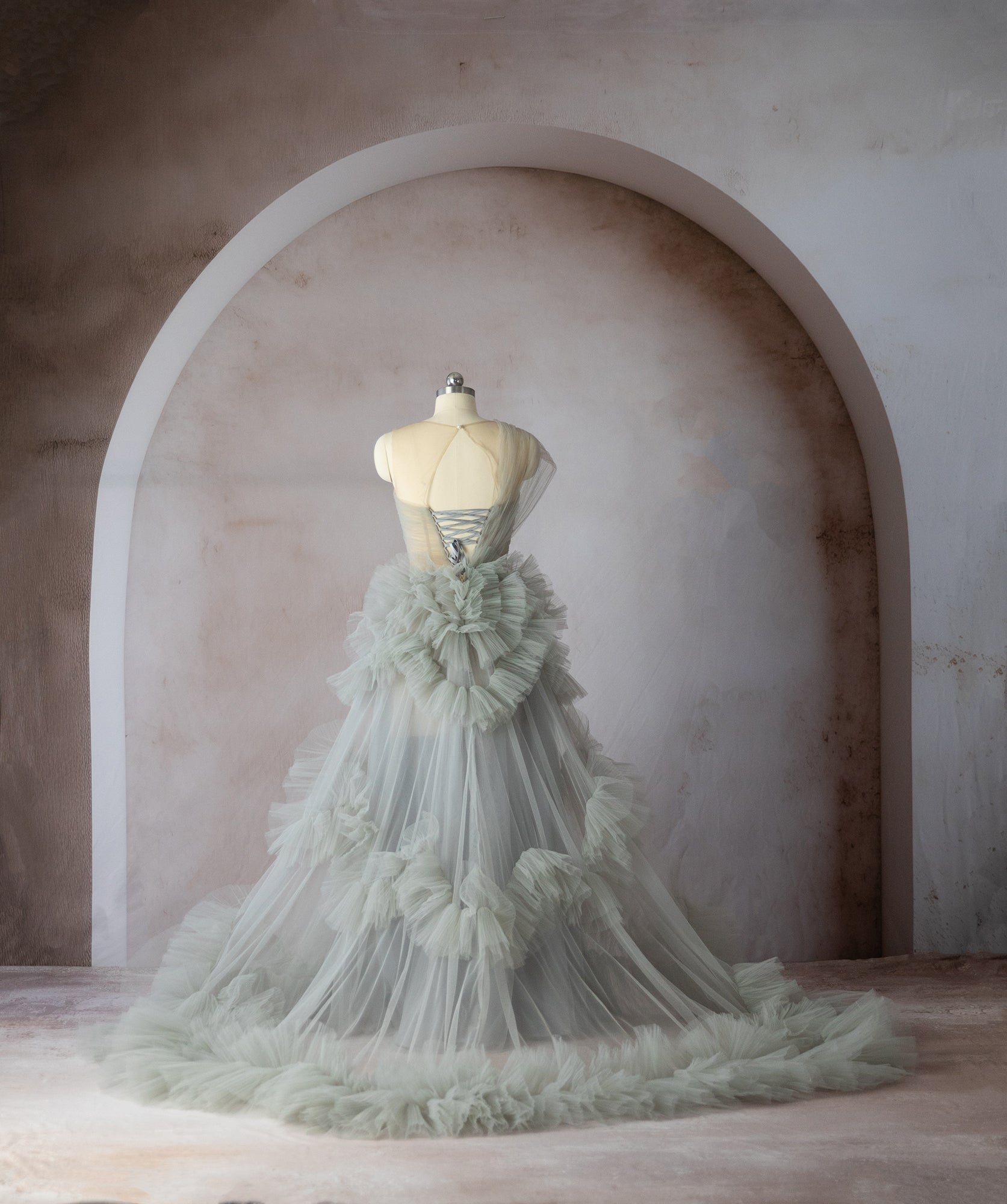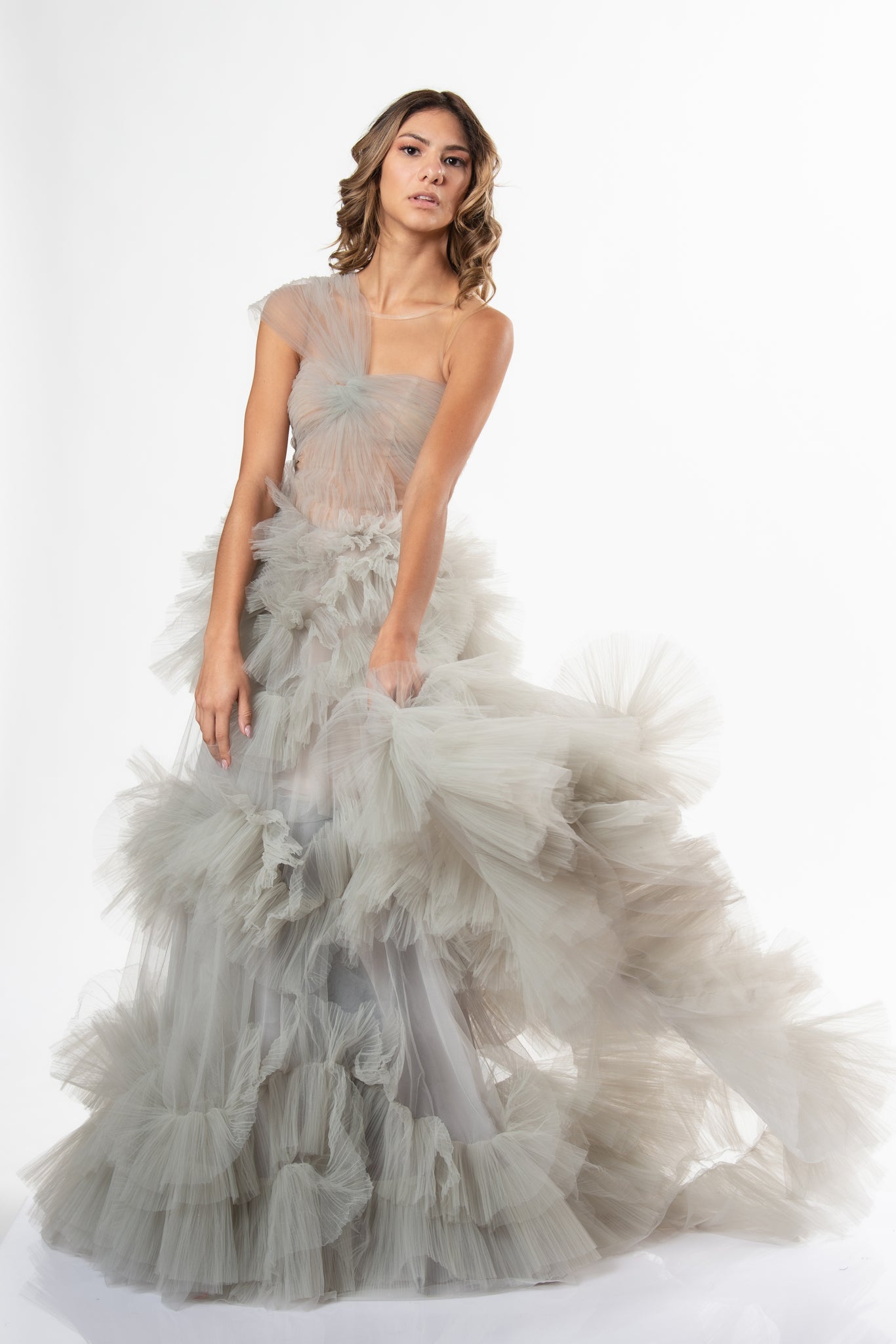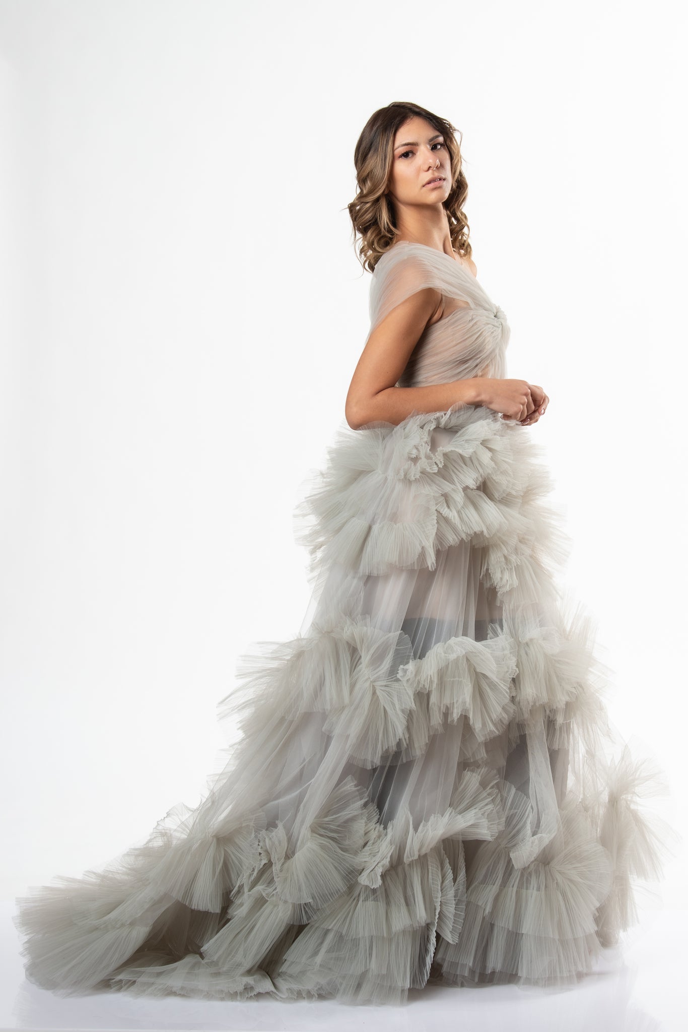 The Aspen Rosalie Gown is a custom made to order tulle gown. Gray and tan tulle, tiers of ruffles with a knee length lining.