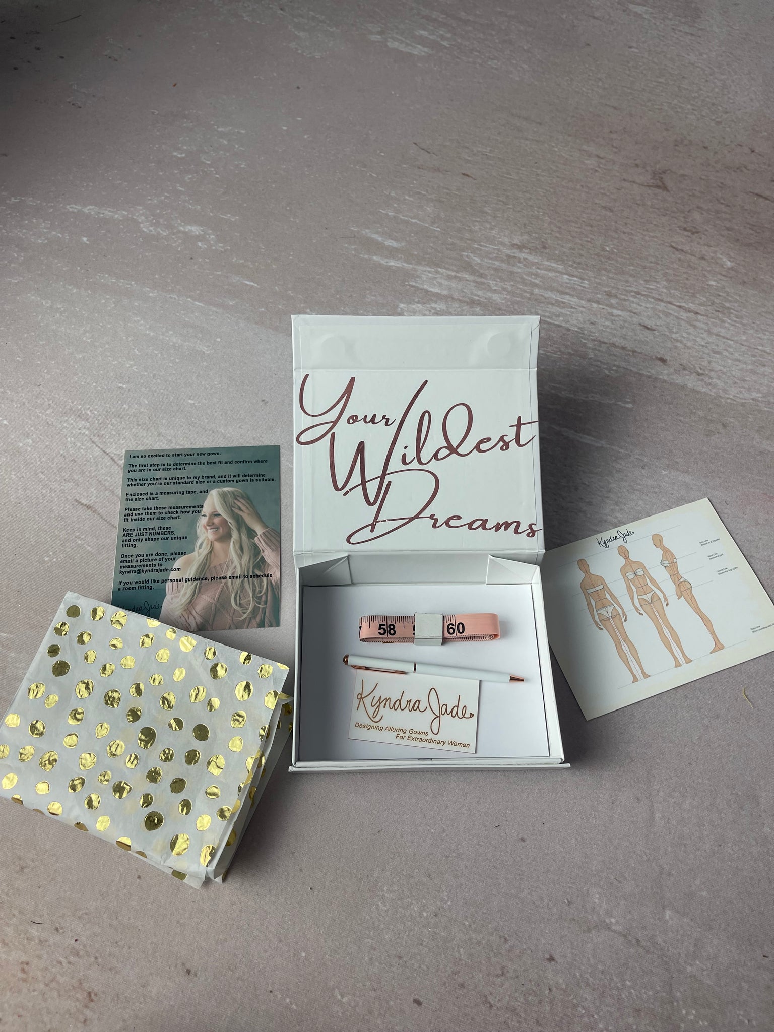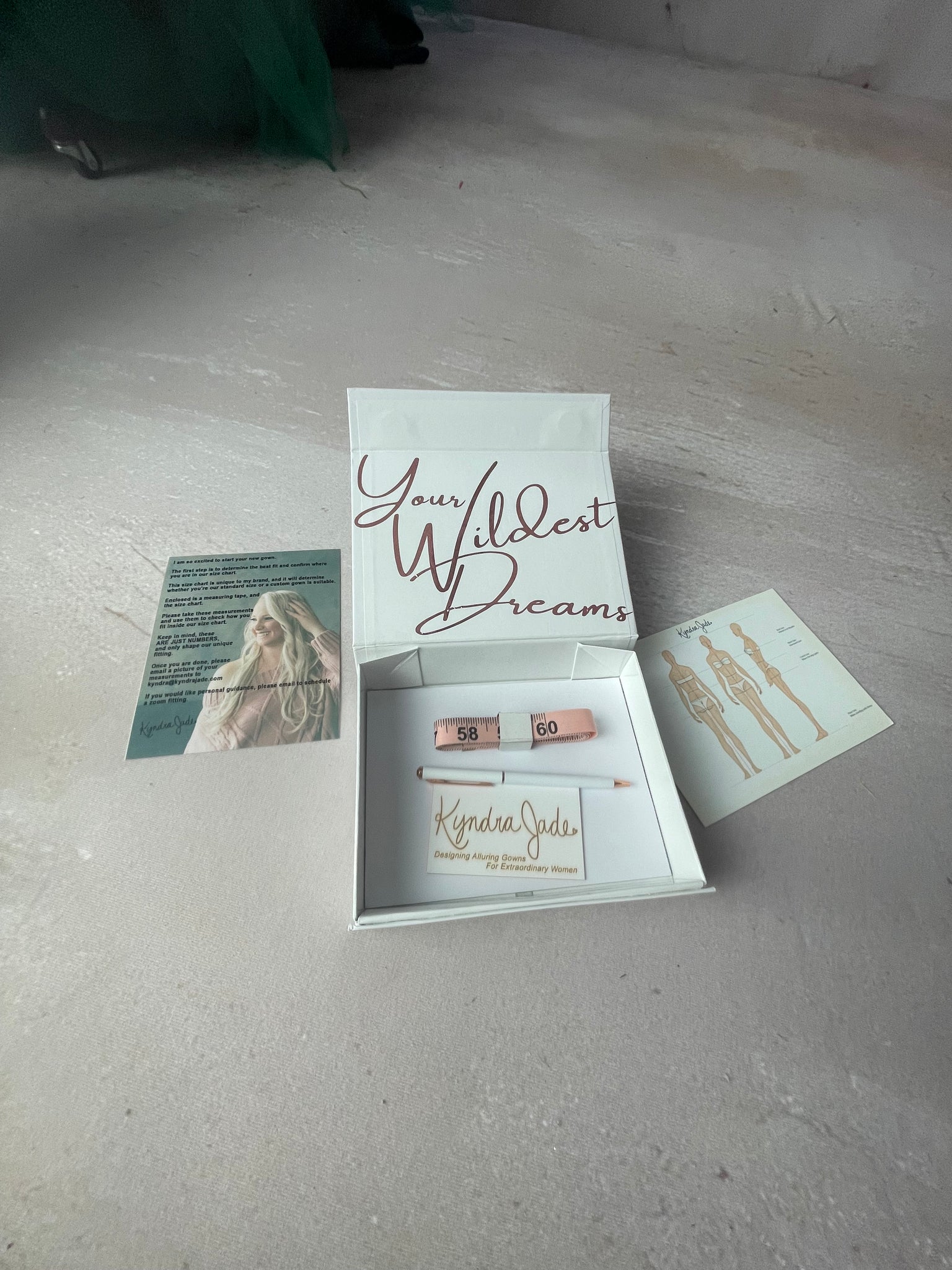 If you are ready to start a gown or custom gown order the best step is to start with our measurement kit. No obligation kit allows you to get your measurements and compare them to our unique size chart. Verify if you best fit one of our stock sizes or need a truly custom size for the perfect fit. Custom Gown budgets start at $3,000 and up. We have financing options available. Purchase this measuring kit and schedule a gown consultation for your no obligation to dream about a new gown. All gowns take 12 weeks production after contract, measurements and payment have been received.