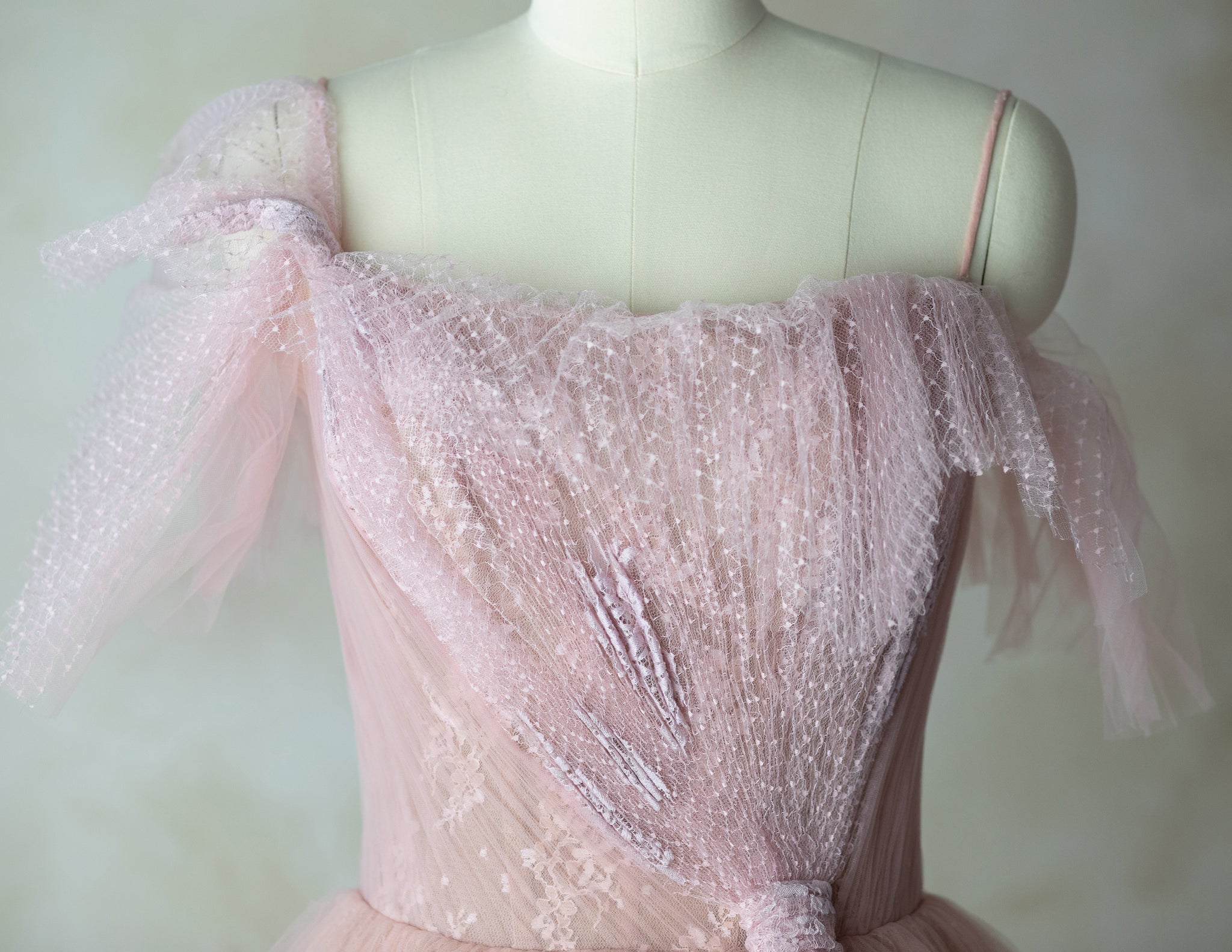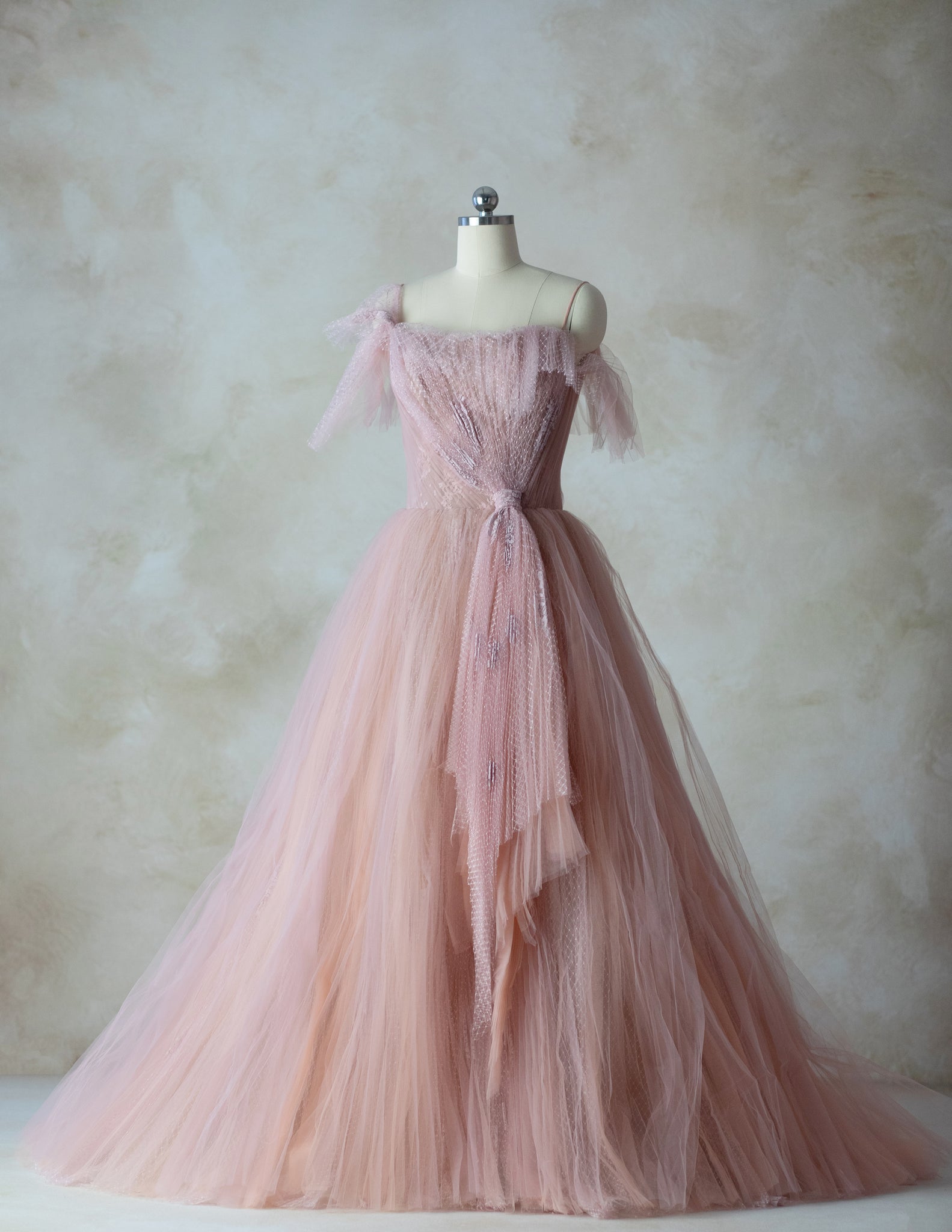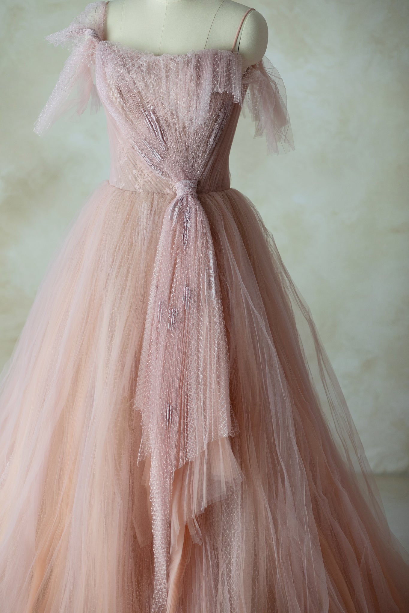 Elizabeth Gown is a custom made to order gown. A pink and peach tulle ball gown with mini strap bodice. The mix of pink and peach tulle combined with pleated tulle and peach lace give this gown a classic look with couture details.