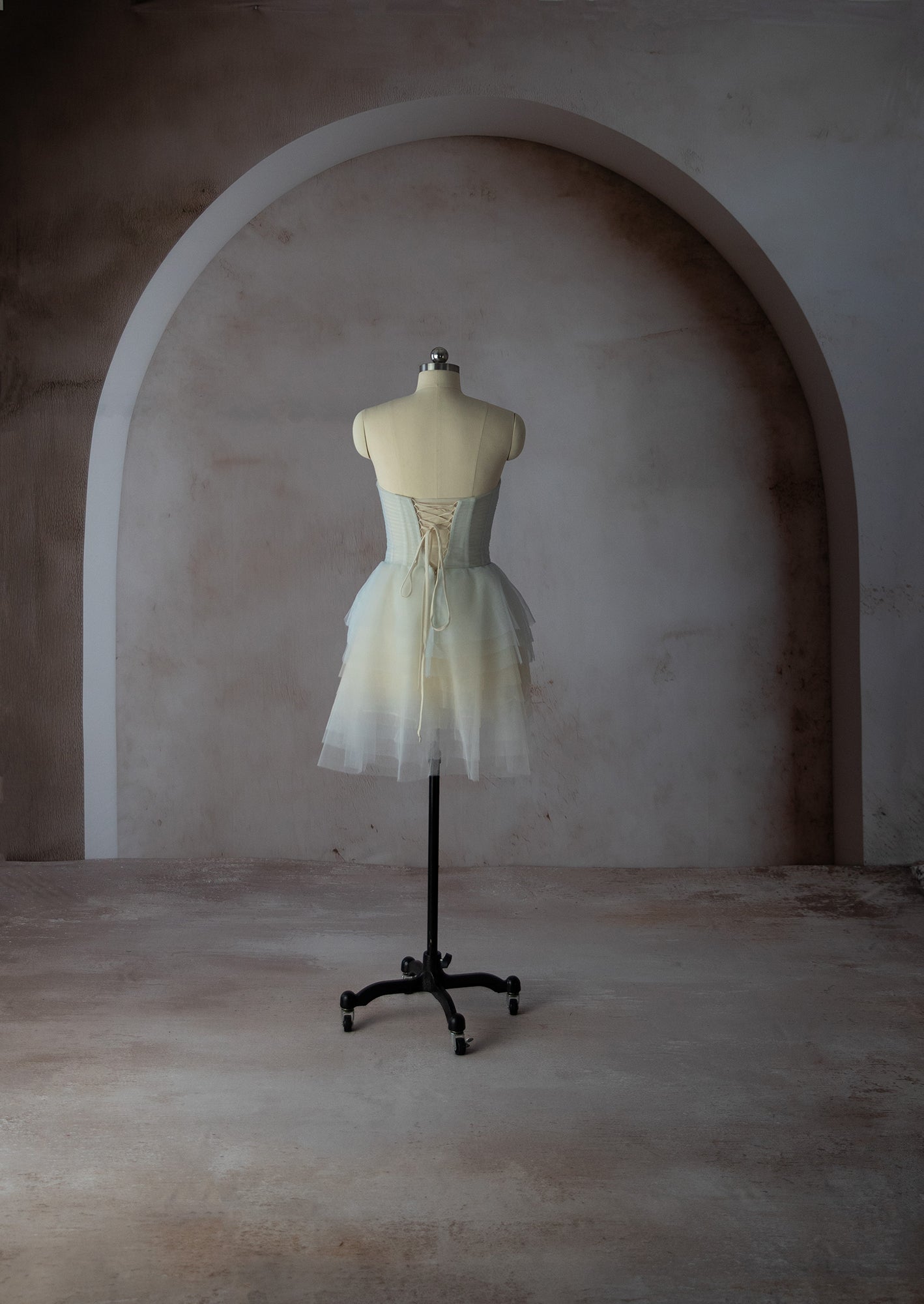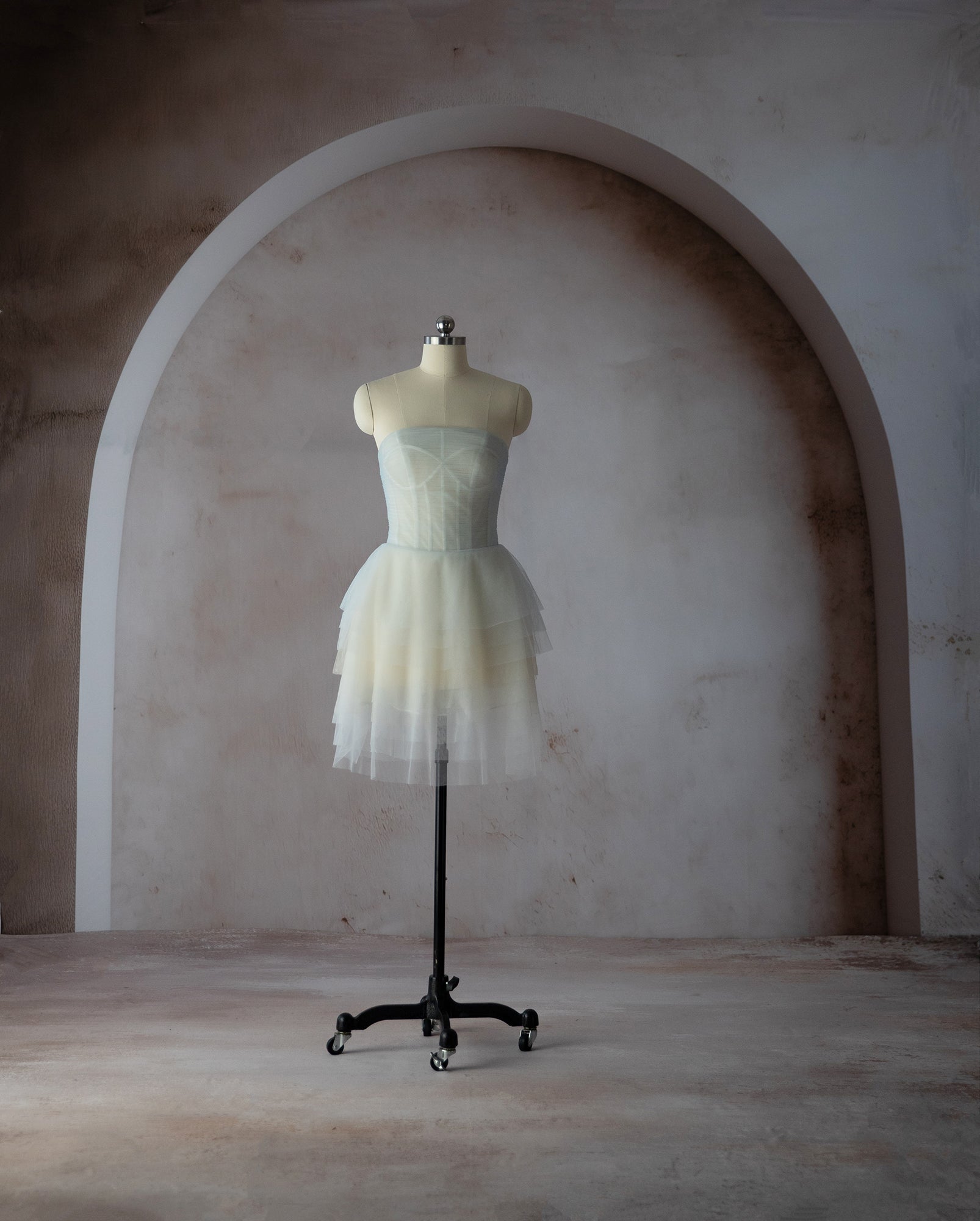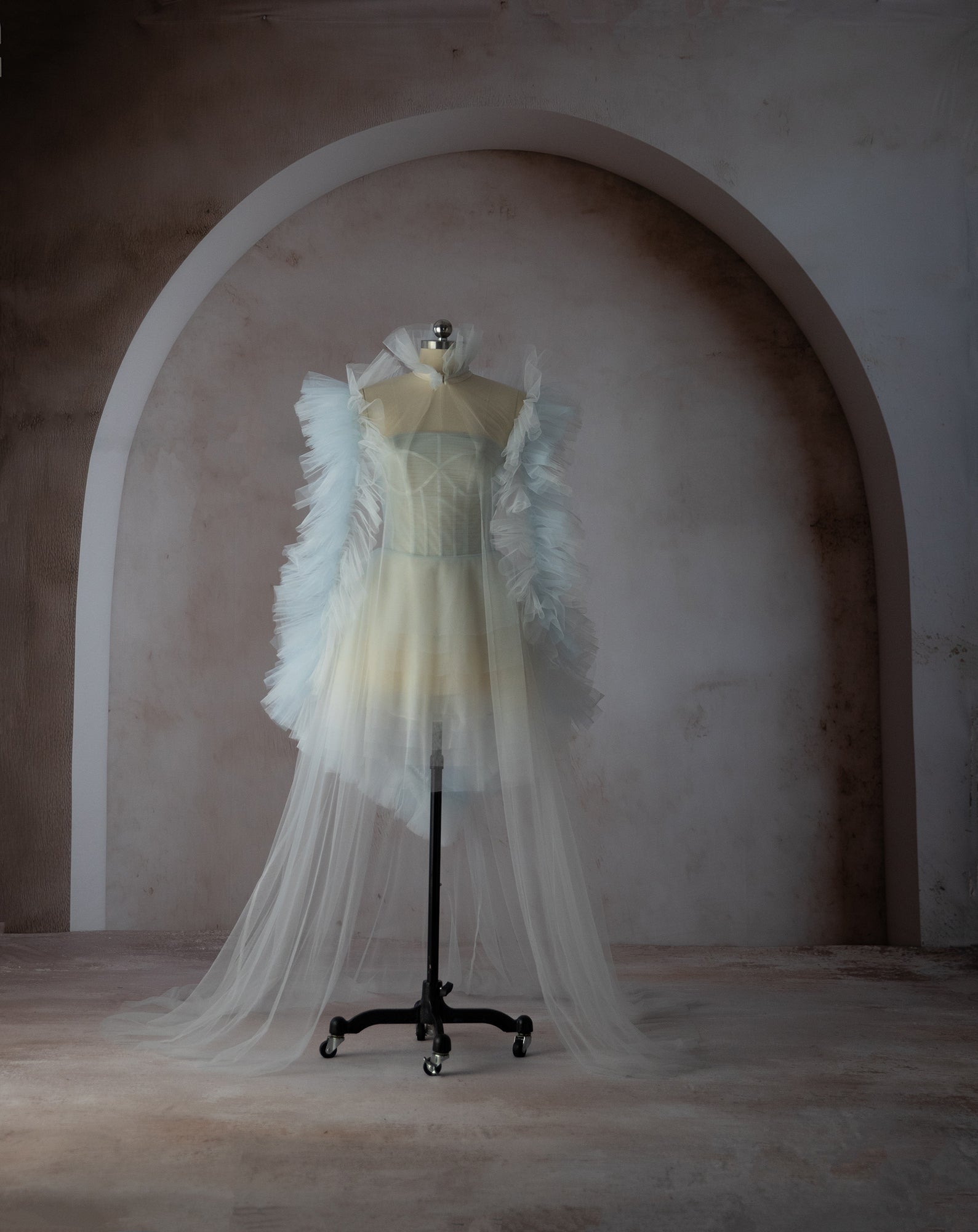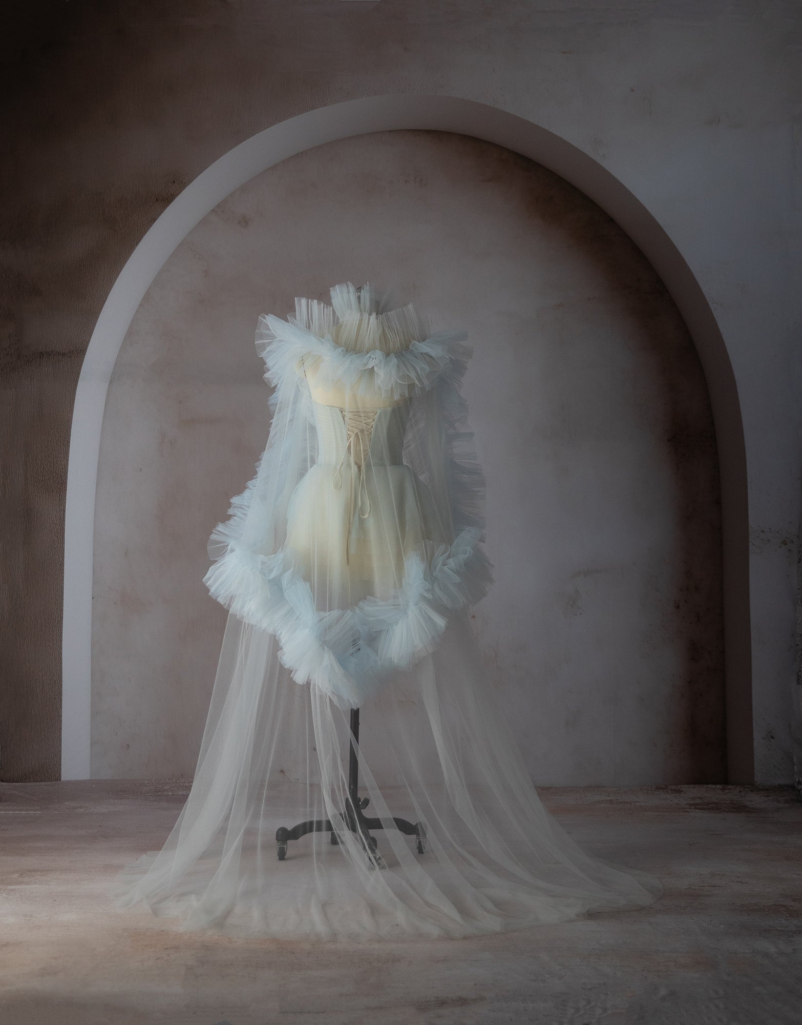 The Gracie Key Gown is a custom made to order gown. Strapless gown with deconstructed corset top, sheer bodice and skirt. Features white a light blue tulle with ruffles galore. Can be purchased as a gown and cape set or pieces sold separately.