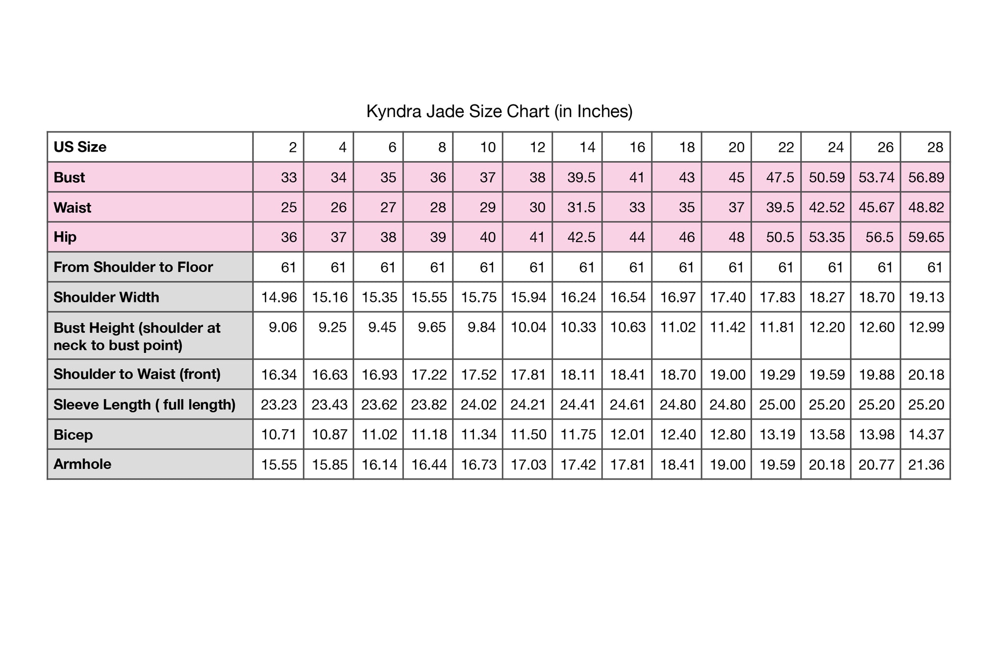 Our size chart is custom made for our gowns, if you need a gown made to your own measurements no problem simply choose custom size We will send you a measurement kit to ensure the gown is made to fit your perfectly. Do you dream of this gown but with it was in a different color or other custom ideas please let us know. Every gown is made to order.