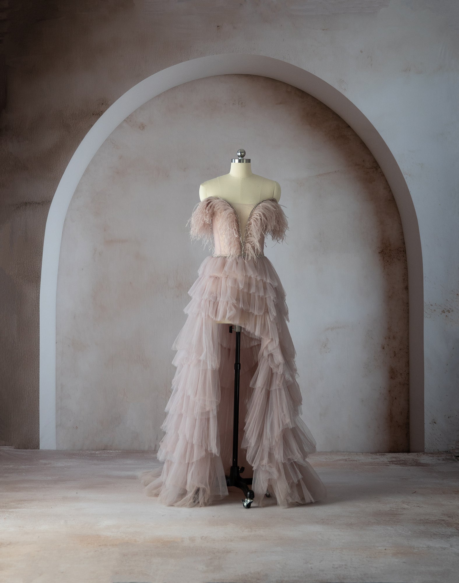 The Michelle Gown is a custom made to order gown. Mauve tulle gown with ostrich fringe feathers hand placed. Delicate rhinestone trim along the bodice. Asymmetrical tiers of ruffles with an unlined skirt and corset back closure.