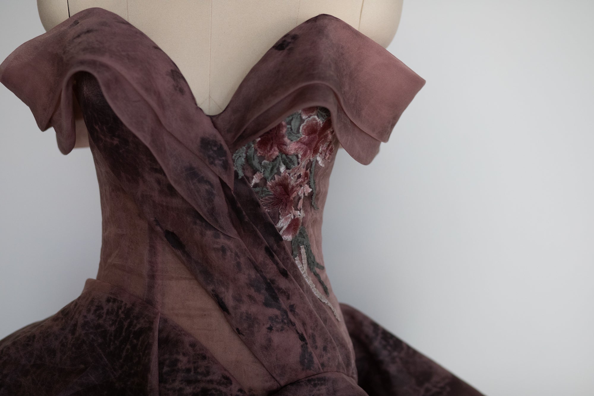 The Rebecca  Gown is an  brown tulle gown featuring a hand painted technique giving the fabric a leather texture. hand embroidered and beaded details. Shown one the Christian Michael Runway in 2022. Now available for order.