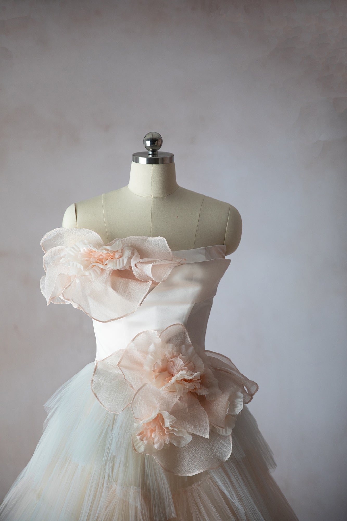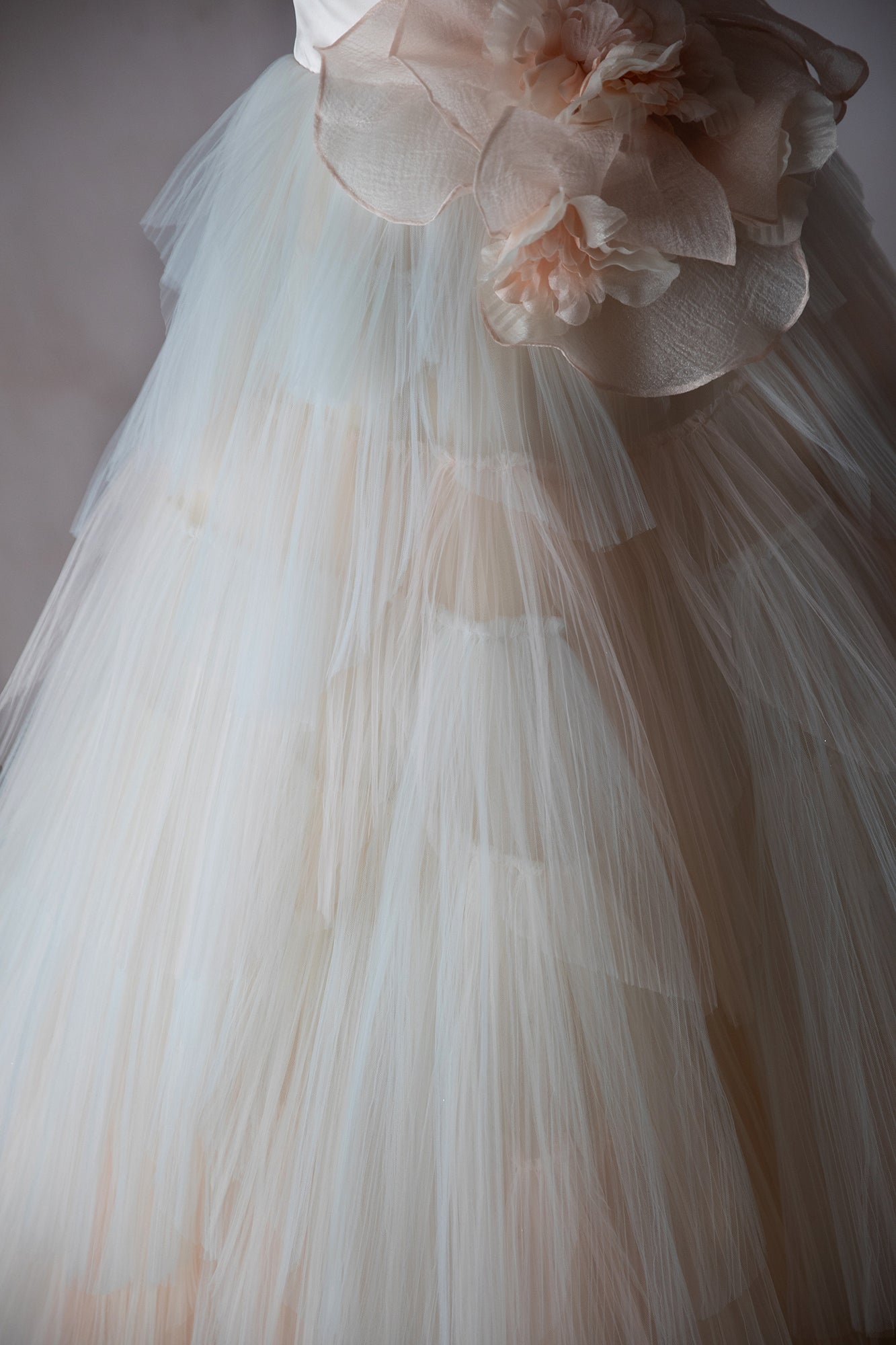 Rosalina Gown is a custom made to order gown. A peach and suble mix of light blue tulle ball gown with a satin double bodice. Stunning 3d flowers attached on the bodice and waist. If you love this gown you might love the "sister gown" the Ashlyn Gown.