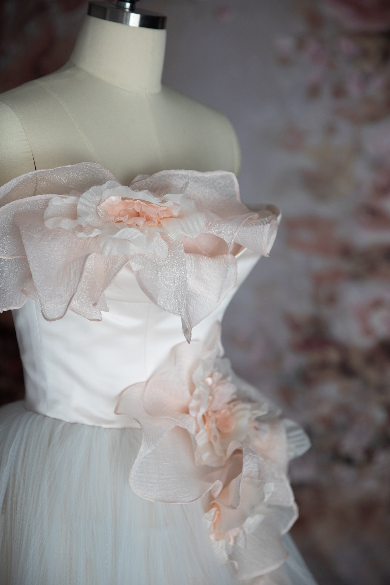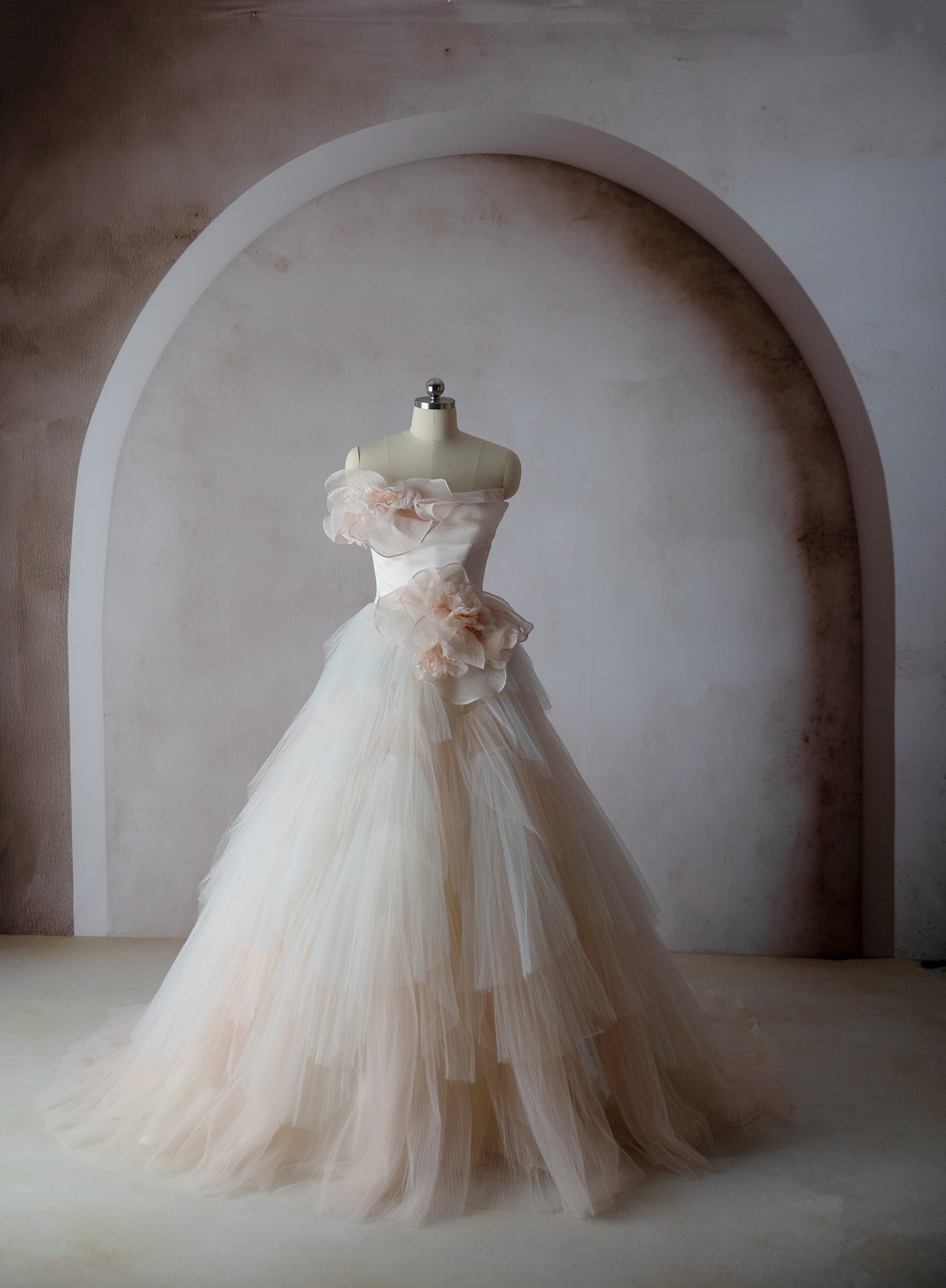 Rosalina Gown is a custom made to order gown. A peach and suble mix of light blue tulle ball gown with a satin double bodice. Stunning 3d flowers attached on the bodice and waist. If you love this...Read more