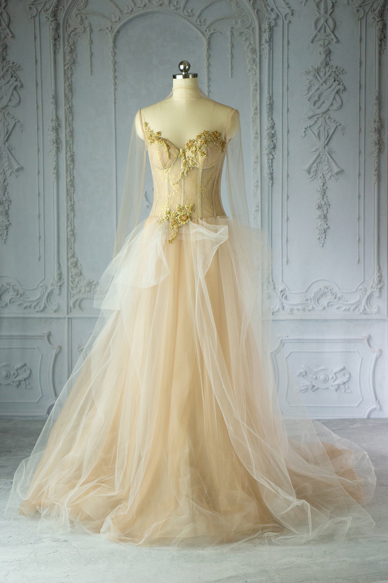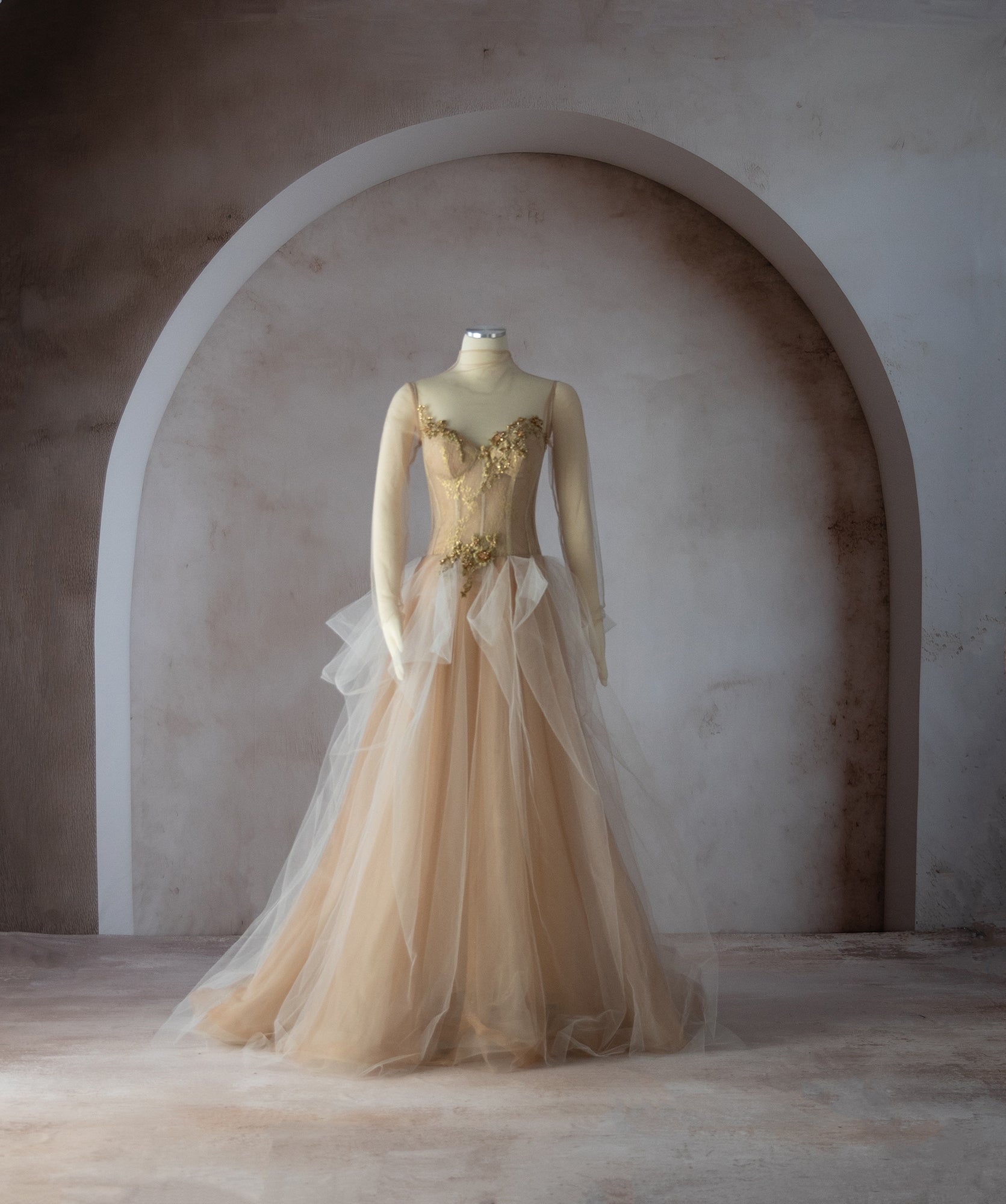 The Tami Gown is a custom made to order gown. Gold tulle with tulle long sleeves. Padded bra top features a stunning button back closure.