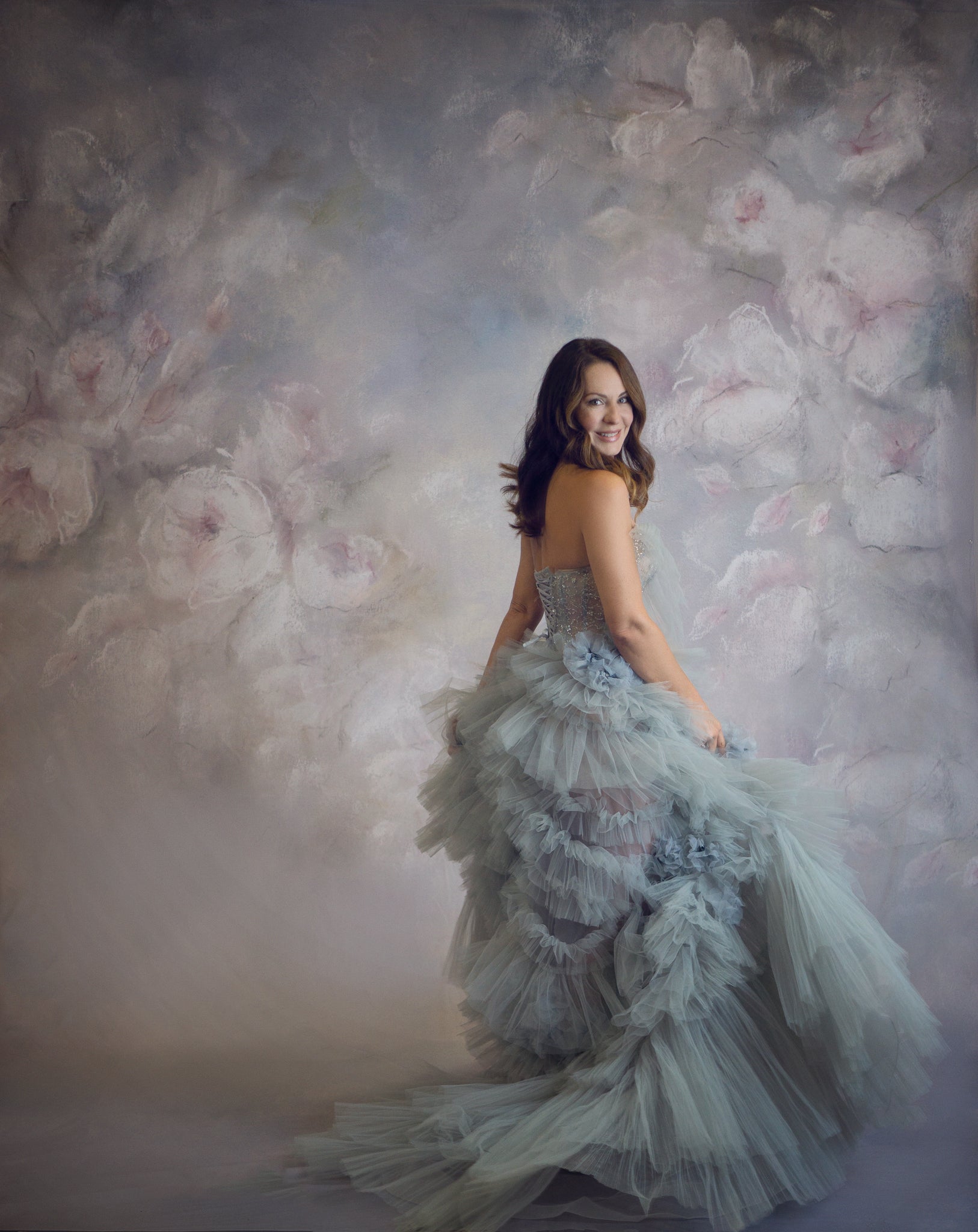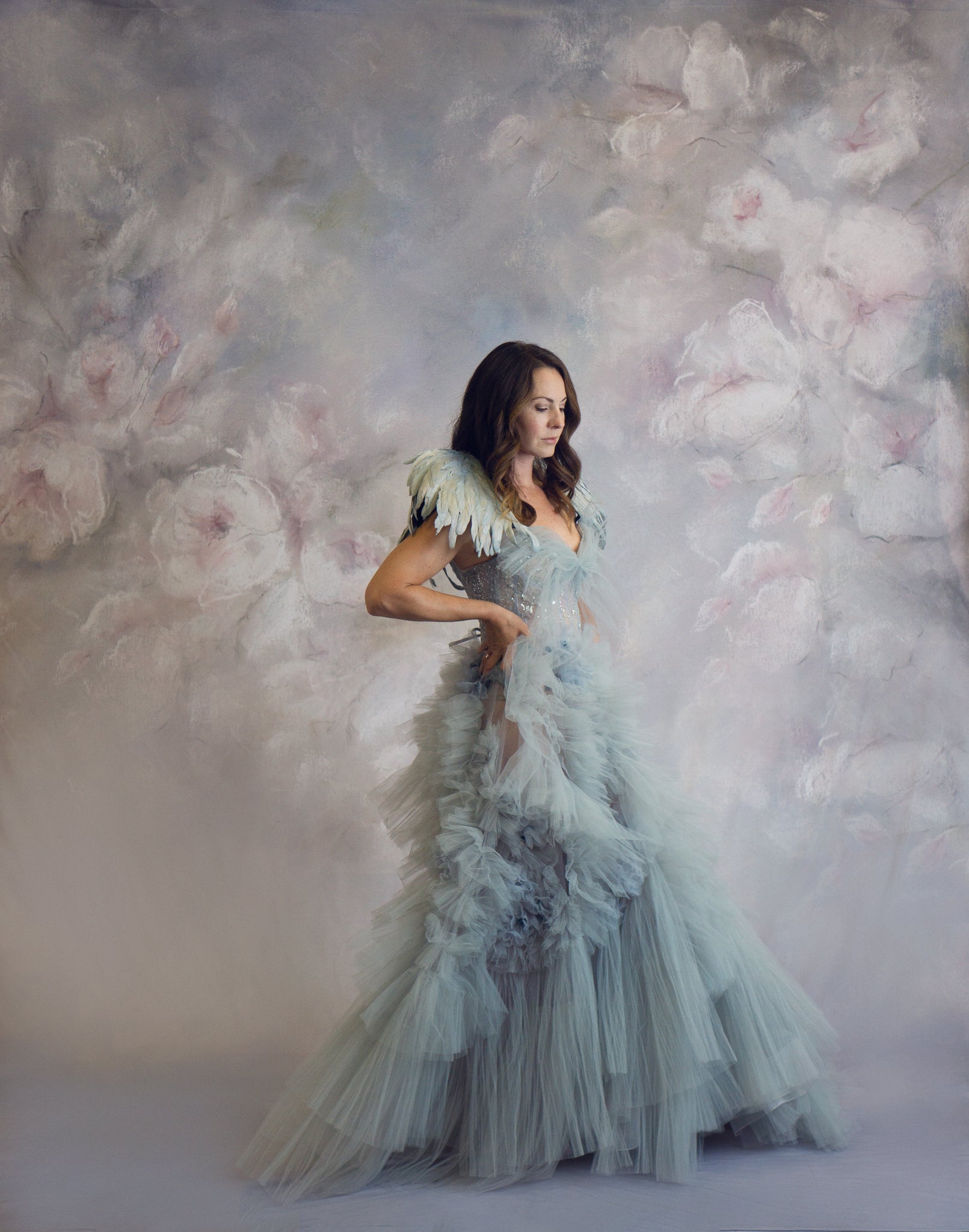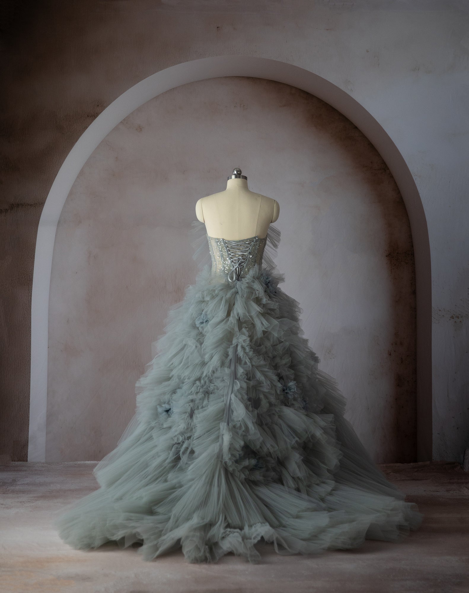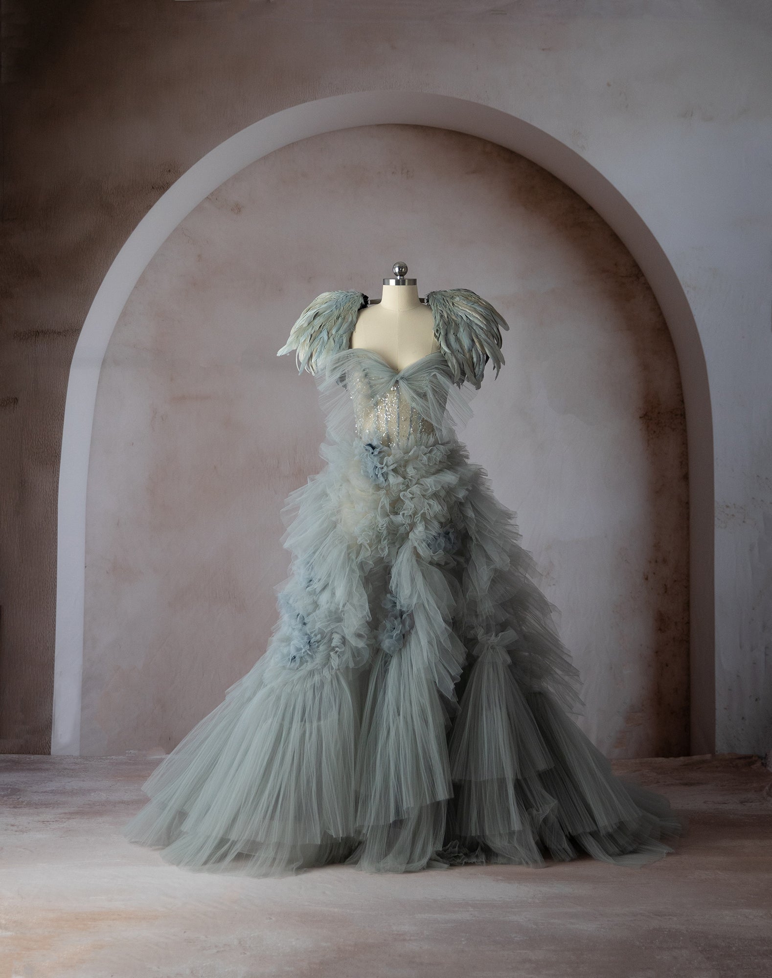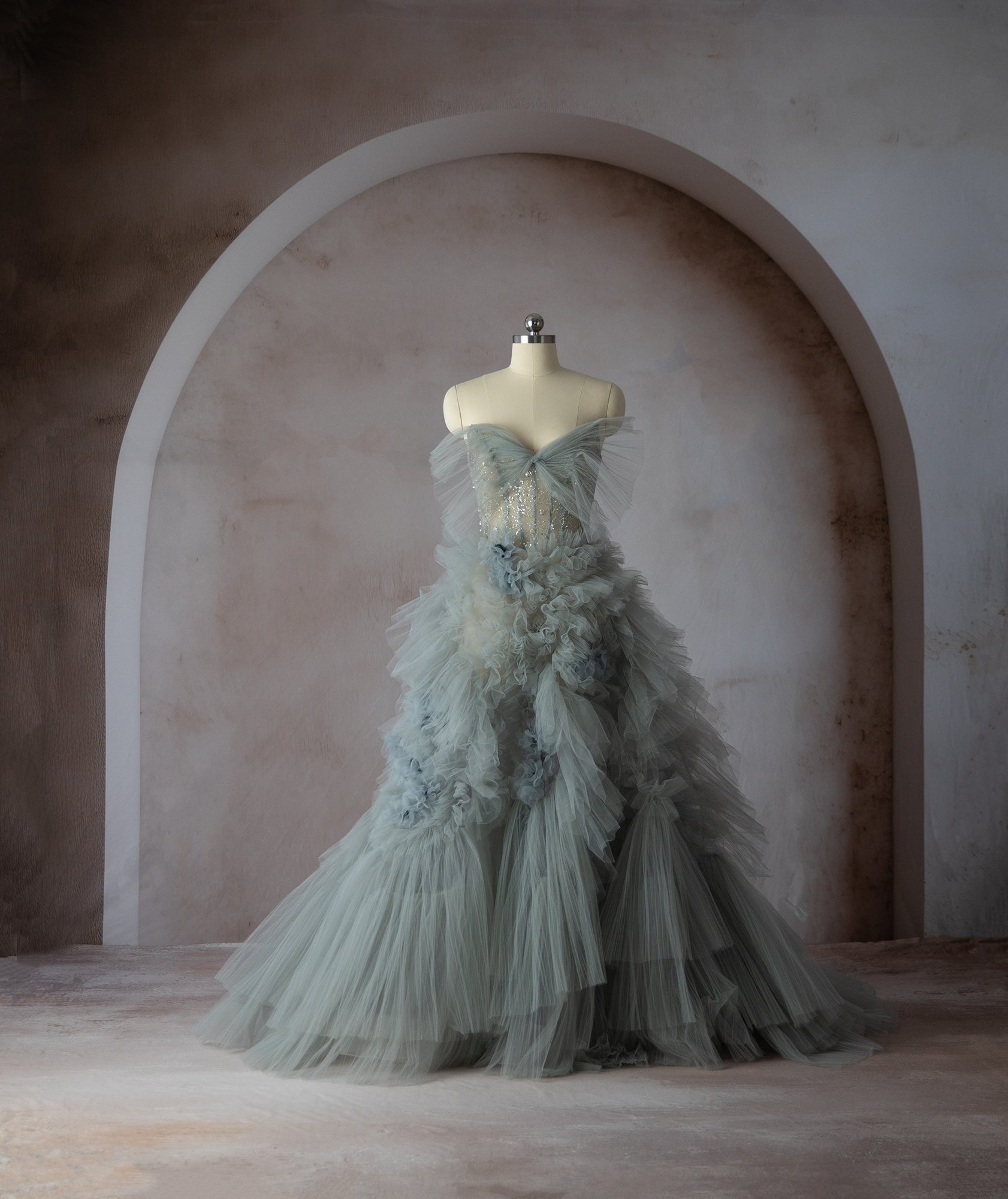 What Dreams are made of a collection released from the Kansas City Fashion Week Runway at Oak Park Mall . This dreamy blue tulle gown features delicate hand embroider sequins, sheer corset bodice, handmade flowers and a sheer tulle and chiffon skirt. Long train makes this gown twirl worthy.
