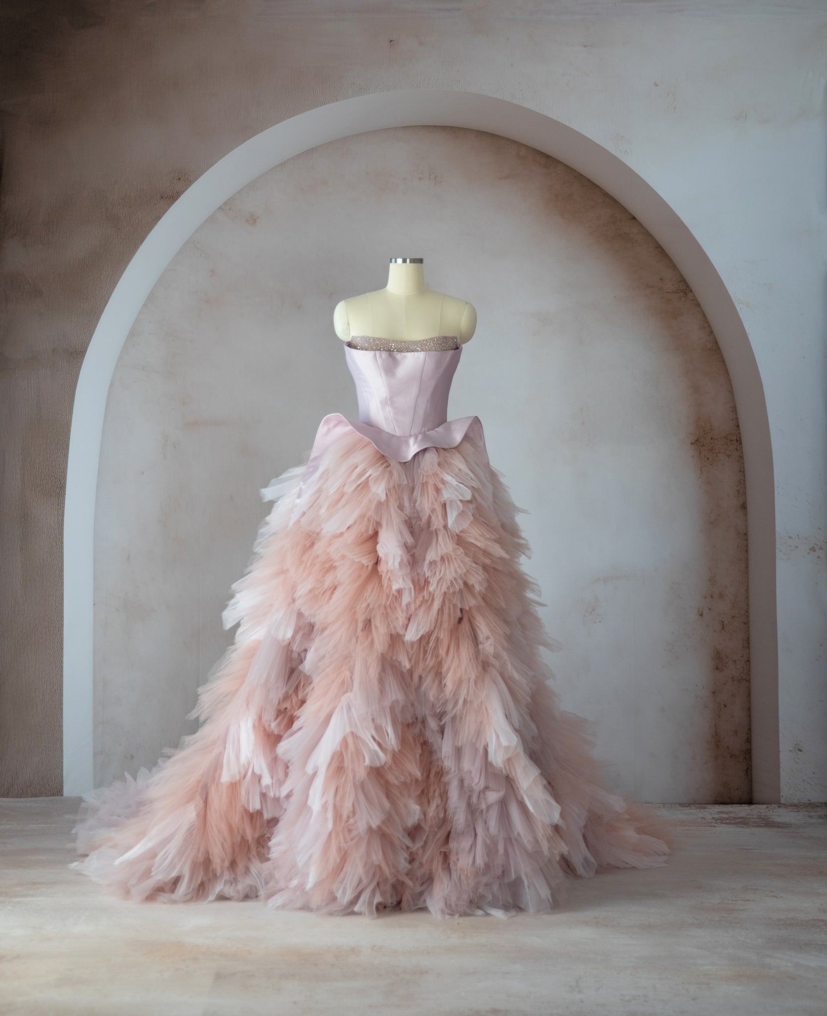 Victoria Gown is a custom made to order gown. A rose mauve tulle ball gown with a strapless bodice.  The satin bodice features hand beading details and a unique peplum style structured detail. Tiers of ruffles in a mix of pinks and mauves with a moderate train, corset back closure. The tulle details loved by Kyndra Jade.