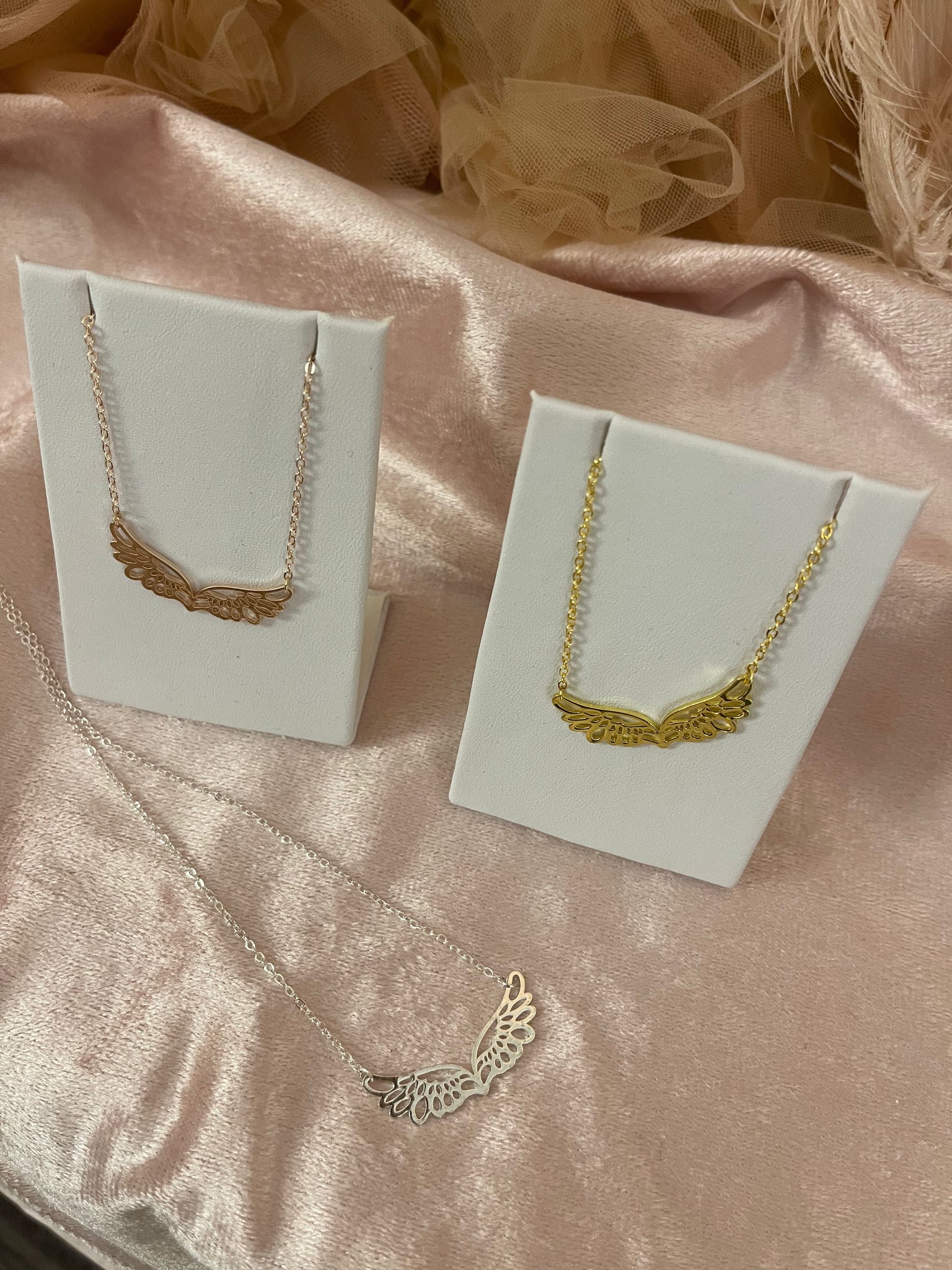 Winging it necklace is a stainless steel chain necklace with angel wing cutout pendant. Features a 20 " chair. Angel wing pendant is 1.3" wide and .5" tall. Available in 3 finishes stainless steel, lead and nickel free.