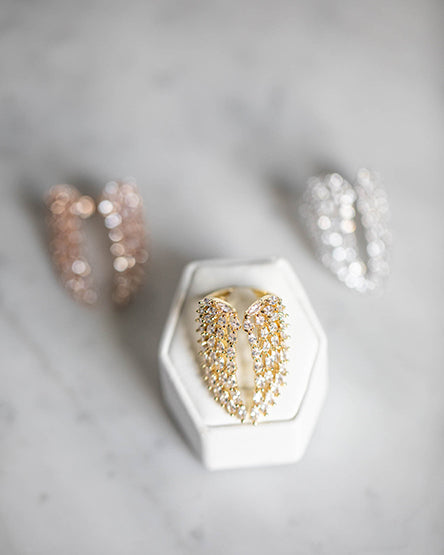 Wings to fly adjustable costume ring features gold plating, cubic zirconia adjustable ring. The ring Kyndra Jade wore down the runway! Are you ready to flying again after brokenness. Celebrate it with this ring.