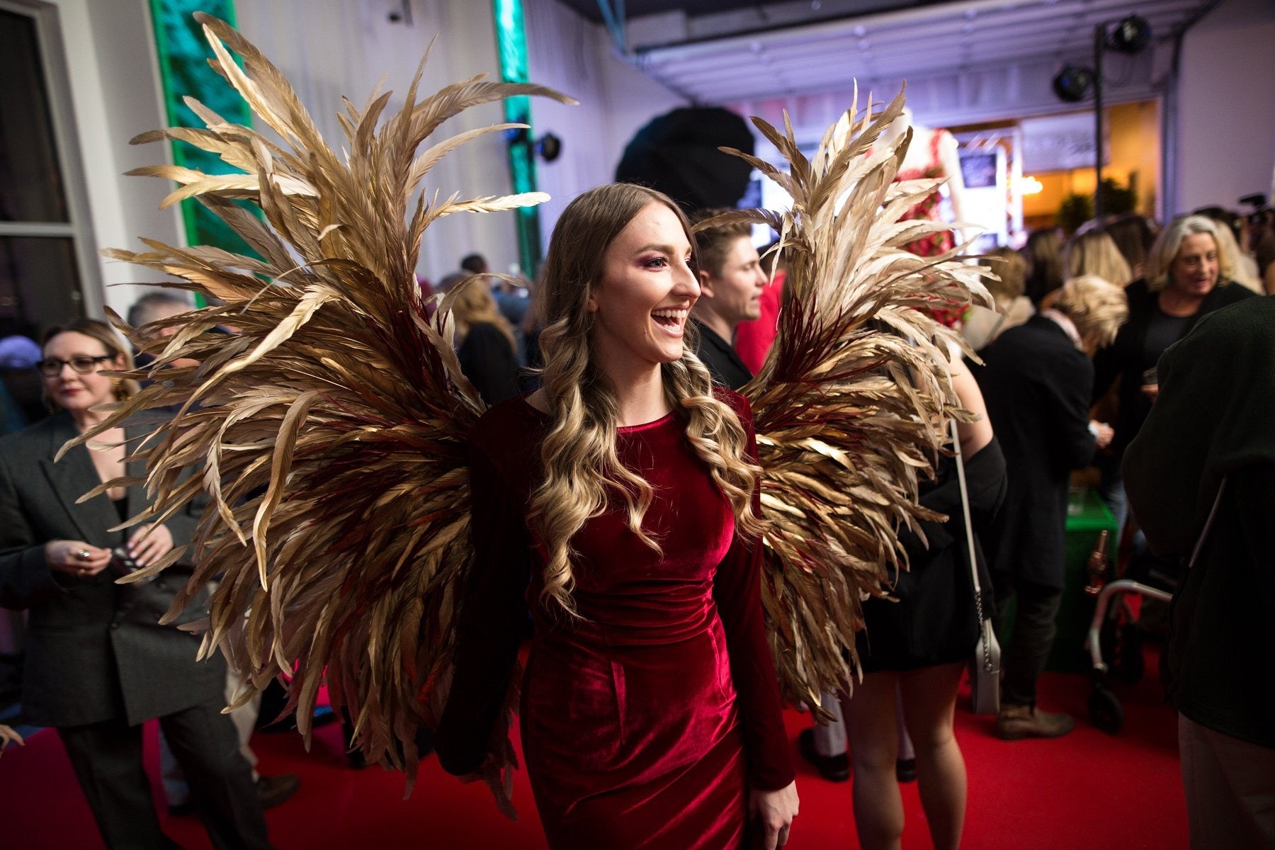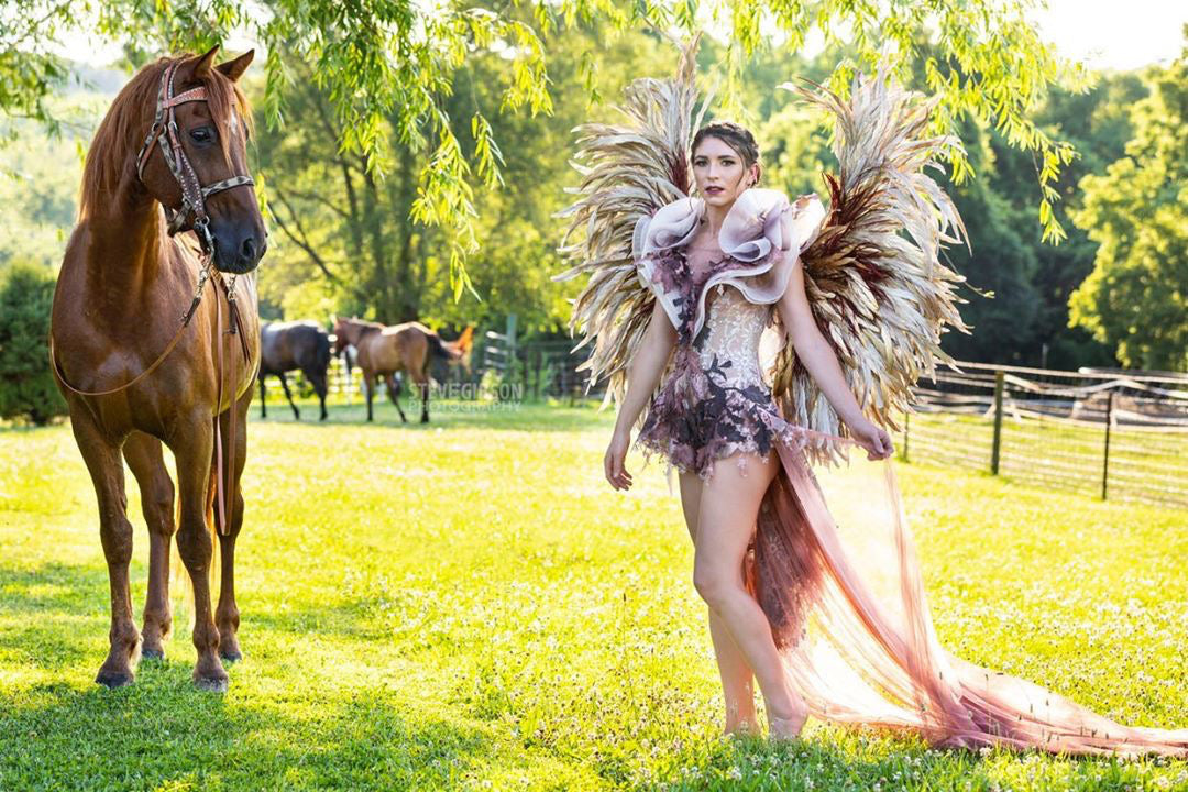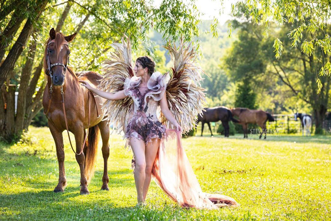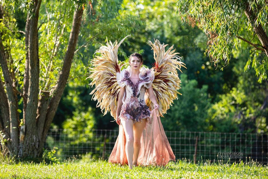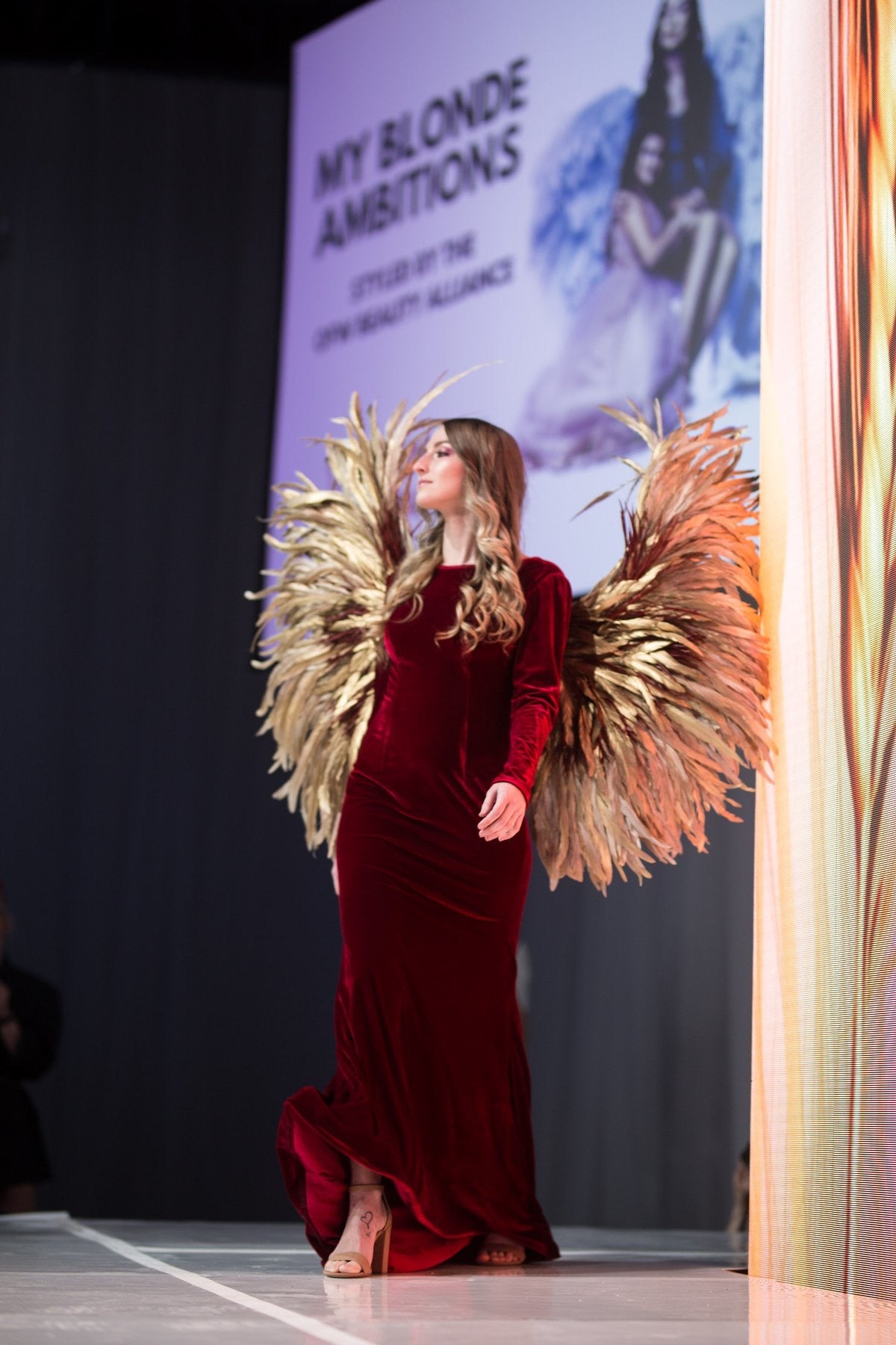 Mercedes wing is a new style of luxurious wings featuring tan, handprinted gold feathers with accents of burgundy.   As seen on the Omaha Fashion Week Runway,  Due to the custom handmade nature of this product will vary.  Kyndra Jade...Read more