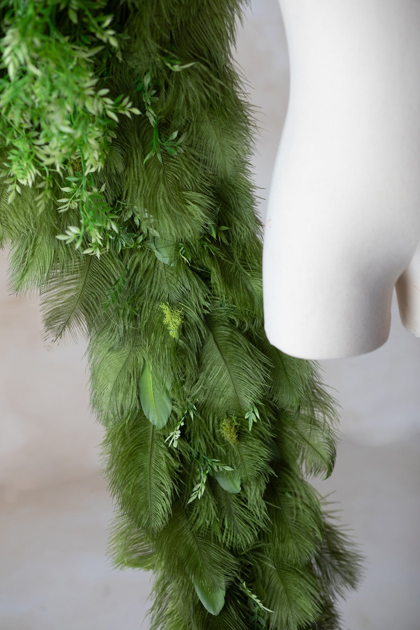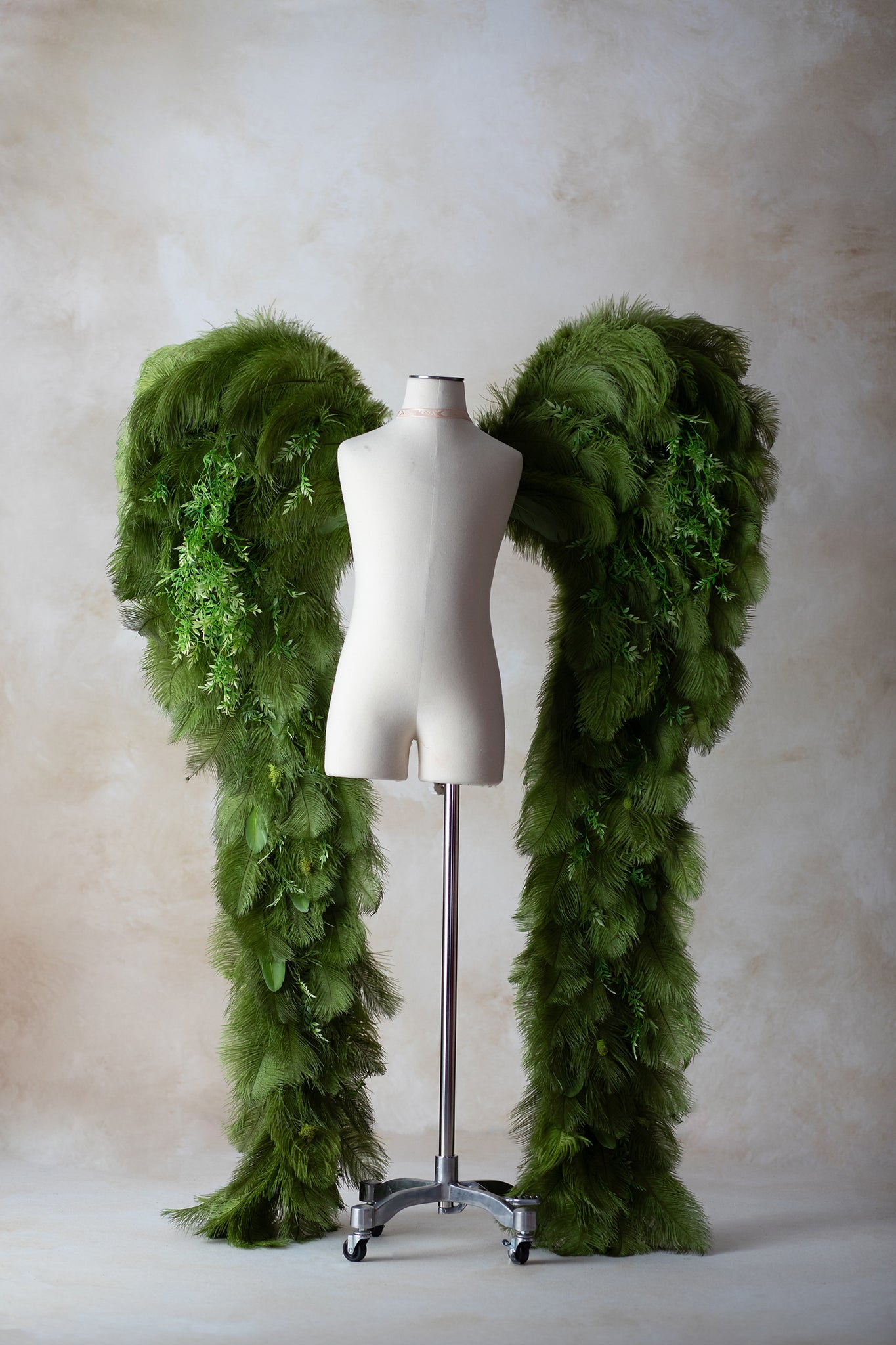 The Moss Crush Angel wings are a tween sized angel wing. This pair of wings are ready to ship! The moss crush wings feature olive green ostrich and rooster feathers, moss and silk vines for a stunning depth.