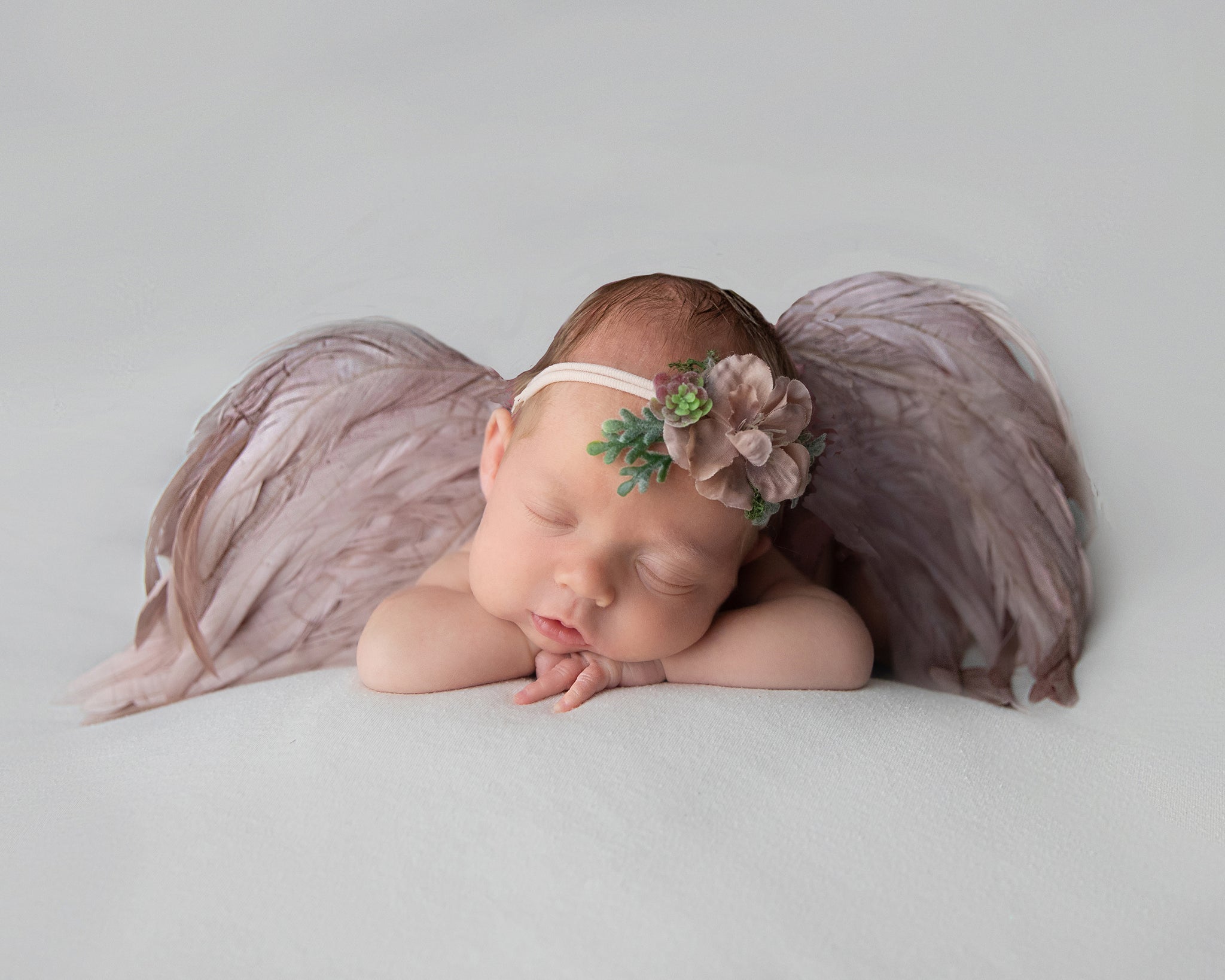 The Priscilla Infant Angel Wing features luxurious rose mauve rooster feathers on a flexible bendable frame for easy posing options.