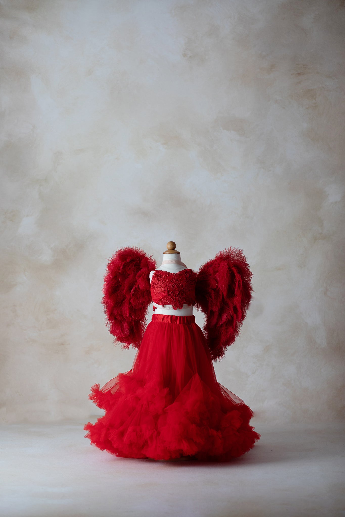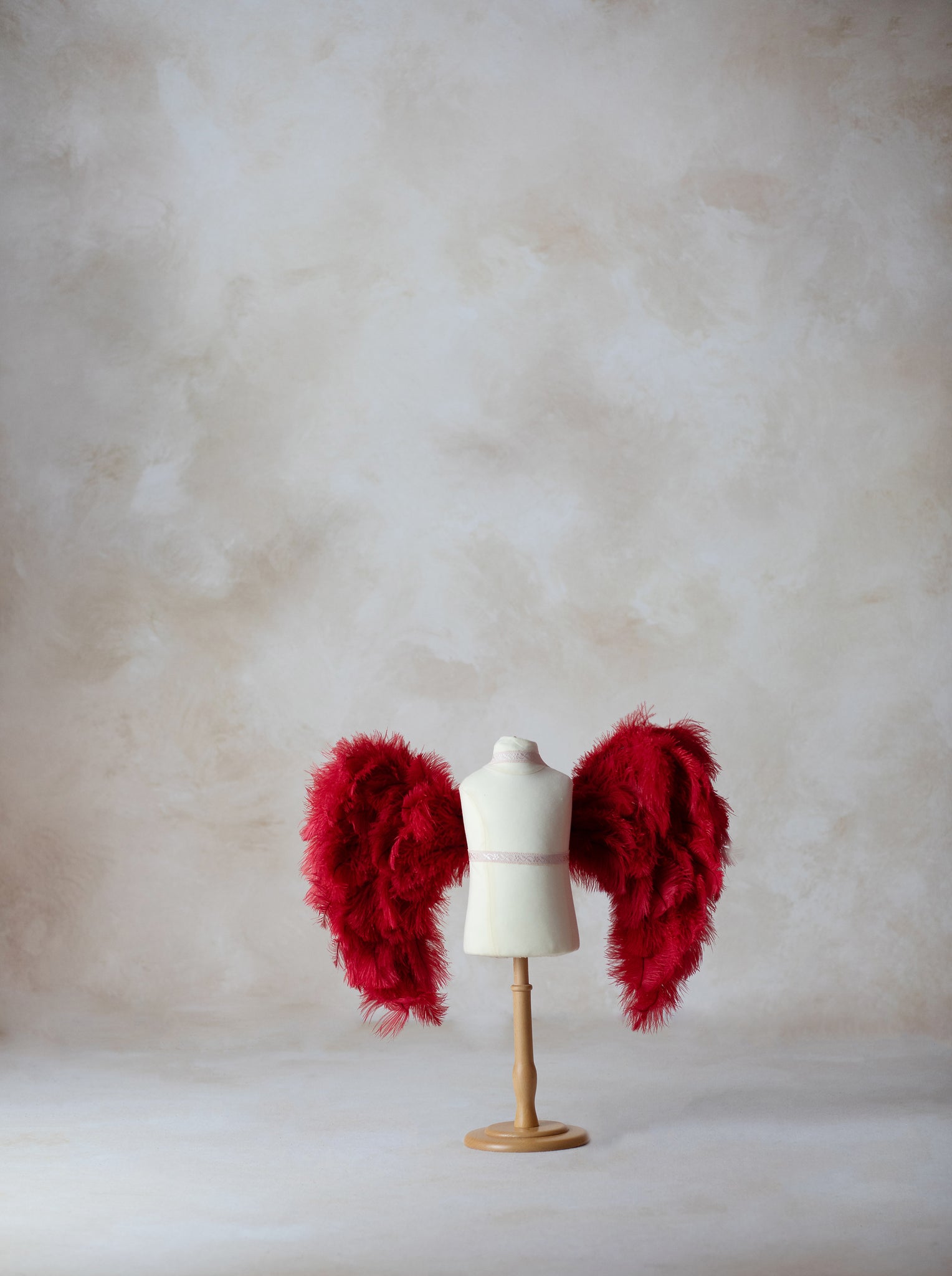 This classic red baby angel wing. Baby sized wings work for newborn, sitter and children session. This handmade wing features red ostrich feathers on both sides.