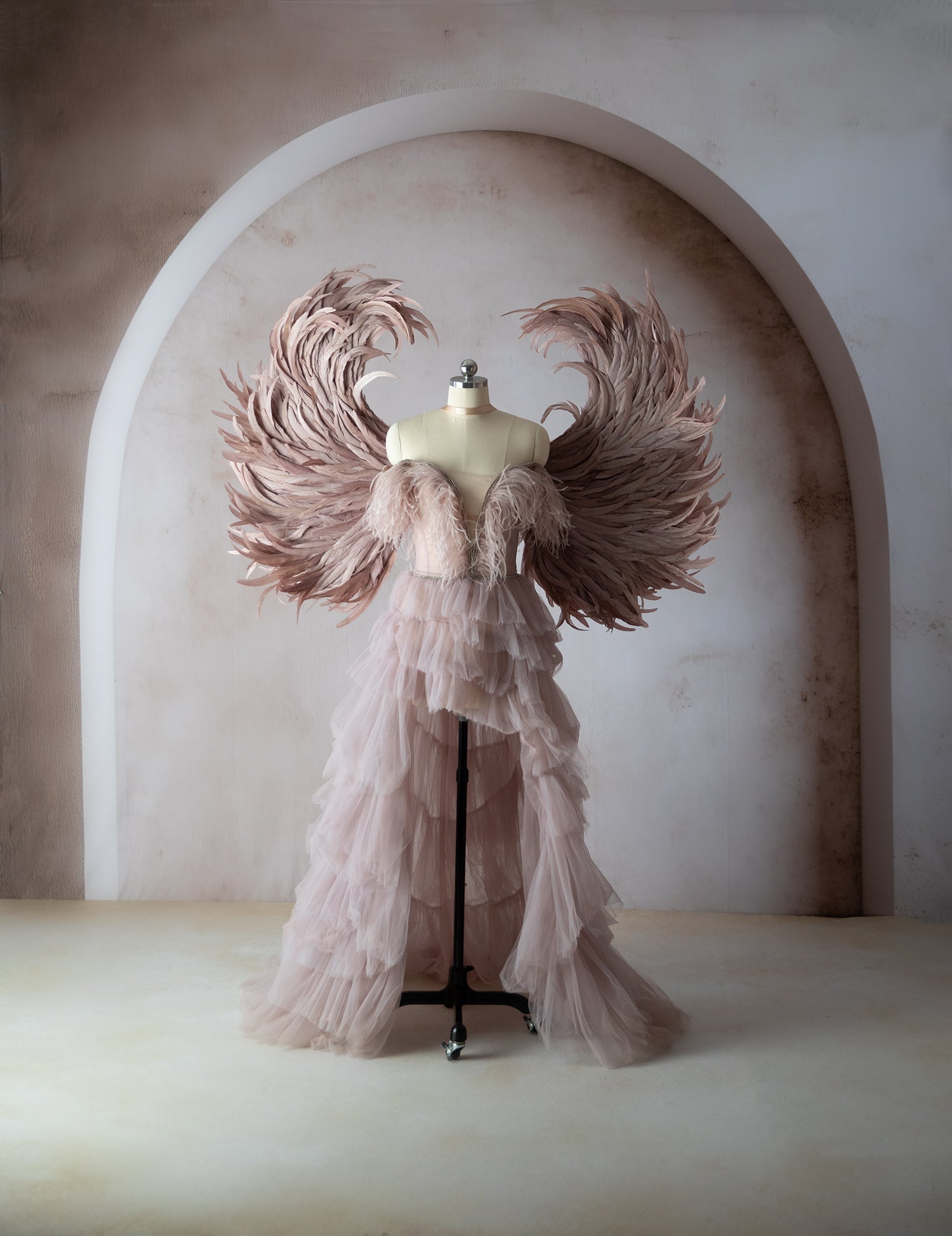 Maev Angel Wing is the sister style to the Chloe, Mercedes and Cora in shape featuring the rose mauve pink rooster feather Kyndra Jade is known for. Gown sold separately. You may have watched this wing be made live on #wingwednesday Check out the Elsie wing to see the little sister wing perfect for Mommy and me sessions.
