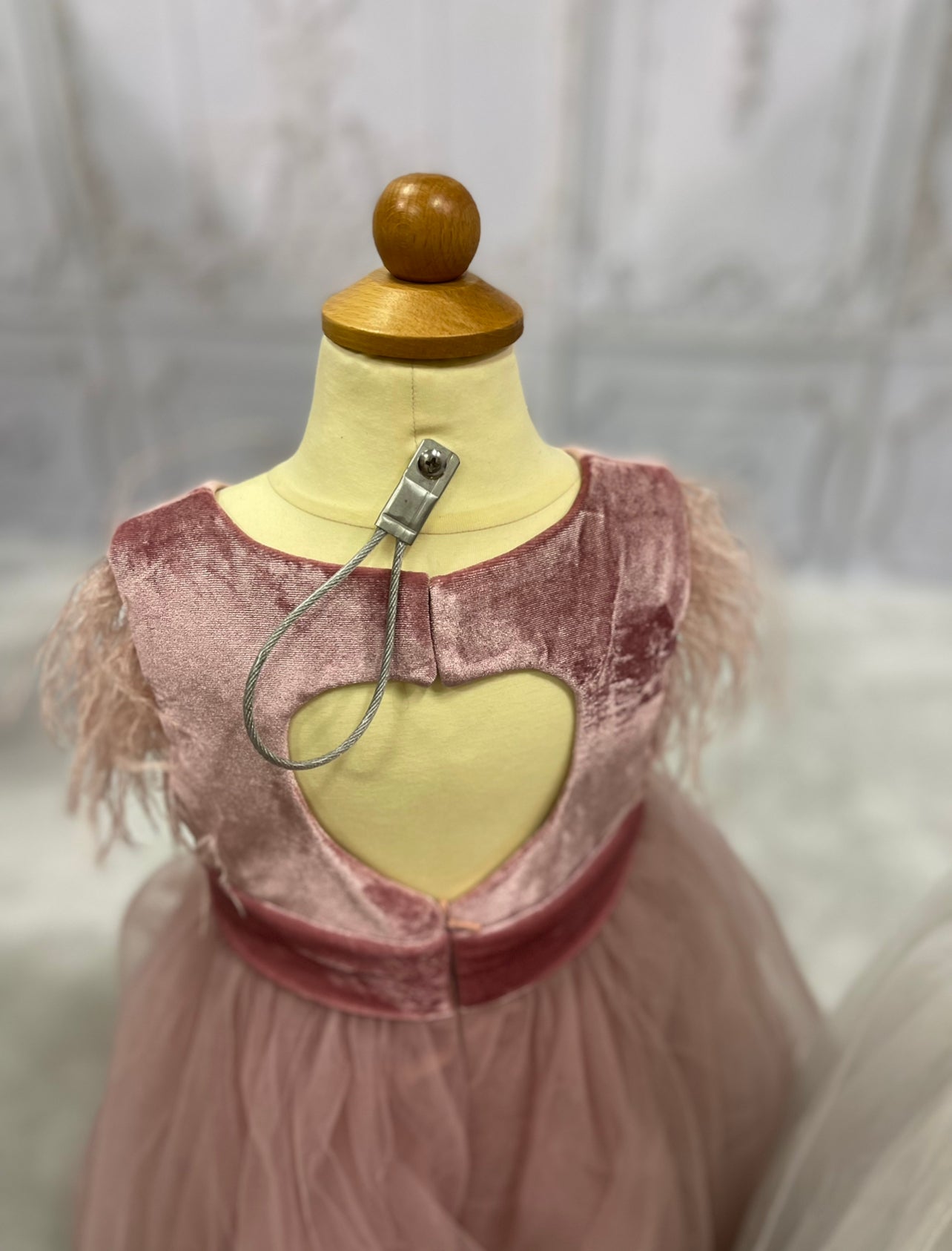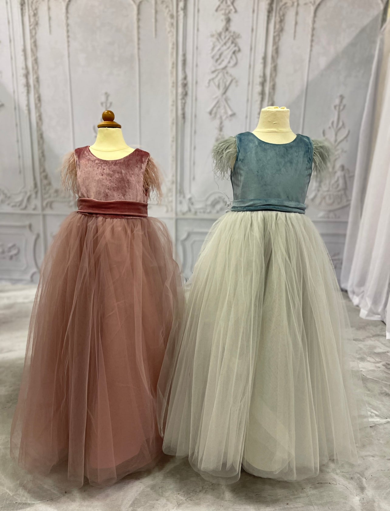 2 worn sample sale children's gown. A beautiful blue and rose pink velvety top with ostritch fringe trim detail on the sleeve. A heart keyhole back bodice and a simple stunning tulle skirt. This gown has a production...Read more