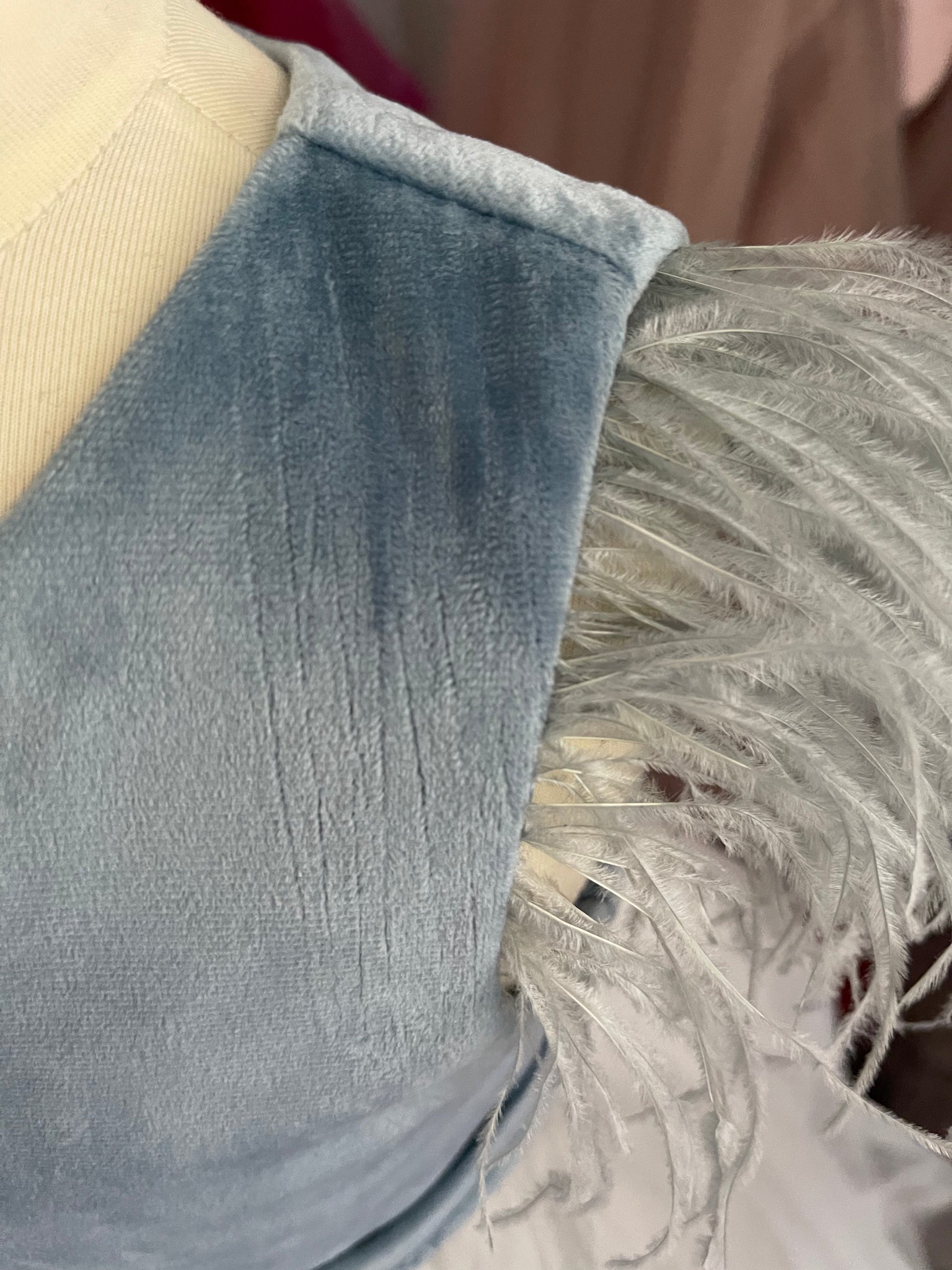 A beautiful blue and rose pink velvety top with ostritch fringe trim detail on the sleeve. A heart keyhole back bodice and a simple stunning tulle skirt. This gown has a production defect on the shoulder little streaks in the fabric. We don't do less than perfect so enjoy the clearance