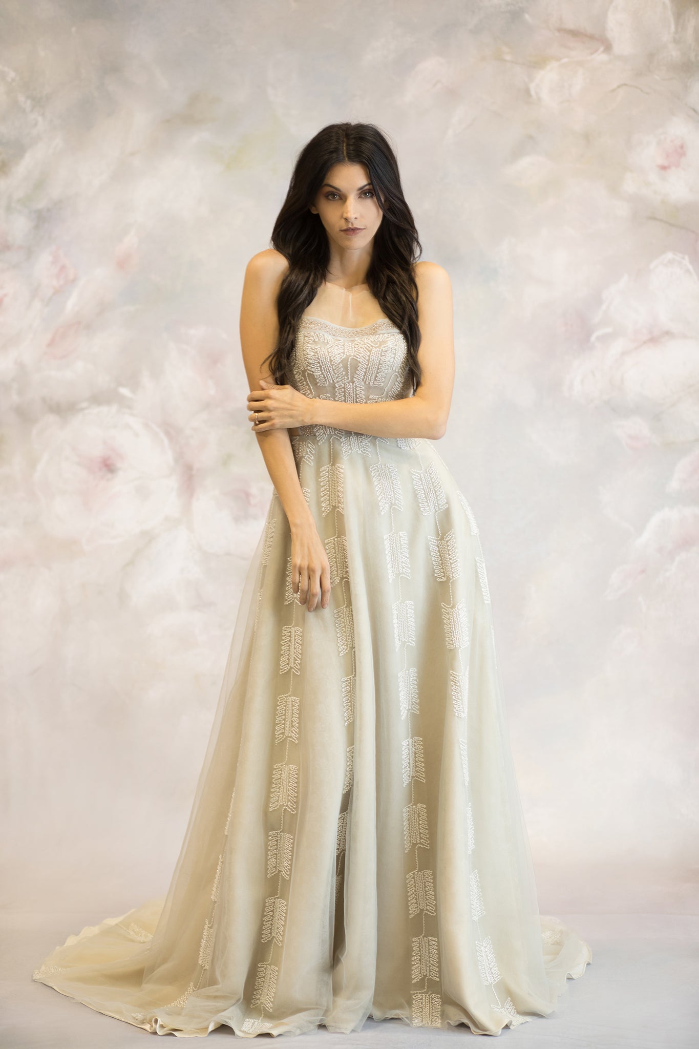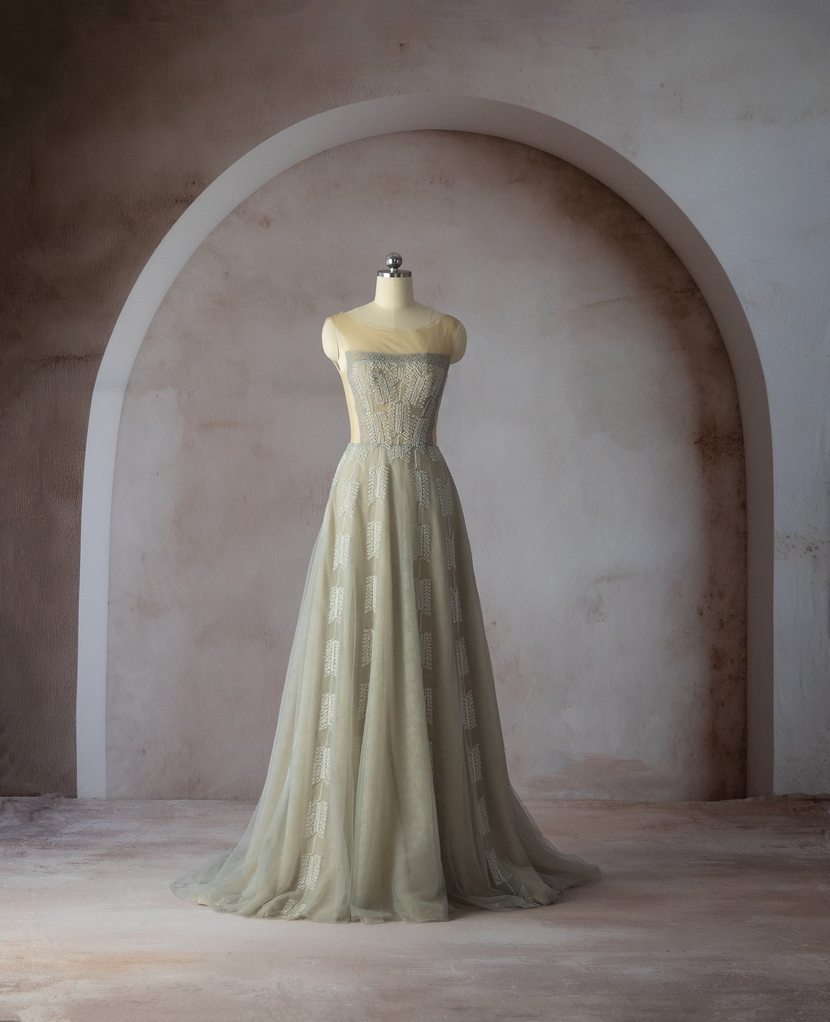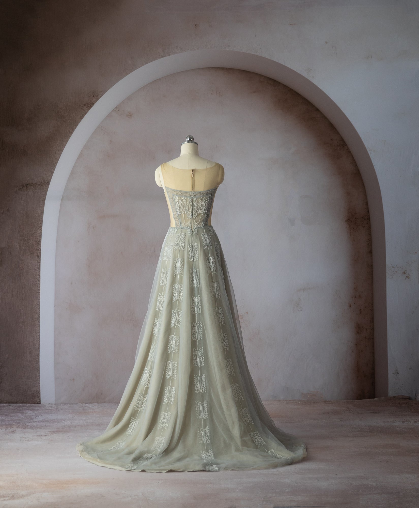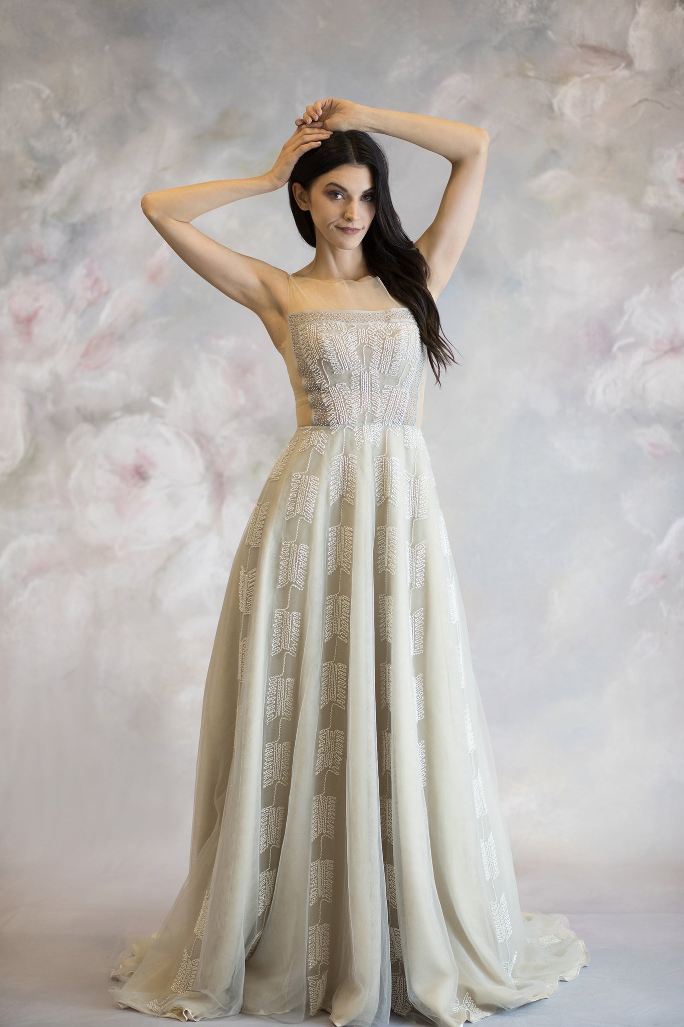 Aurora Gown is a custom made to order gown. A gray chiffon and tulle layer. Intricate hand beading. Zipper closure back. Tulle bodice allows support and a touch of modesty. A perfect alternative bridal gown.