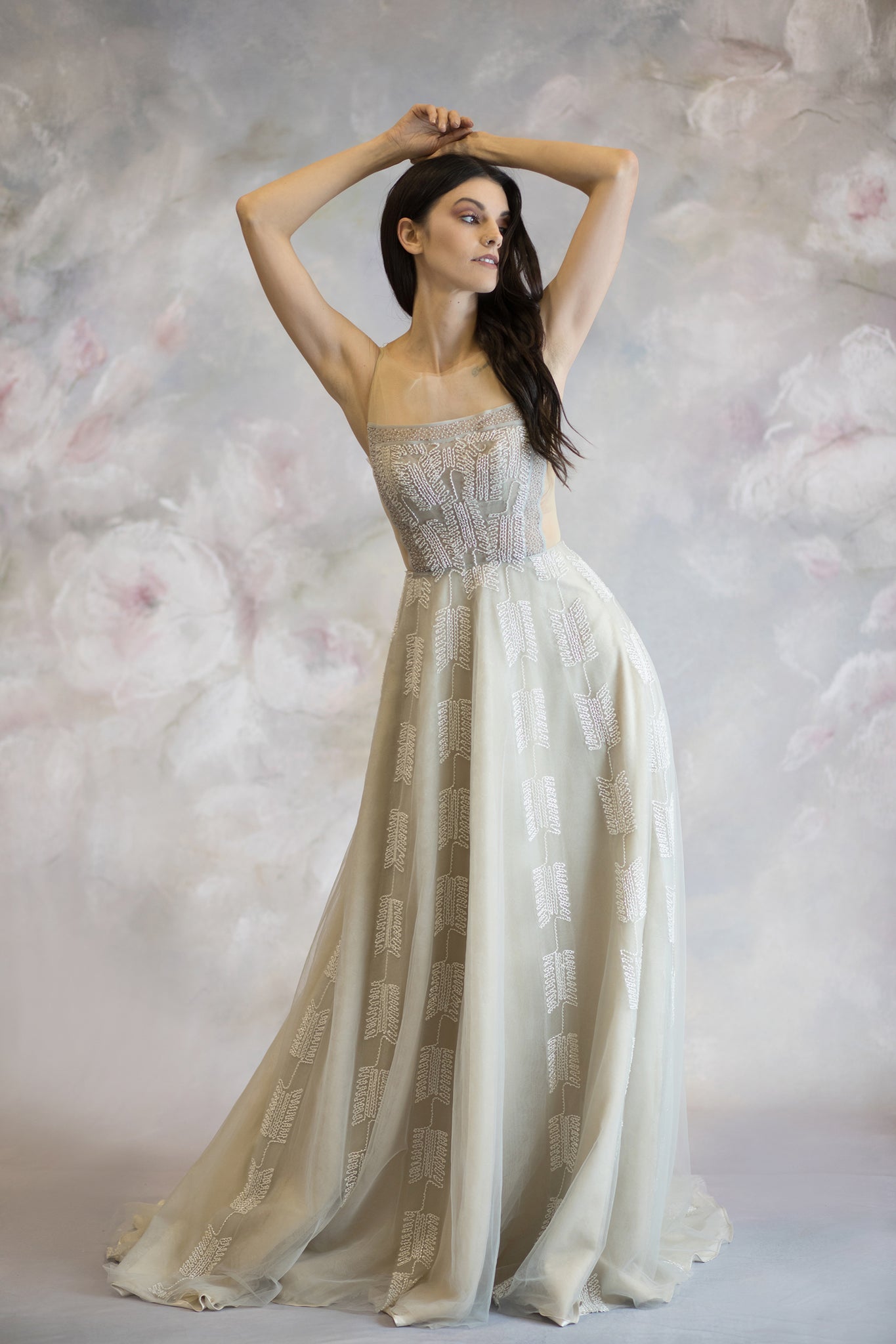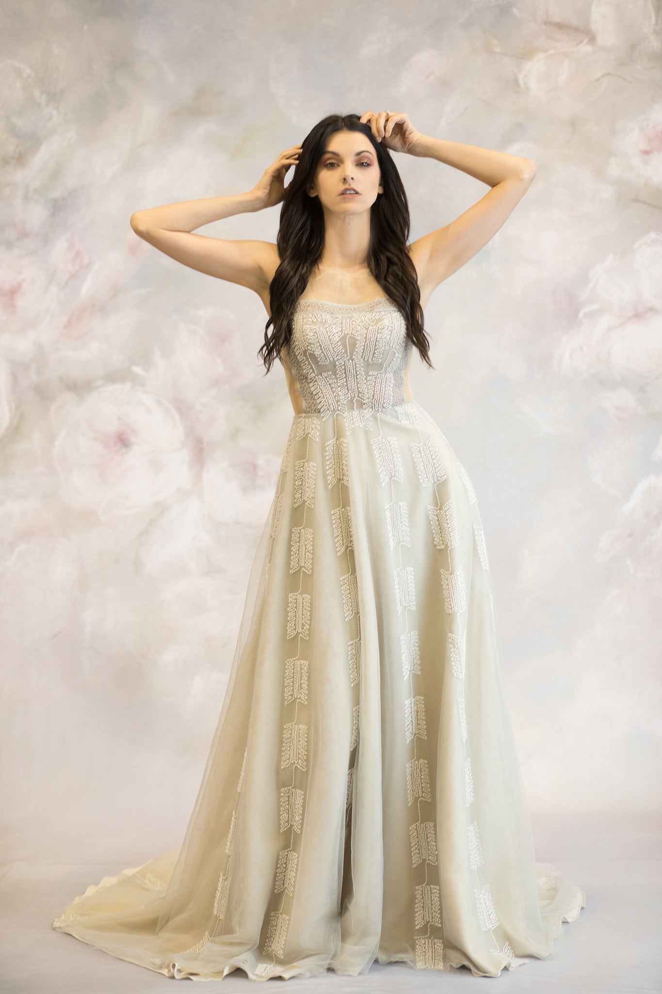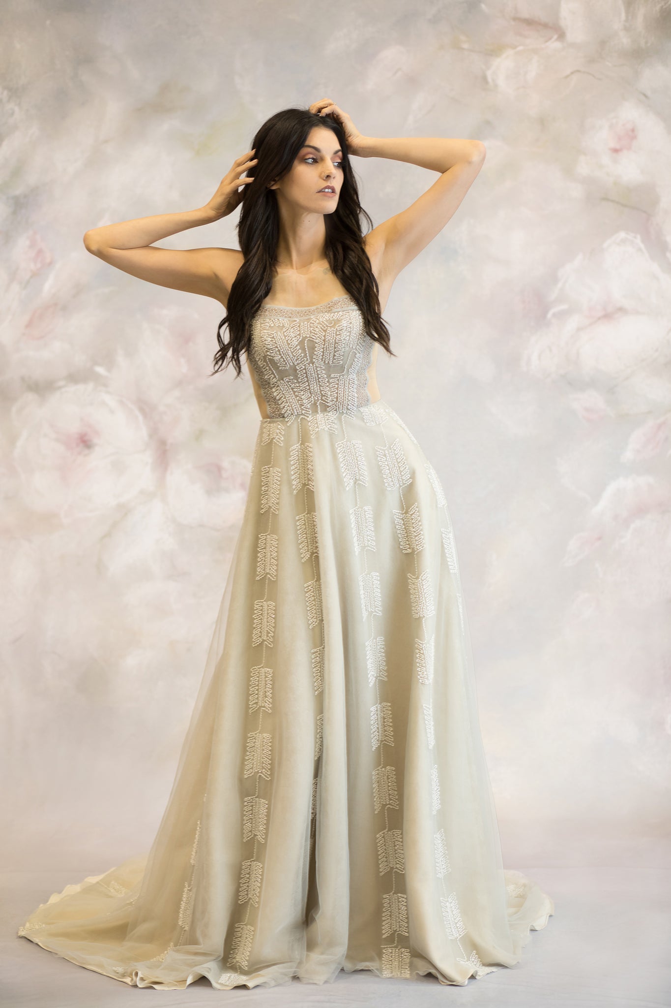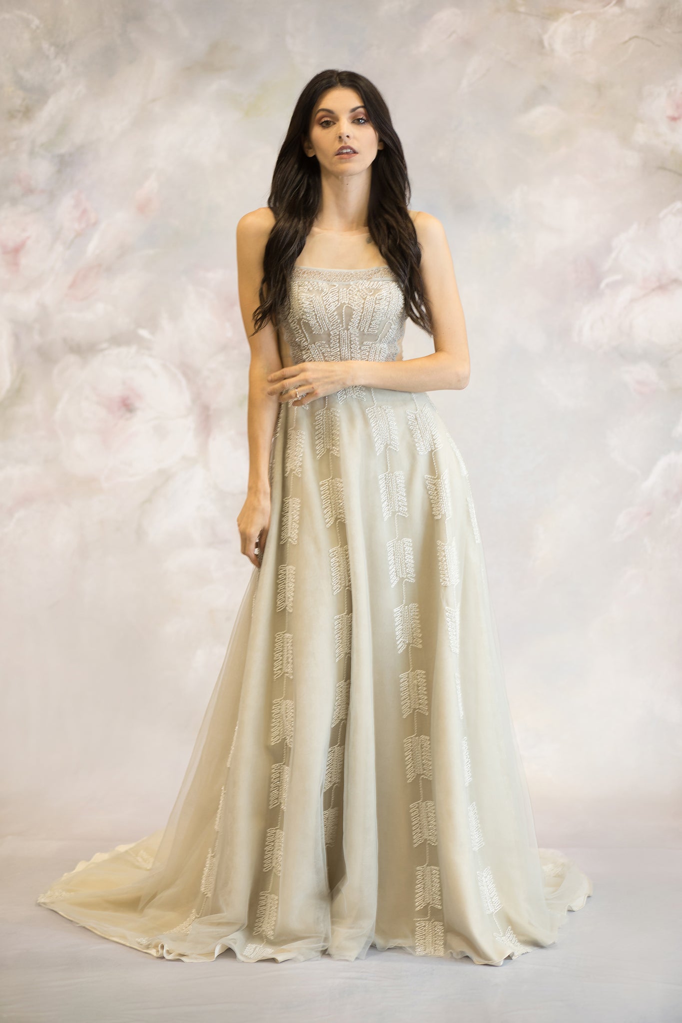 Aurora Gown is a custom made to order gown. A gray chiffon and tulle layer. Intricate hand beading. Zipper closure back. Tulle bodice allows support and a touch of modesty. A perfect alternative bridal gown.