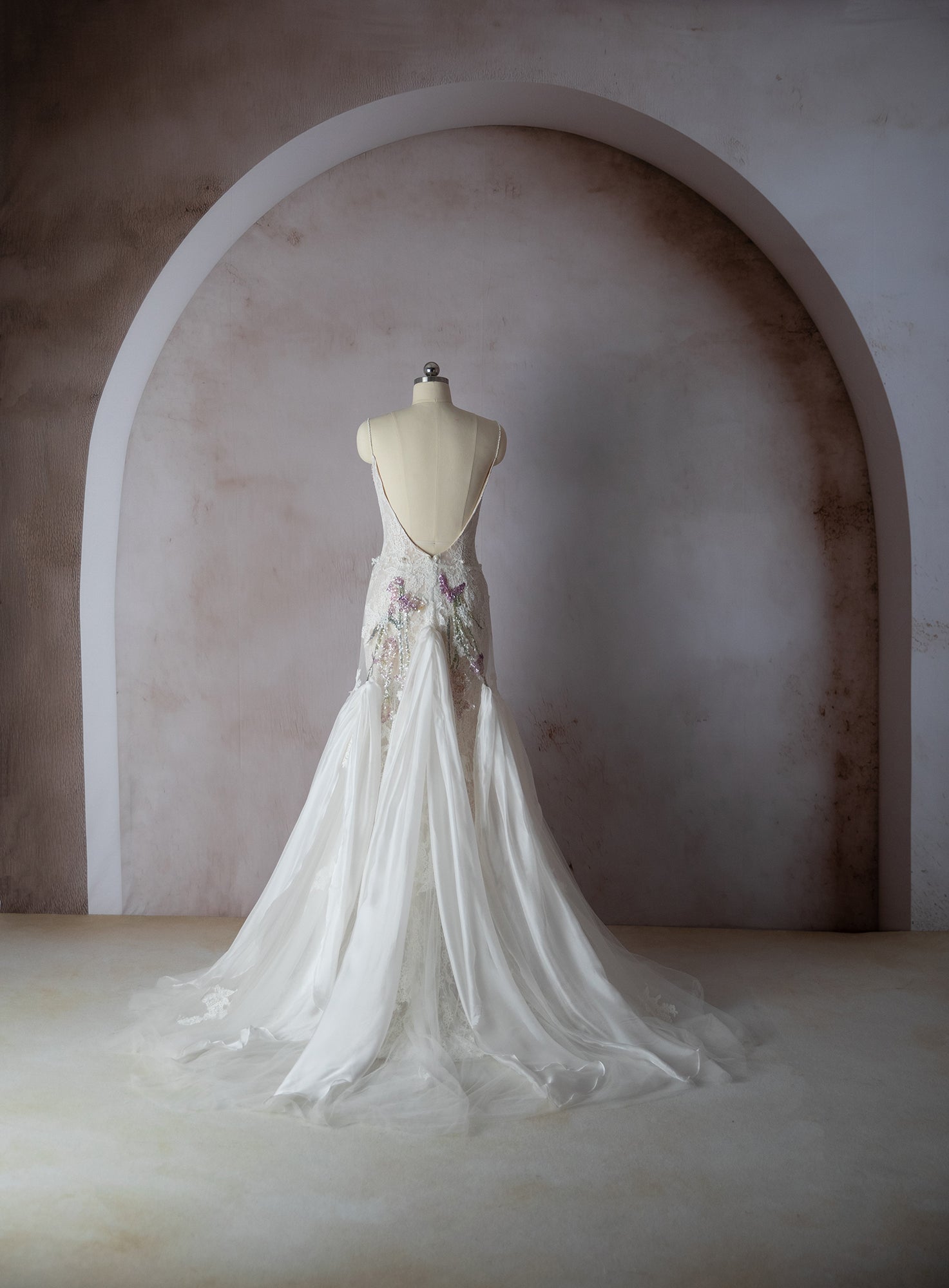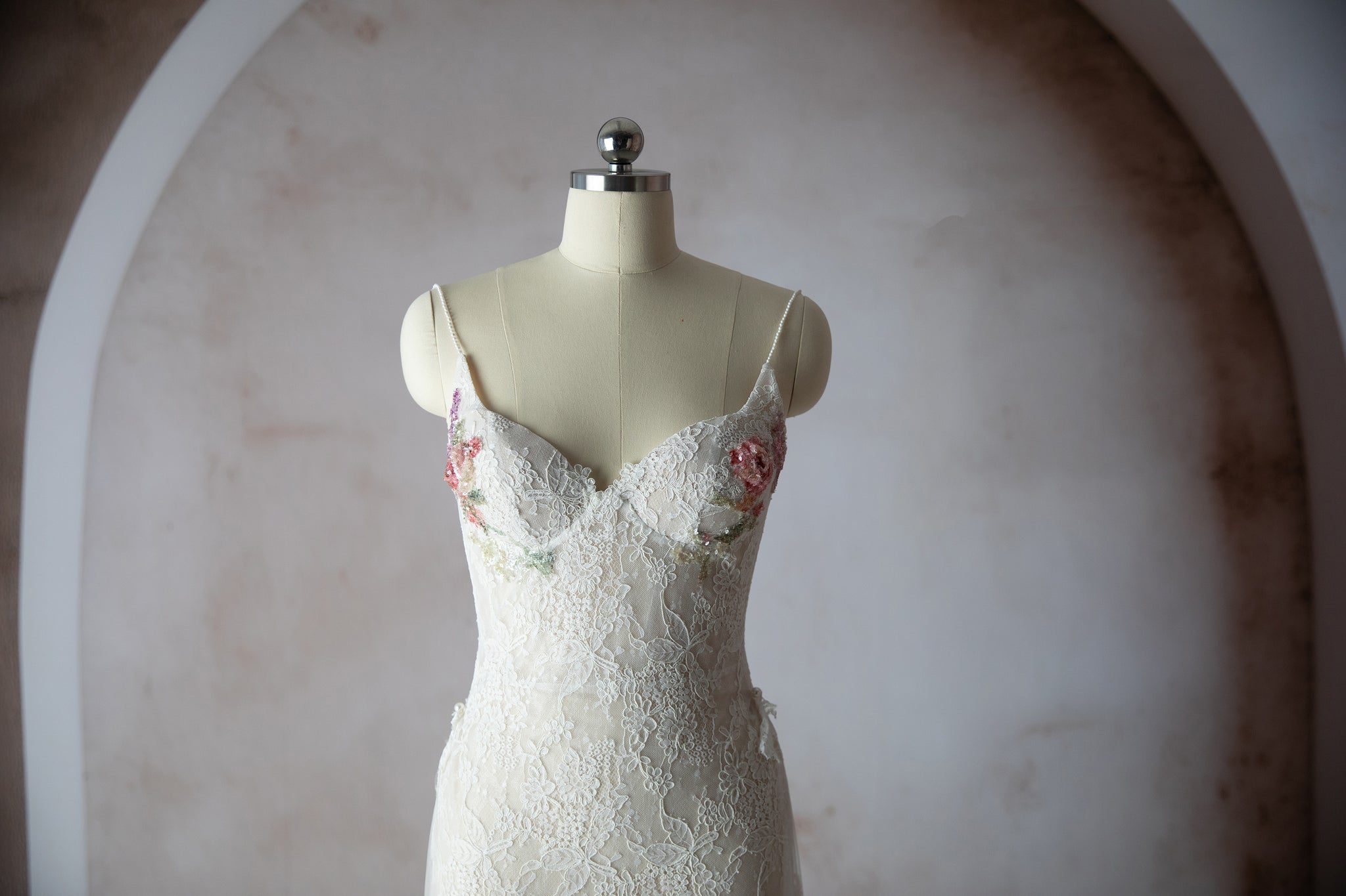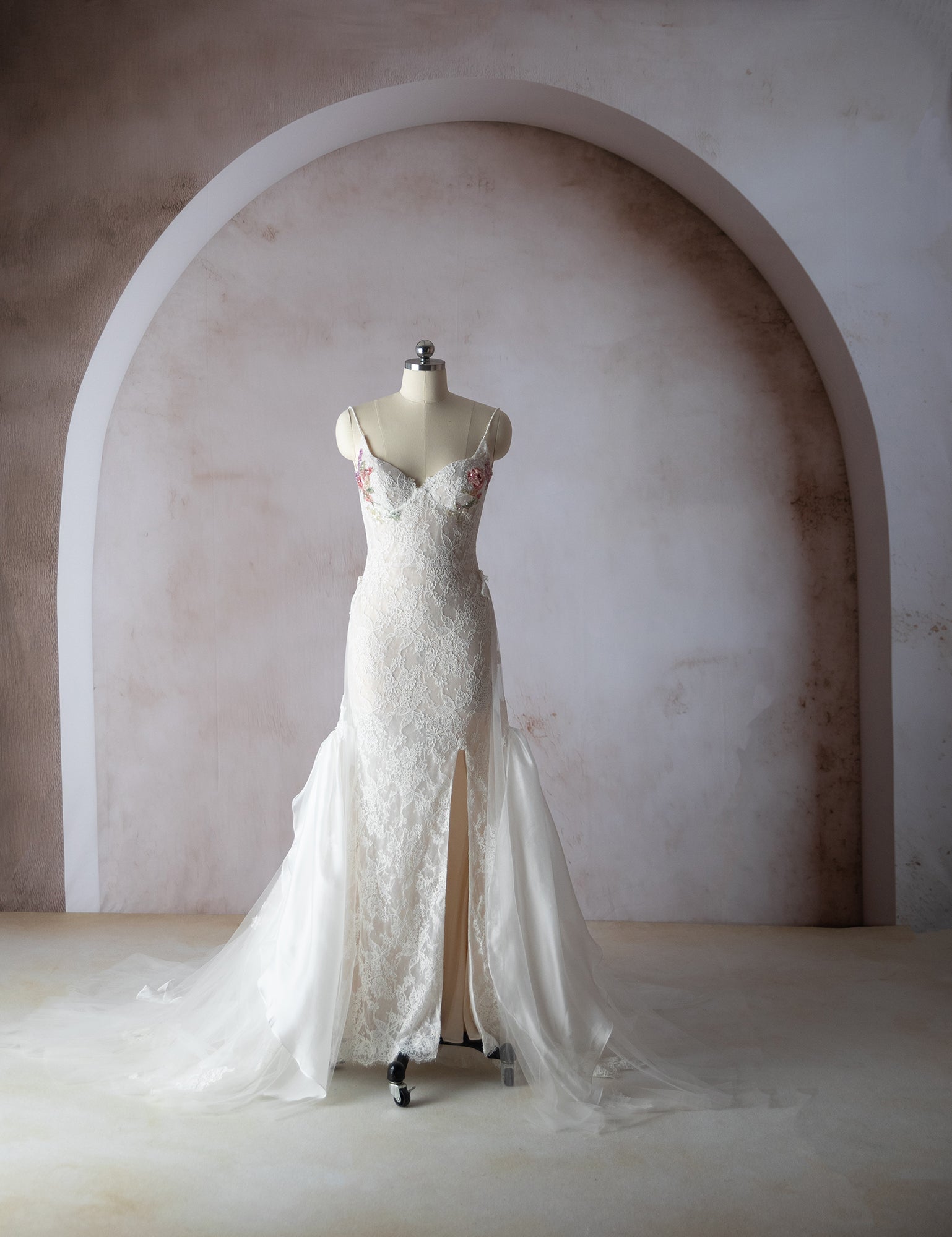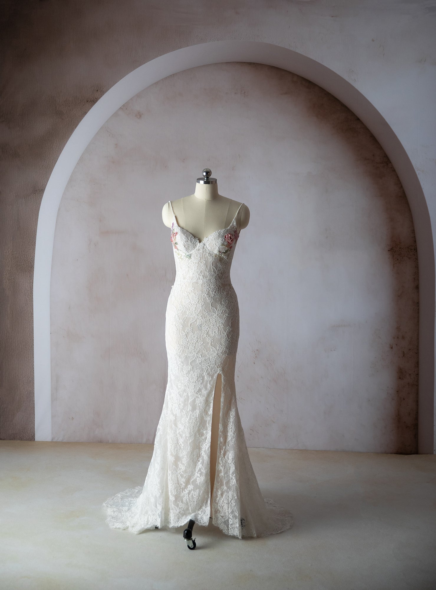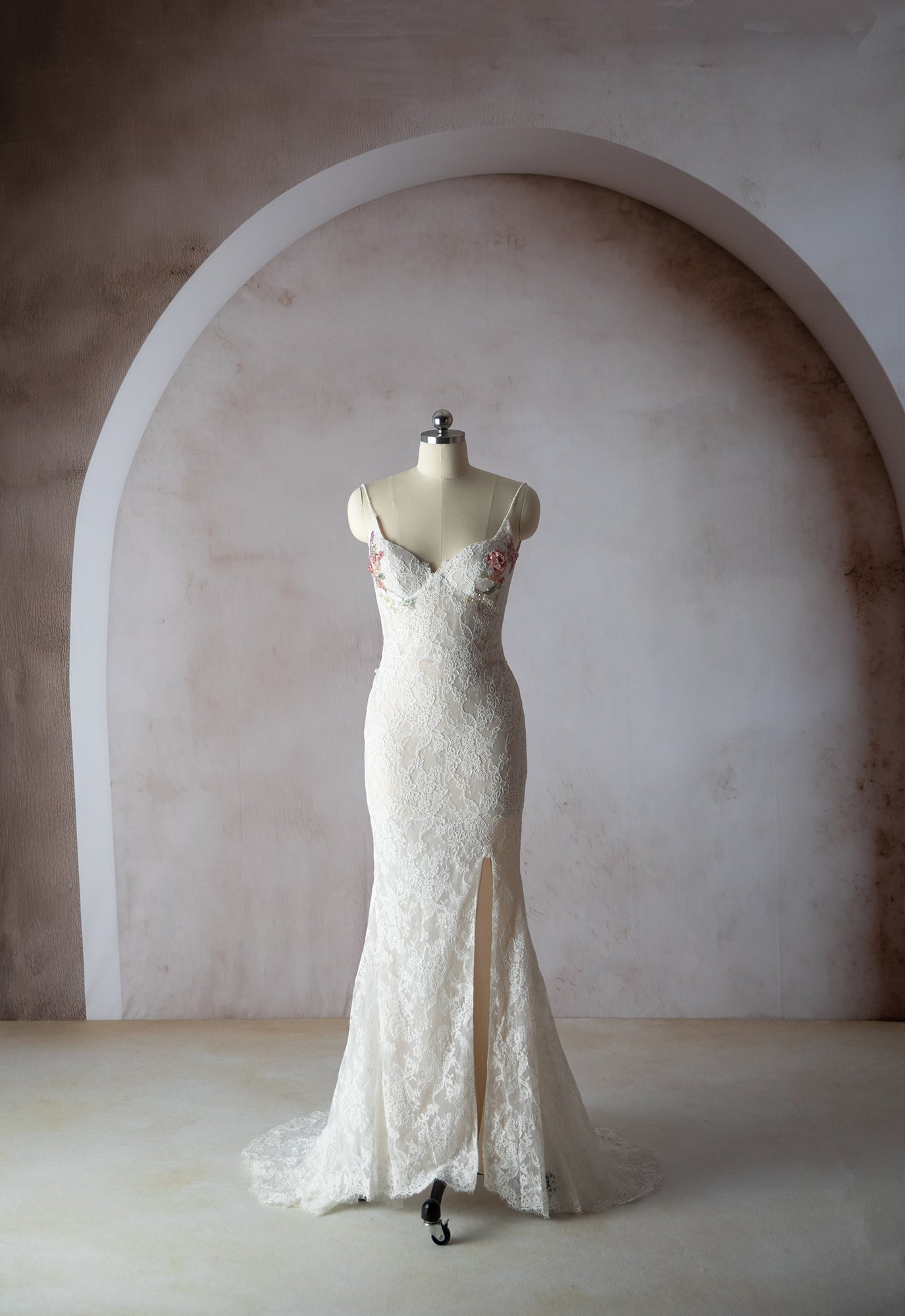 Nicola Gown is a custom made to order gown. A lace gown with elegant slit and small train. Hand sequin floral on the cups. Low back with zipper closure. Alluring removable snap on train adds an alluring element for your ceremony and detach to dance the night away.