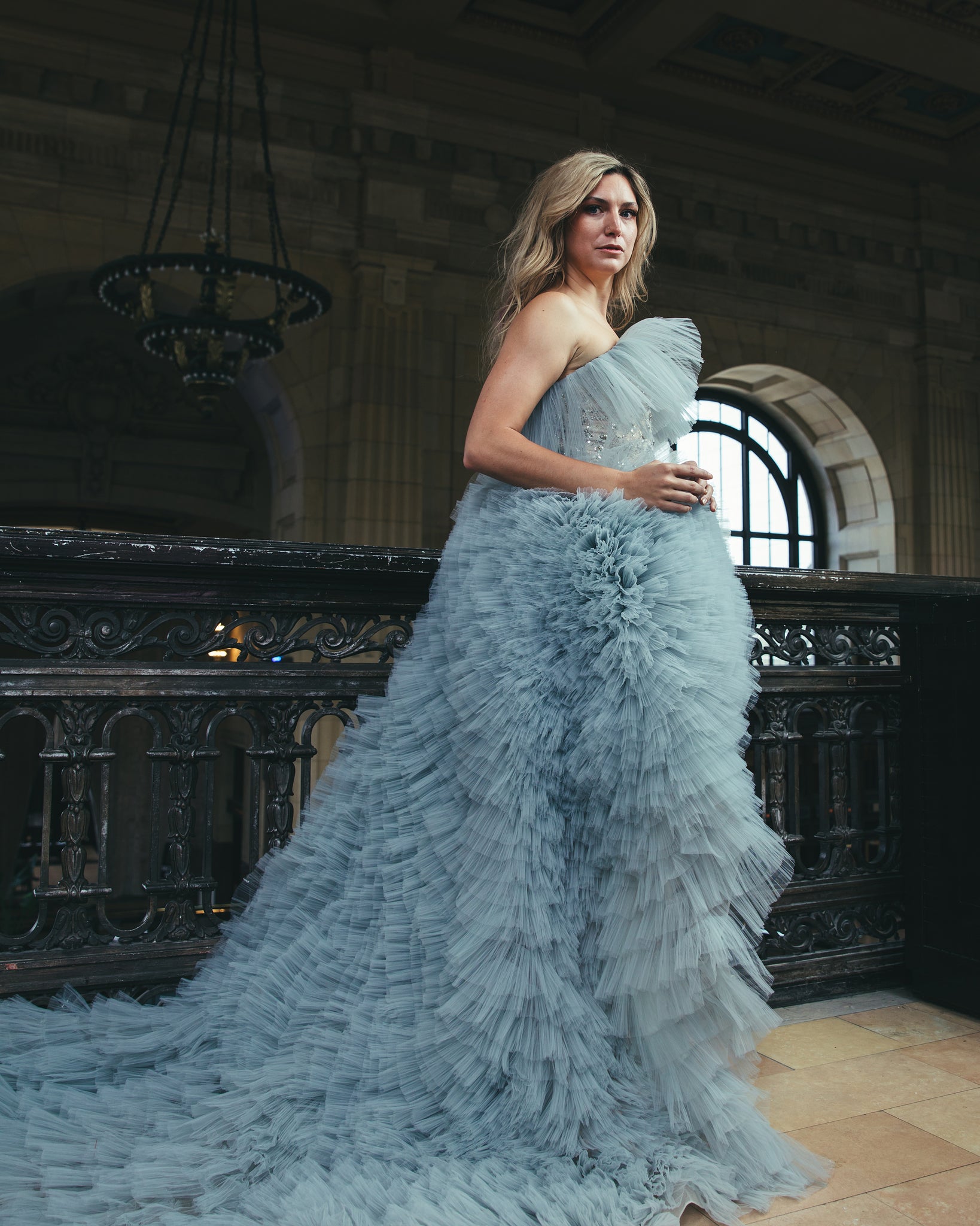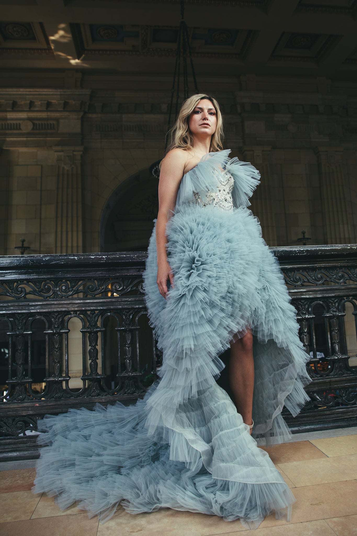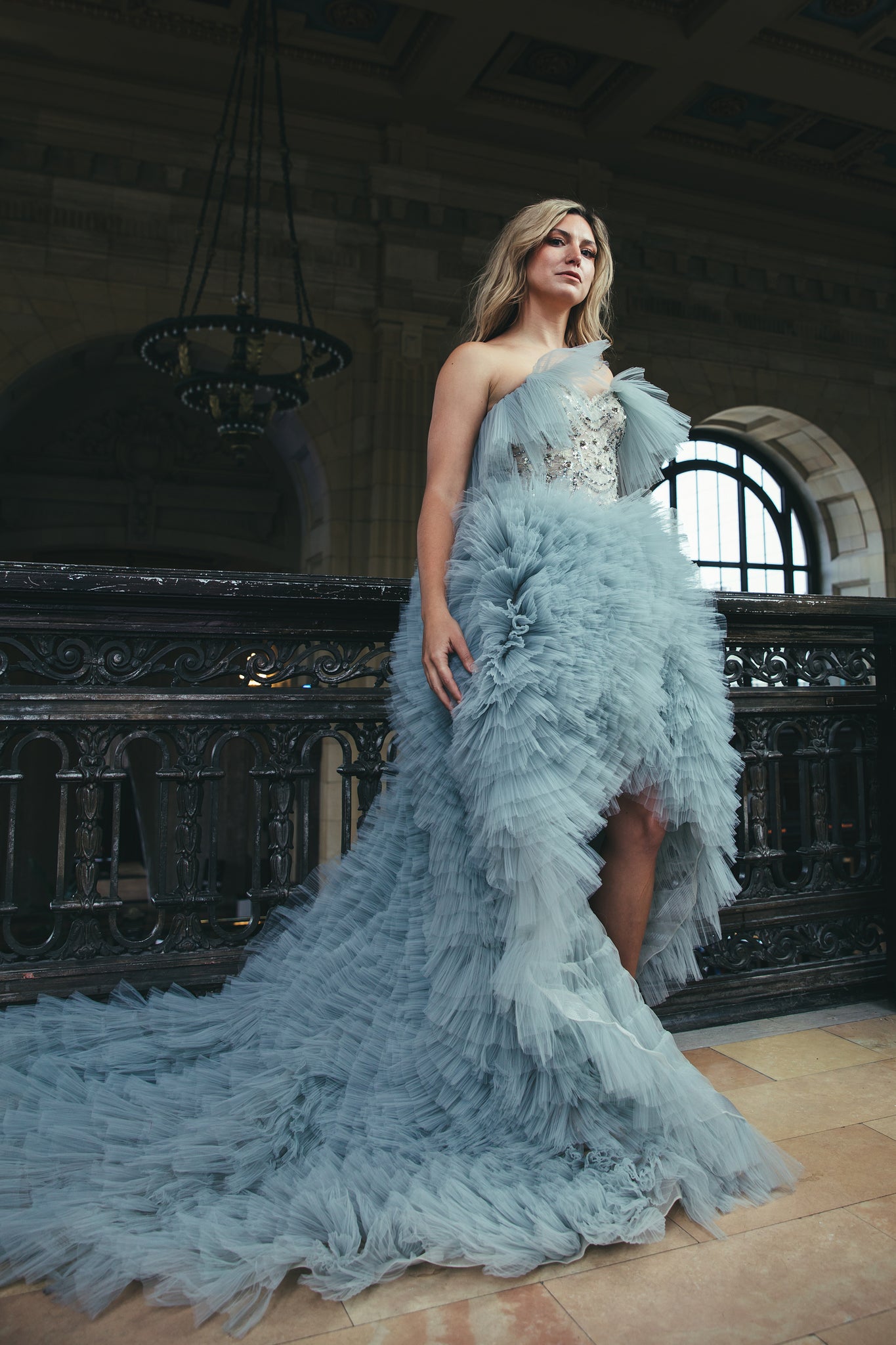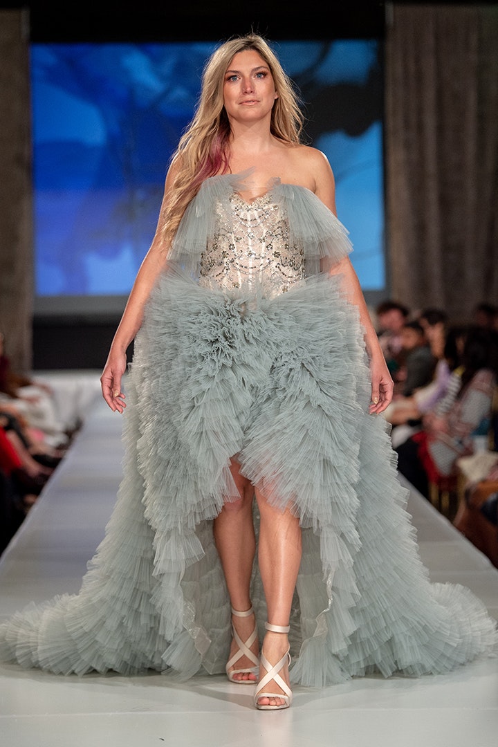 The Angela gown is a blue gray tulle gown. It features a high low skirt with layers of tulle ruffles and long train. The bodice features a sequin hand embroidered top with cute tulle accents at the top.