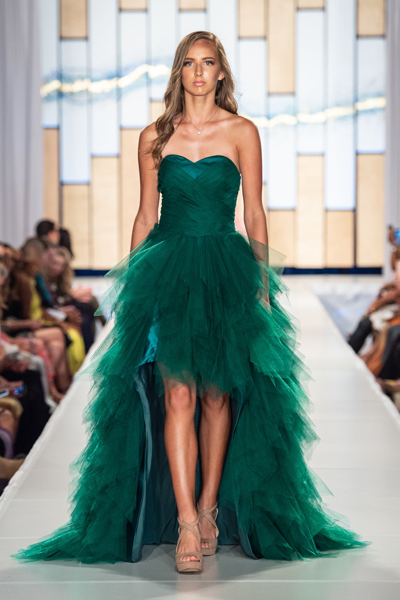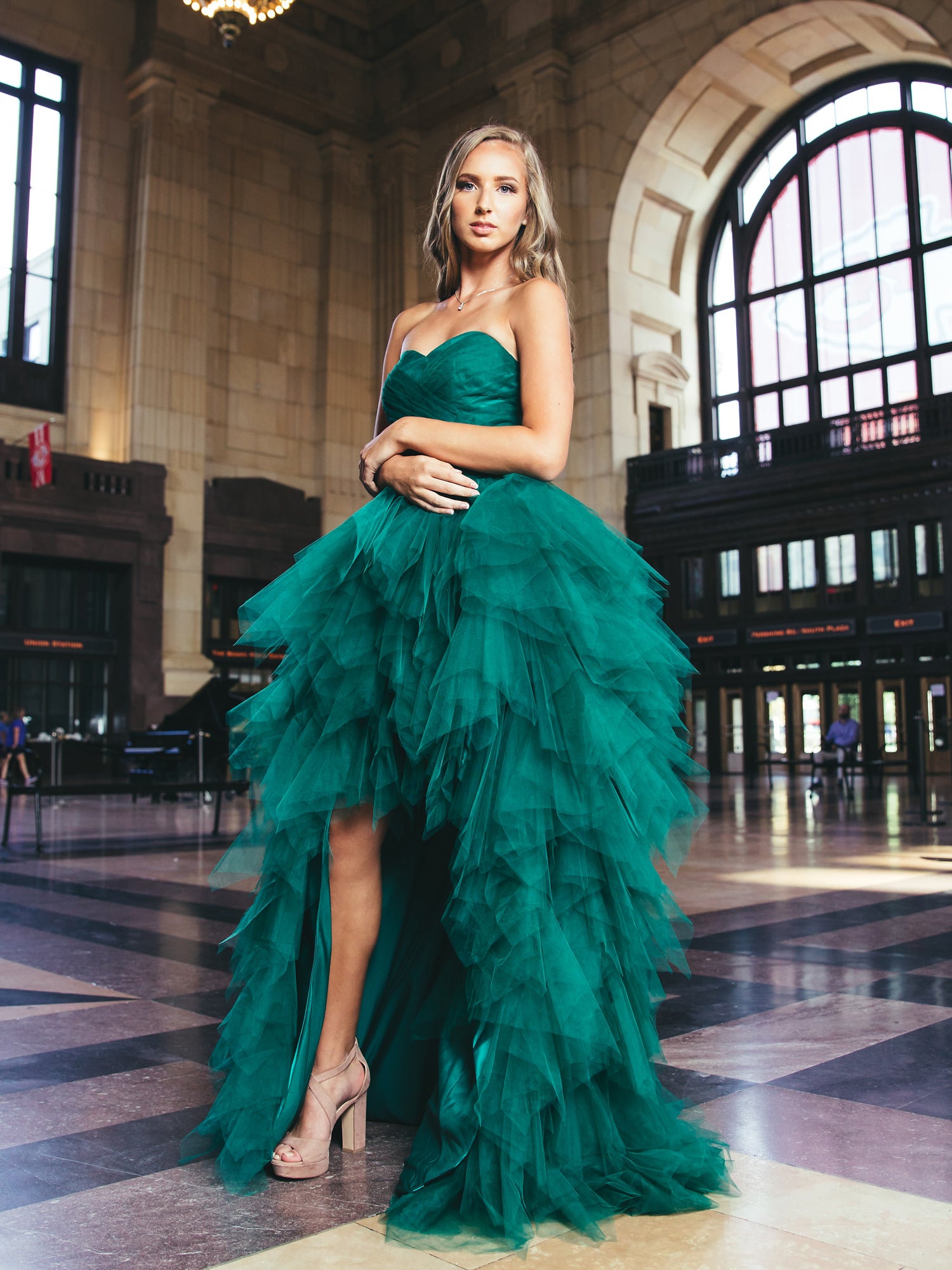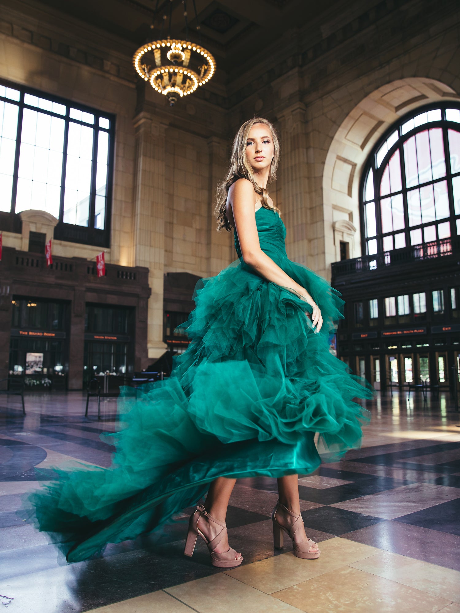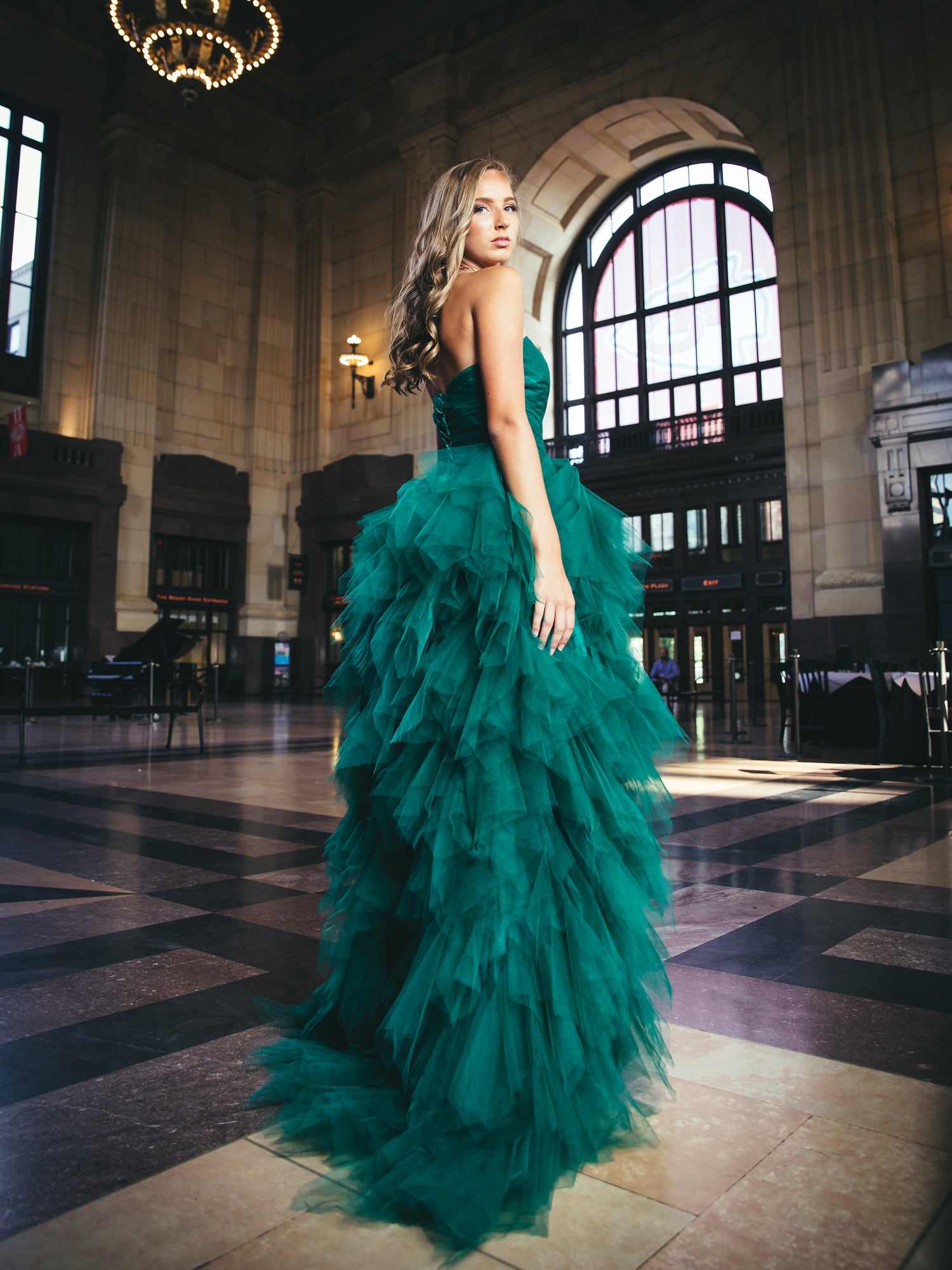 Kyndra Jade gown released from the Kansas City Fashion Week runway at Union Station. This Emerald green tulle gown features a high low skirt. Corset back for a flexible size. Made to order please allow 4-6 weeks for production after final measurements are confirmed.