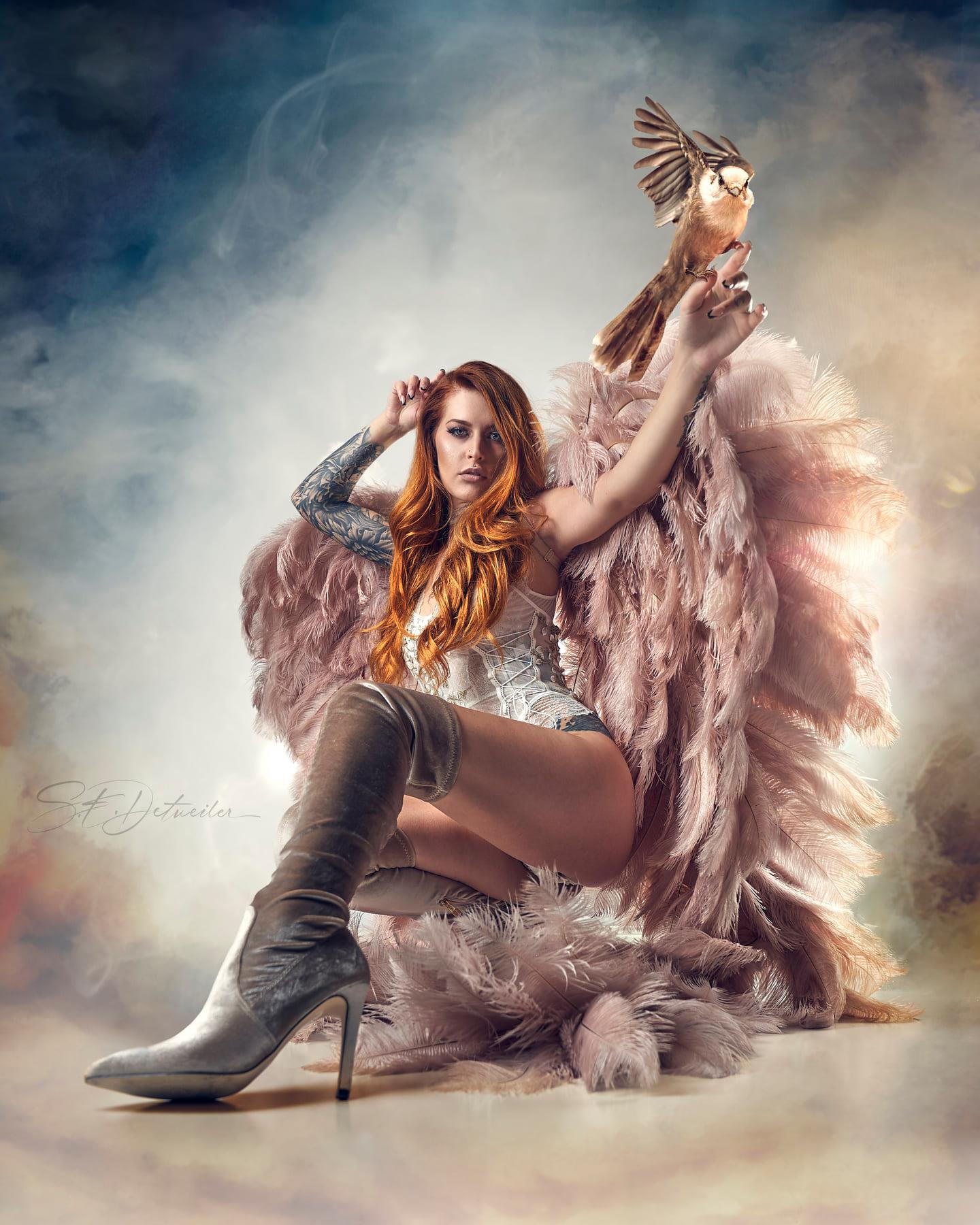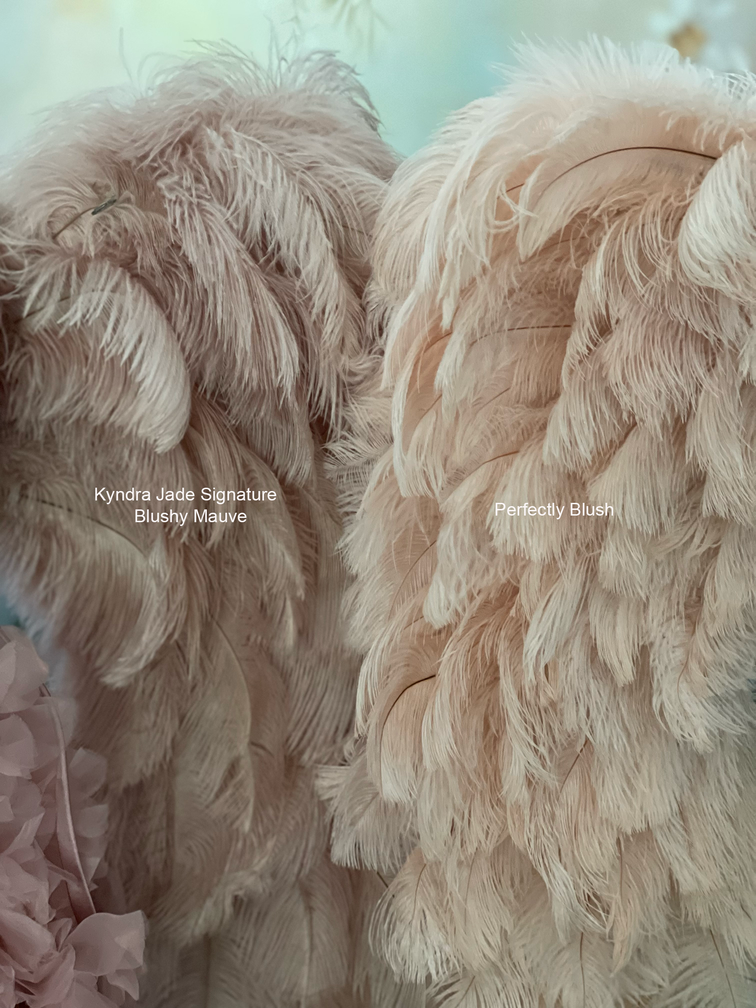 Designer Kyndra Jade's color obsession prompted her to create a custom blushy mauve ostritch angel wings featuring a custom blushy mauve ostrich feathers. Due to the custom handmade nature of this product will vary. Kyndra Jade will combine and place the feathers to the artists' preference.