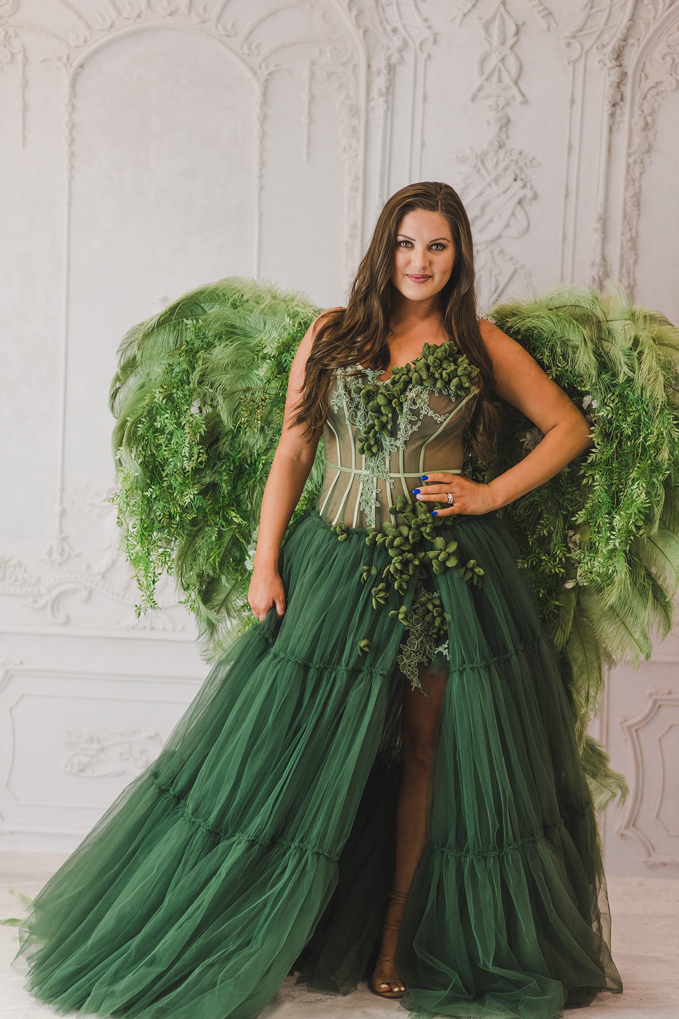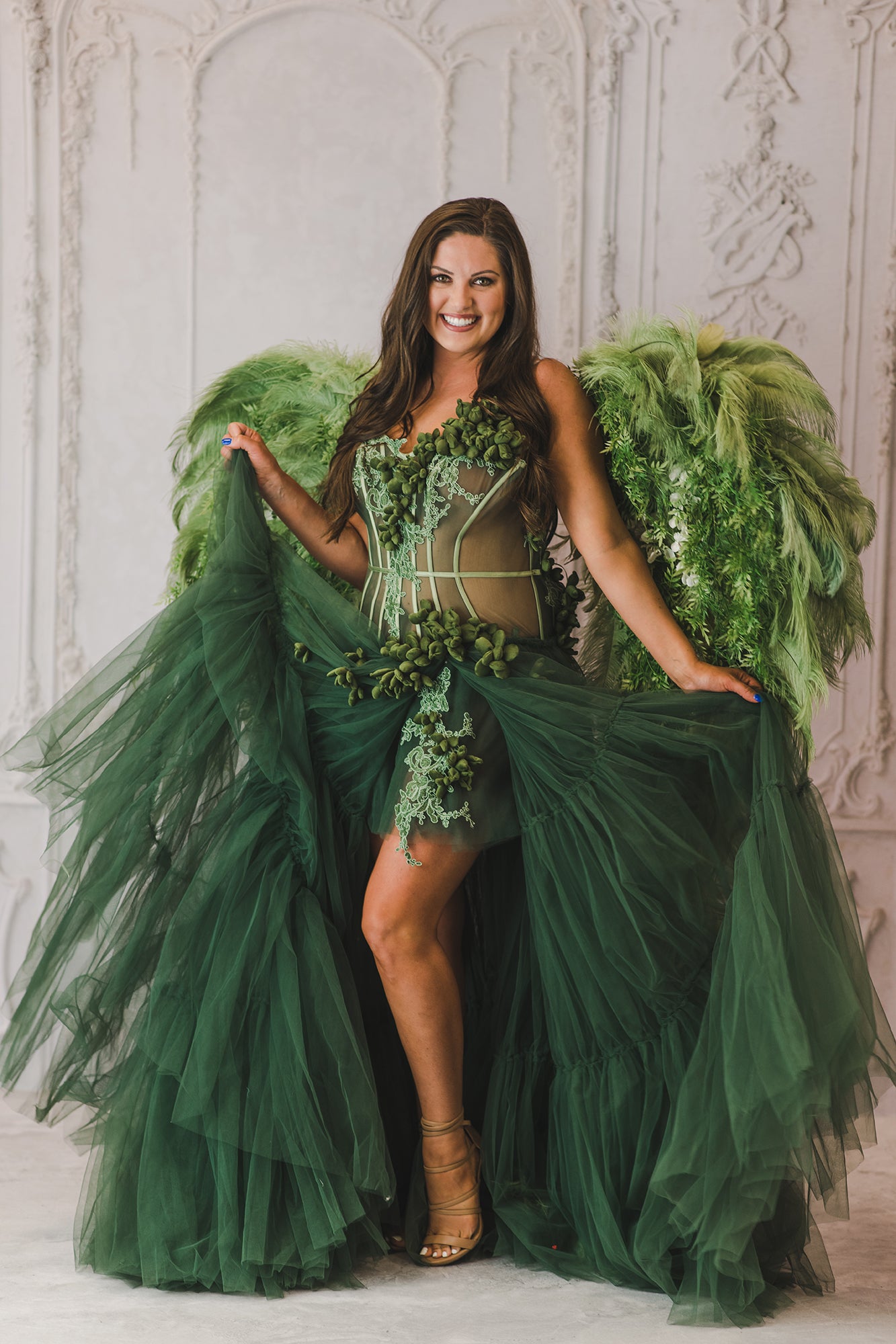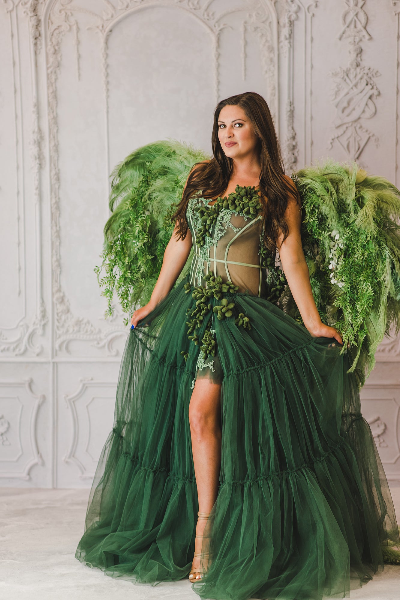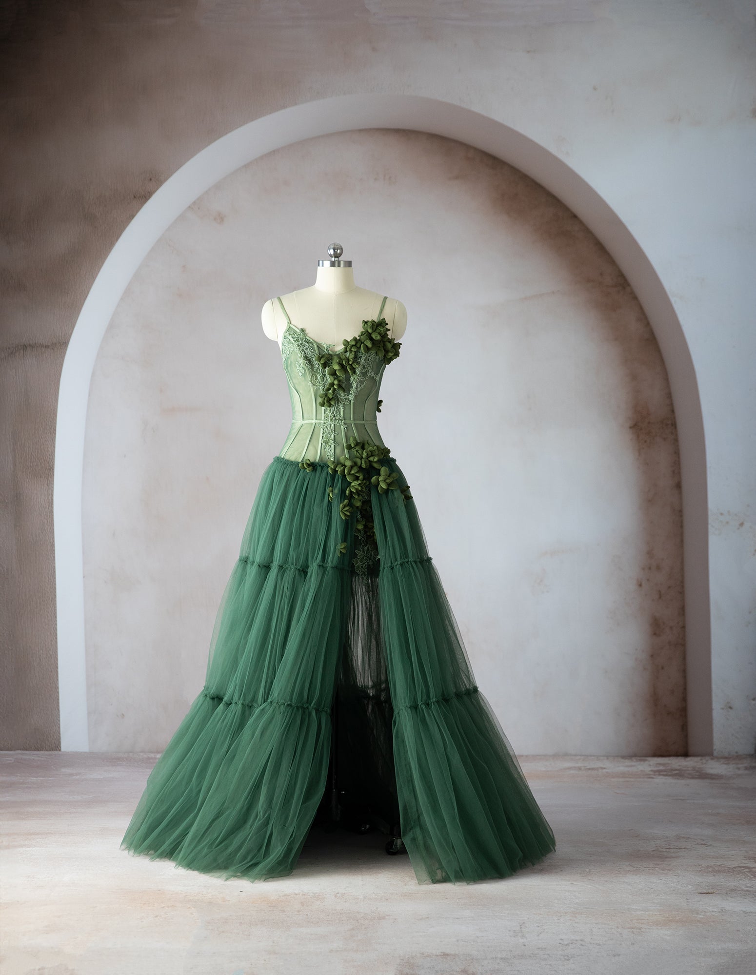 The Marissa Gown is a custom made to order gown. Featuring olive tulle and boning for support. Hand made flowers, ruffles and tiers. This sheer gown is a show stopper. Please allow 12-14 weeks after final measurements are approved. Gown can be made in custom colors.
