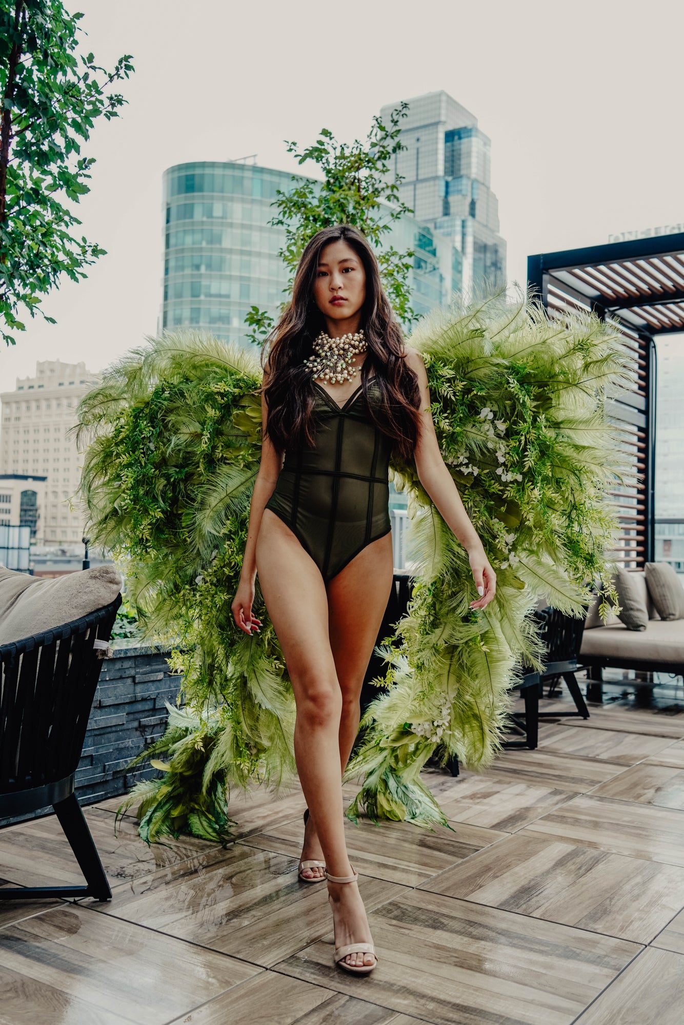 The Moss Crush Angel wings feature olive ostrich feathers, moss, and ivy imitation florals.