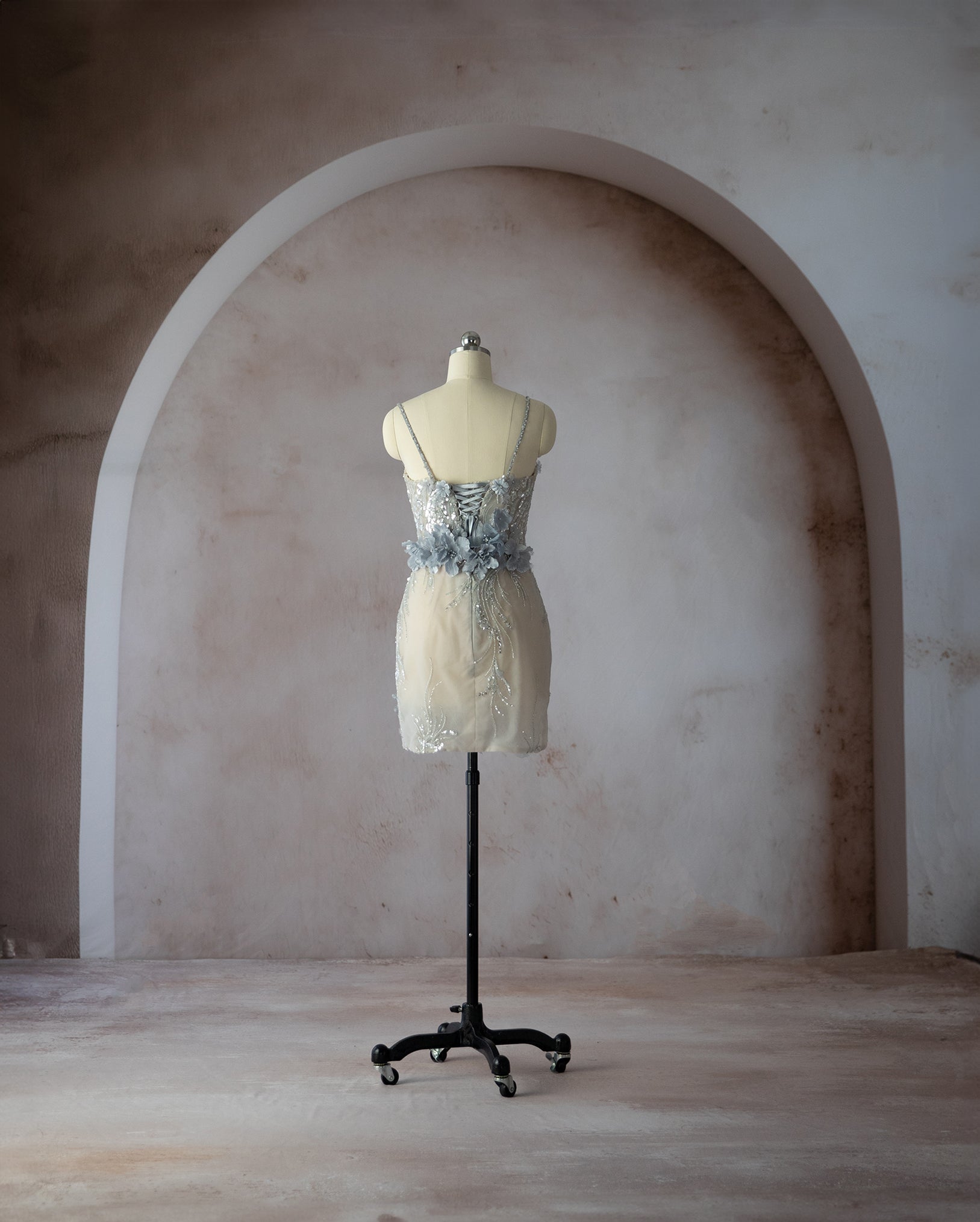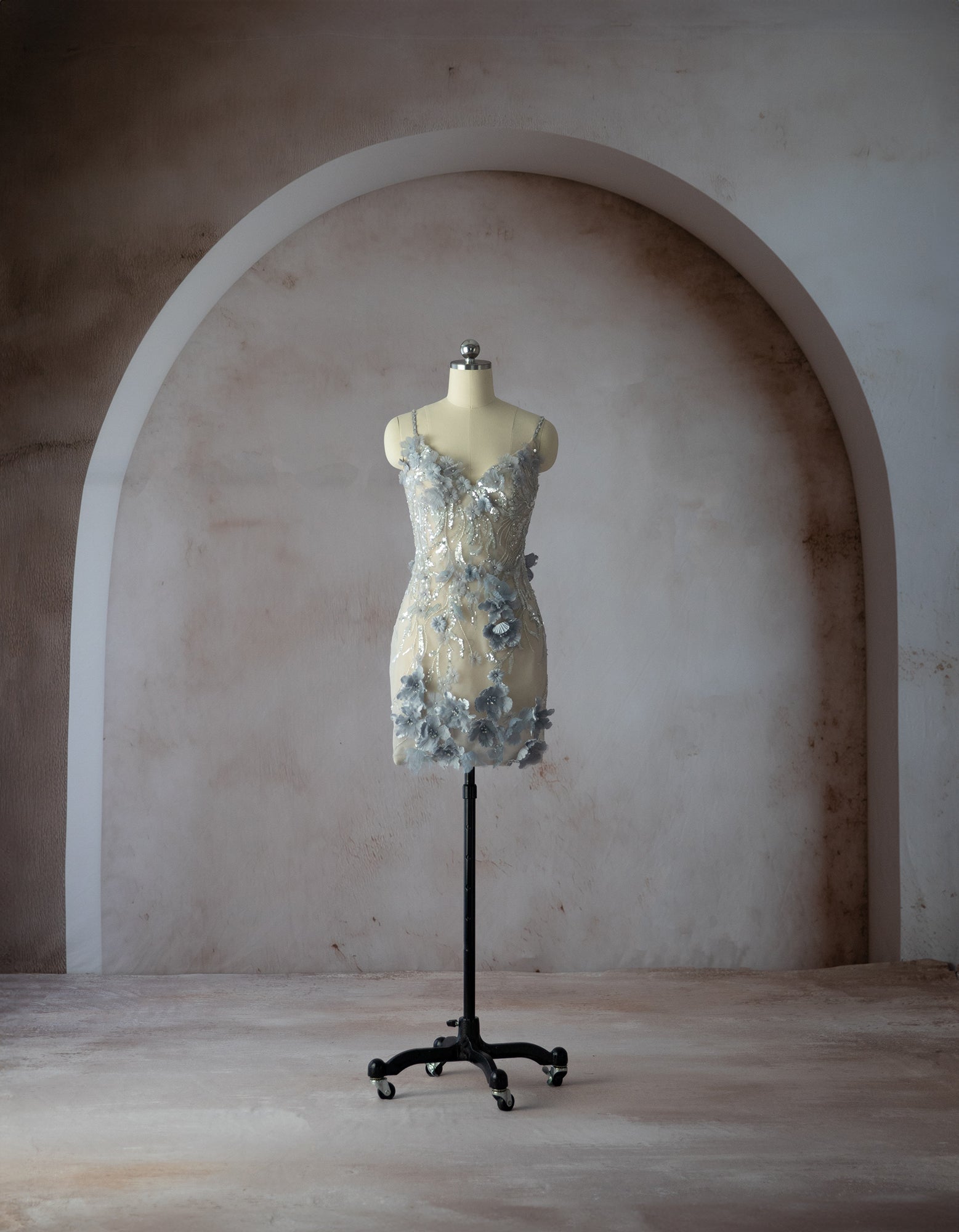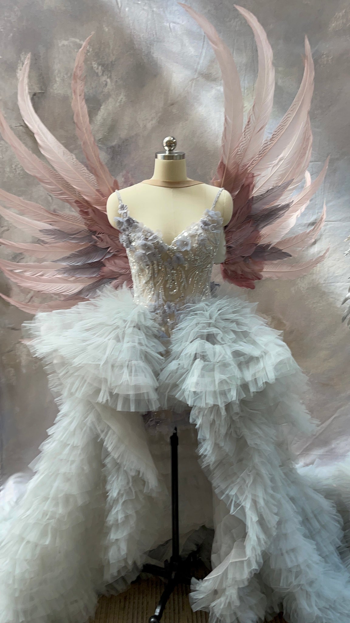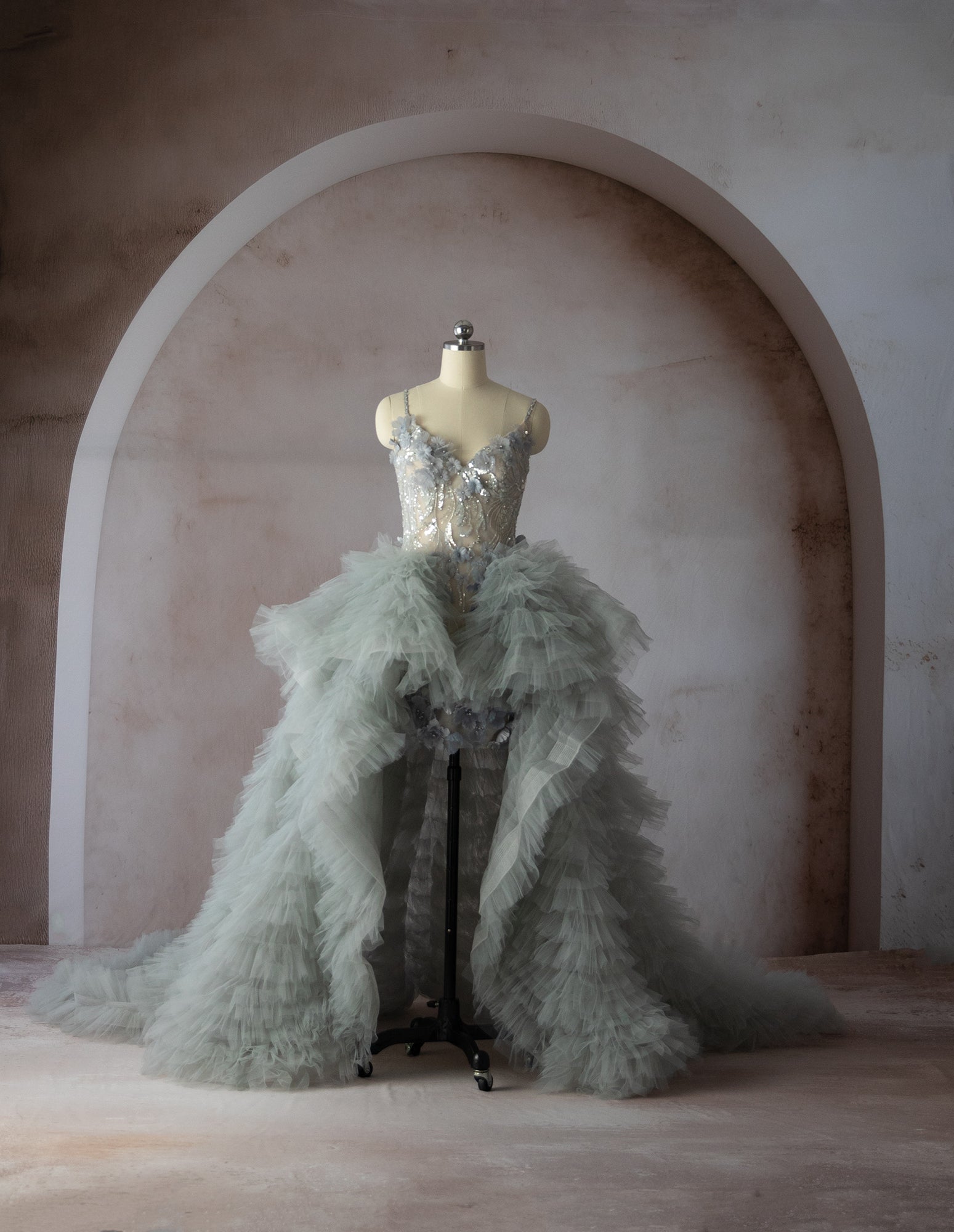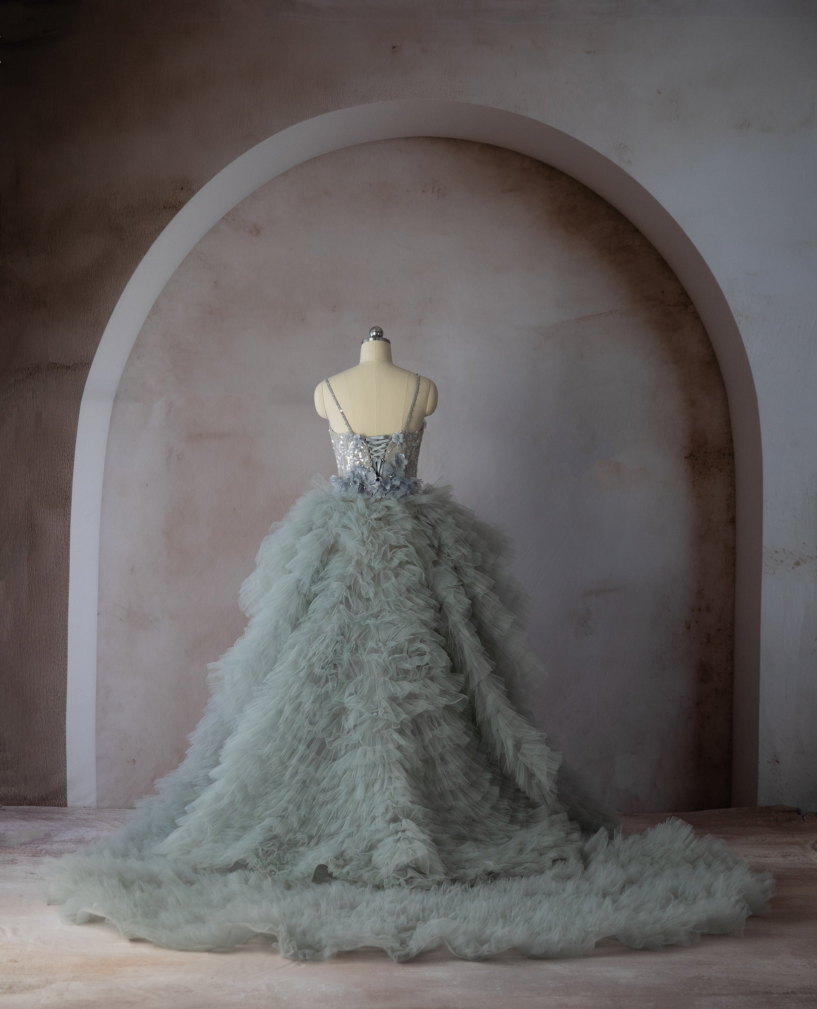 The Gracie Gown is a custom made to order gown. Thin satin straps gown on a short gown with corset closure, Handmade flowers, sequins, several layers of tulle give this gown moderate coverage in the bust and skirt. Features a light blue tulle with ruffles galore. The show stopping feature is the tulle skirt that is removable attached with small clear plastic snaps allowing you to look amazing on the red carpet and then dance the night away.